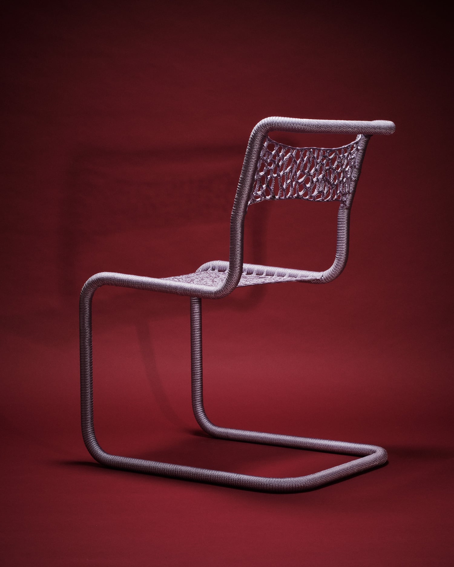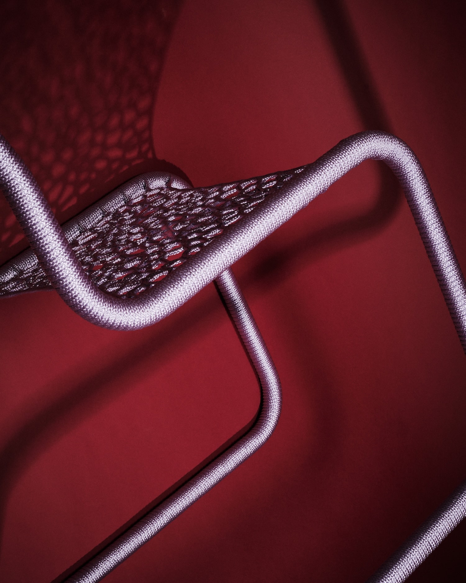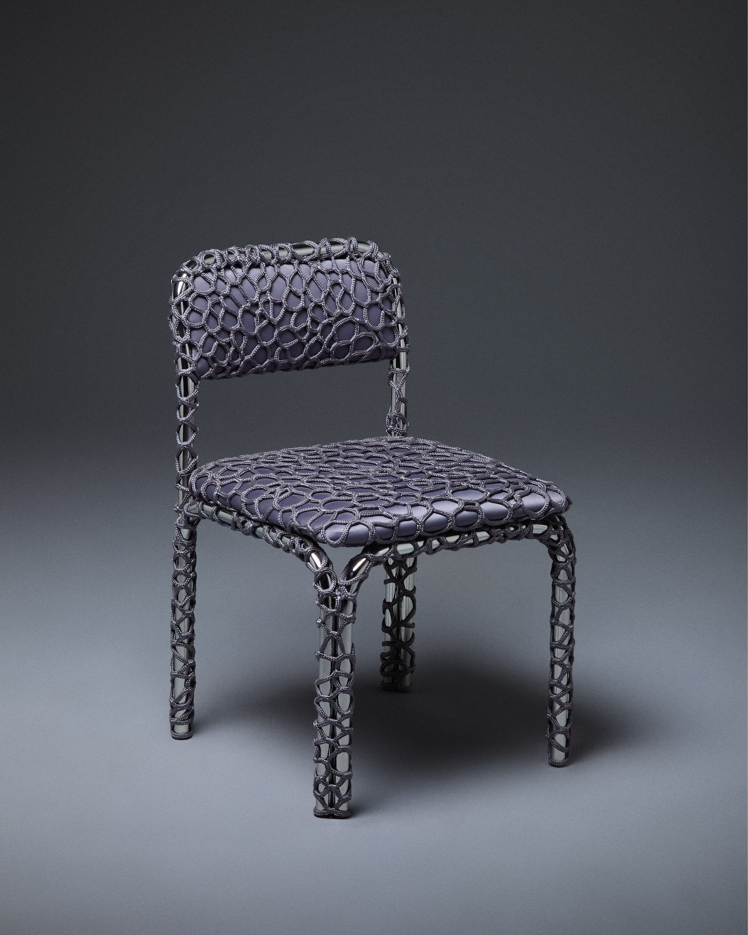 Chaque pièce évolue donc de façon intuitive. La corde, souvent polyester ou synthétique, se pose en tension sur le châssis, créant assise et dossier à partir d’un enchevêtrement de noeuds et de passages. L’absence de patron fixe génère des variations d’une chaise à l’autre : ni série industrielle, ni pièce unique de façon artificielle. La couleur joue un rôle majeur dans l’identification de chaque pièce. Sky Blue, Medium Purple, Aubergine, Midnight Blue, Lilac : la palette choisie pour la collection Take a Seat (2025) installe une légèreté chromatique en contraste direct avec la froideur du chrome.