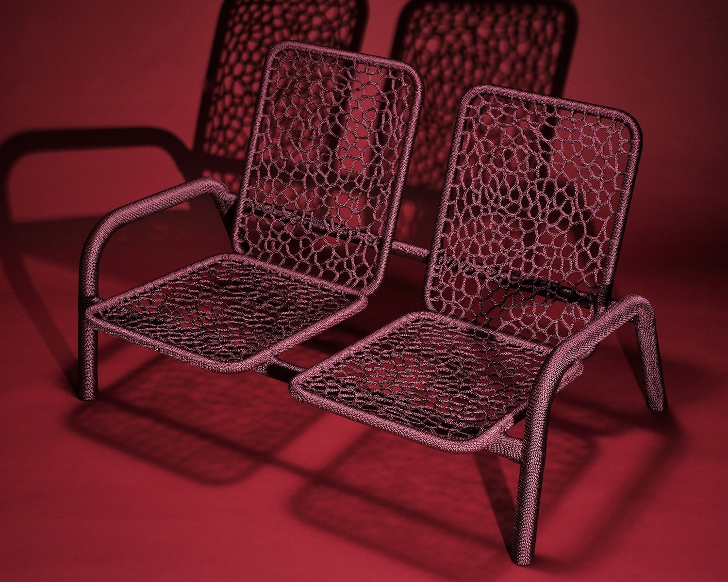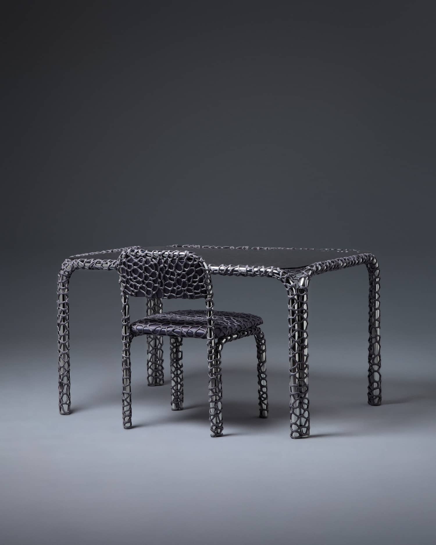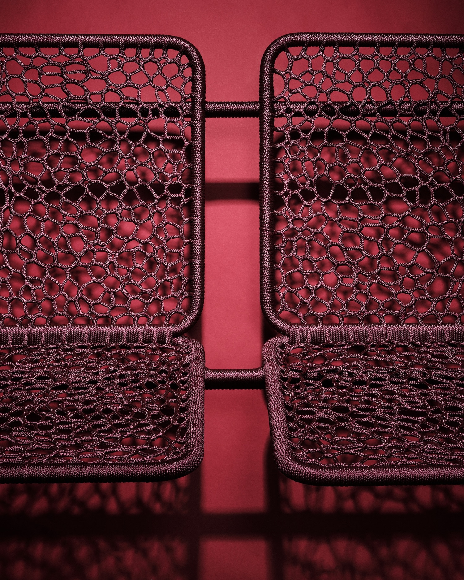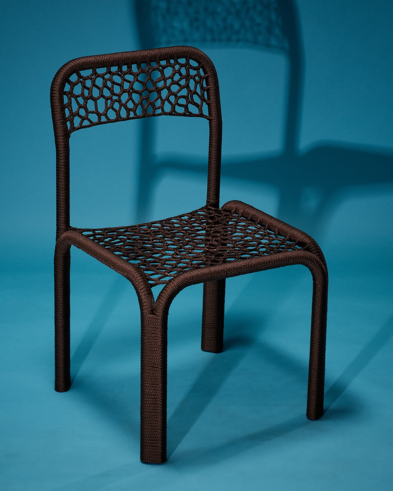 Chaque pièce évolue donc de façon intuitive. La corde, souvent polyester ou synthétique, se pose en tension sur le châssis, créant assise et dossier à partir d’un enchevêtrement de noeuds et de passages. L’absence de patron fixe génère des variations d’une chaise à l’autre : ni série industrielle, ni pièce unique de façon artificielle. La couleur joue un rôle majeur dans l’identification de chaque pièce. Sky Blue, Medium Purple, Aubergine, Midnight Blue, Lilac : la palette choisie pour la collection Take a Seat (2025) installe une légèreté chromatique en contraste direct avec la froideur du chrome.