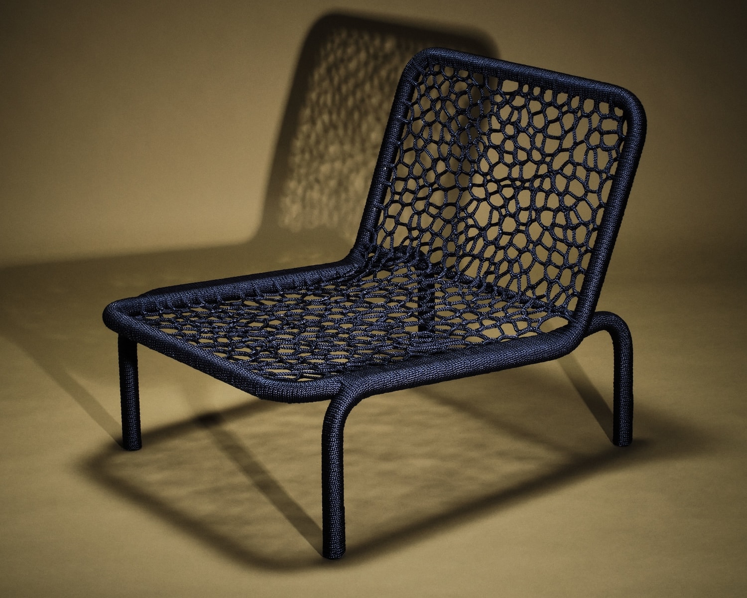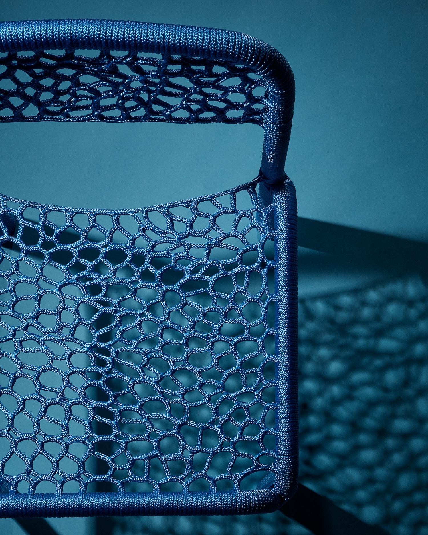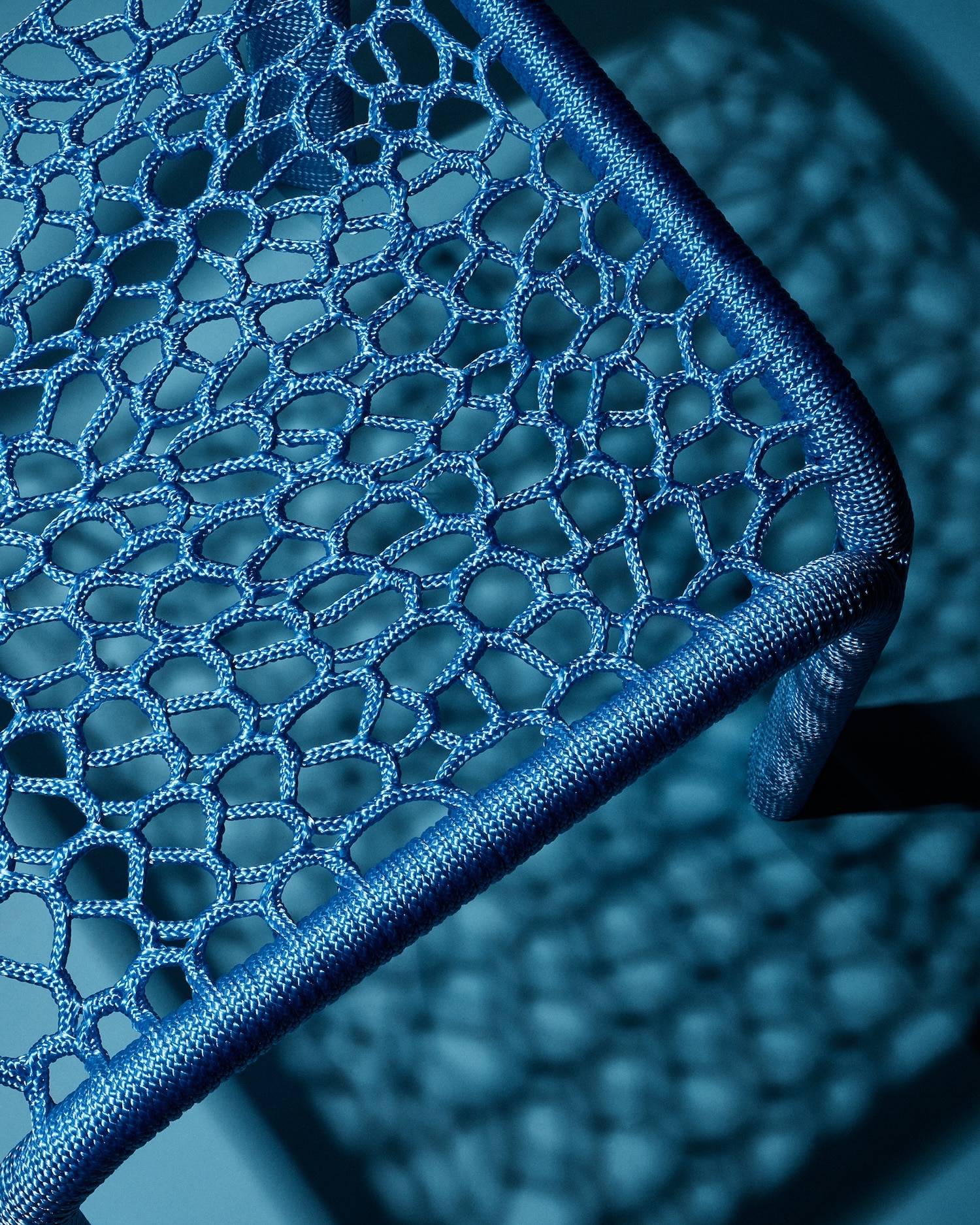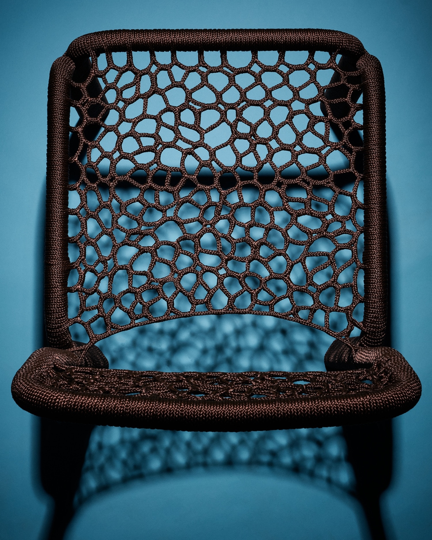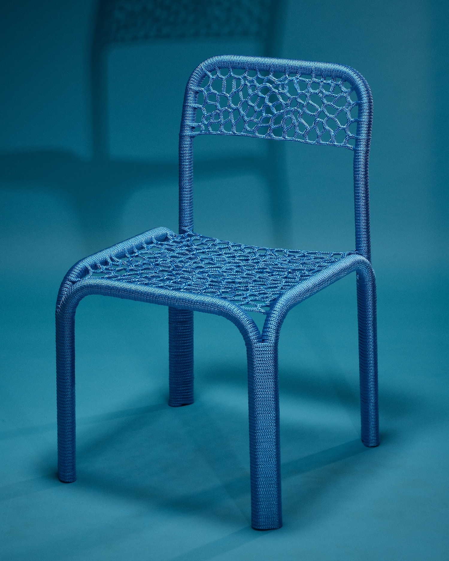 La Rope Chair 02 in Sky Blue, présentée à la Design Biennale Rotterdam en 2025 dans l’exposition « What’s real is unfamiliar », illustre bien la tension formelle recherchée. Le châssis tubulaire chromé, aux arêtes rondes typiques de la production industrielle mid-century, porte un tressage bleu ciel qui adoucit la géométrie sans la cacher. On voit le métal. La corde ne cherche pas à faire oublier l’ossature. L’objet assume sa double nature.