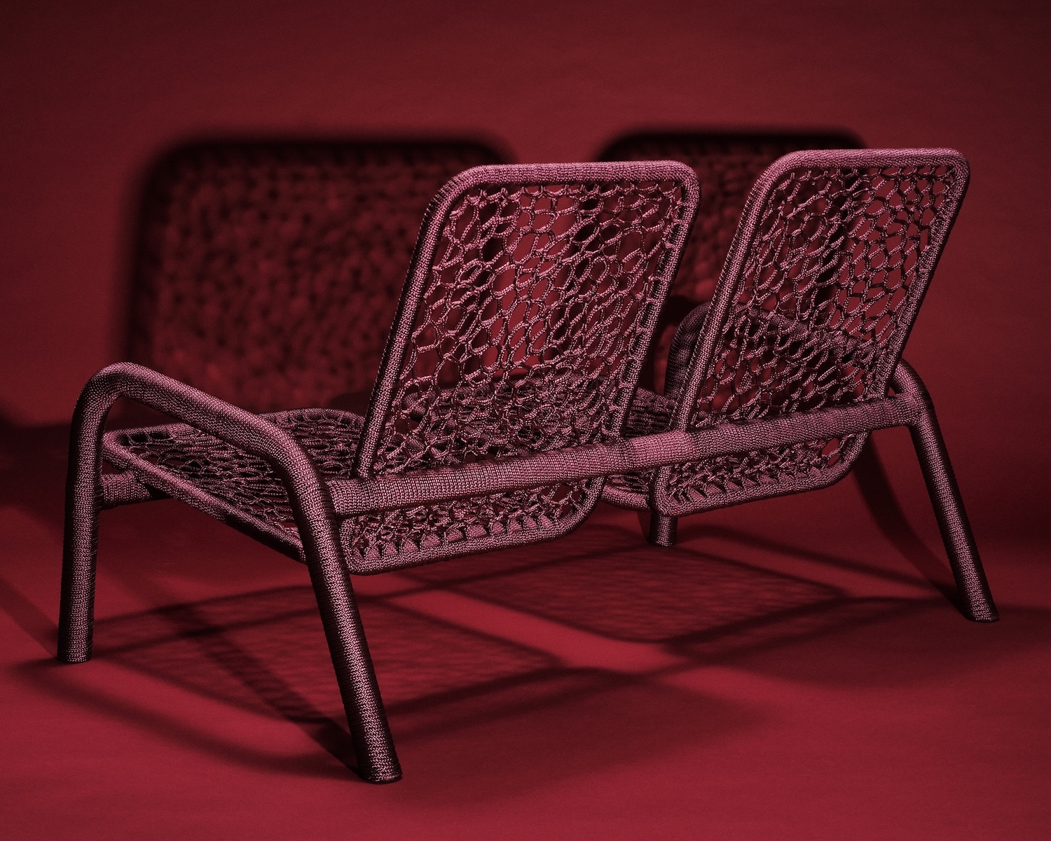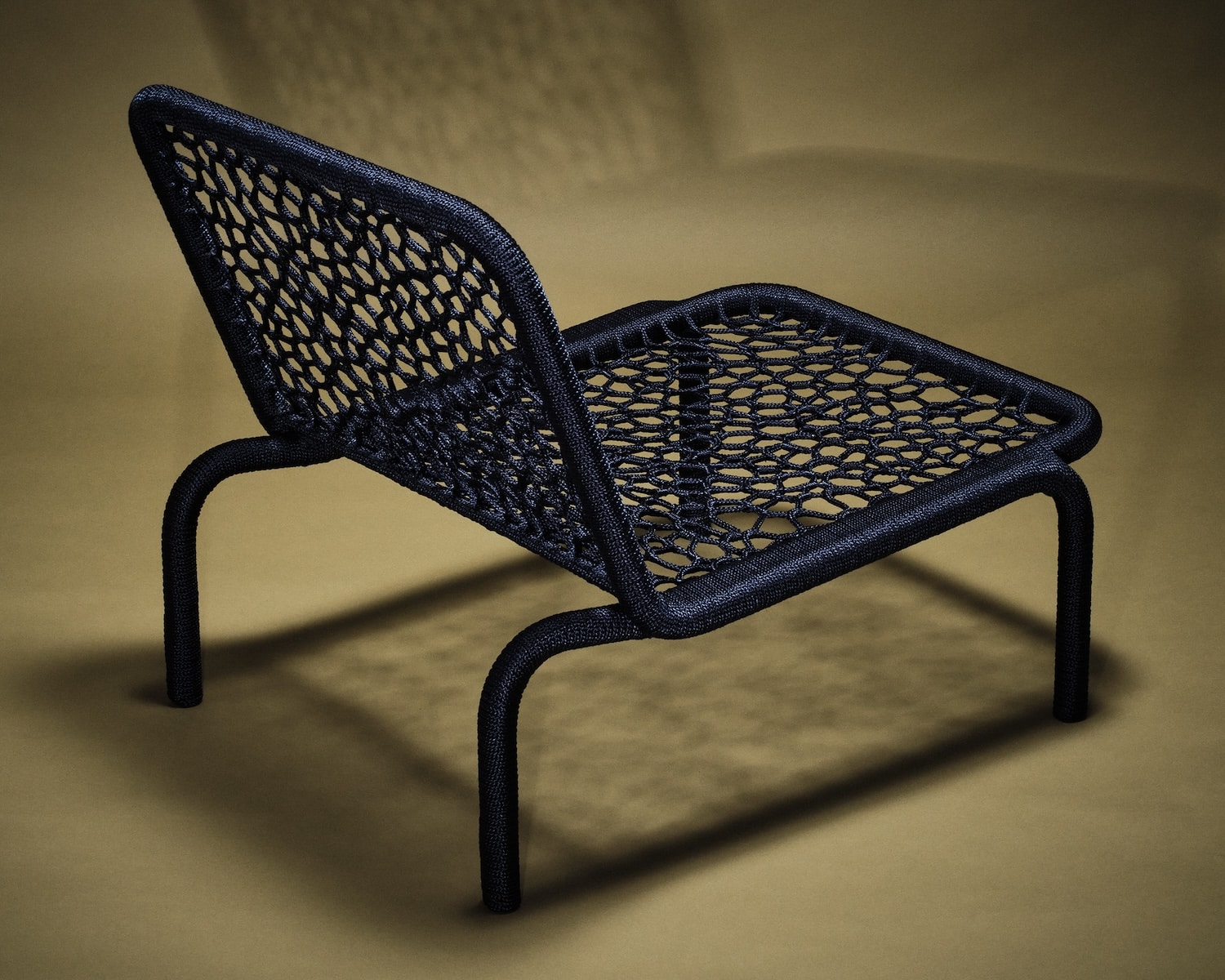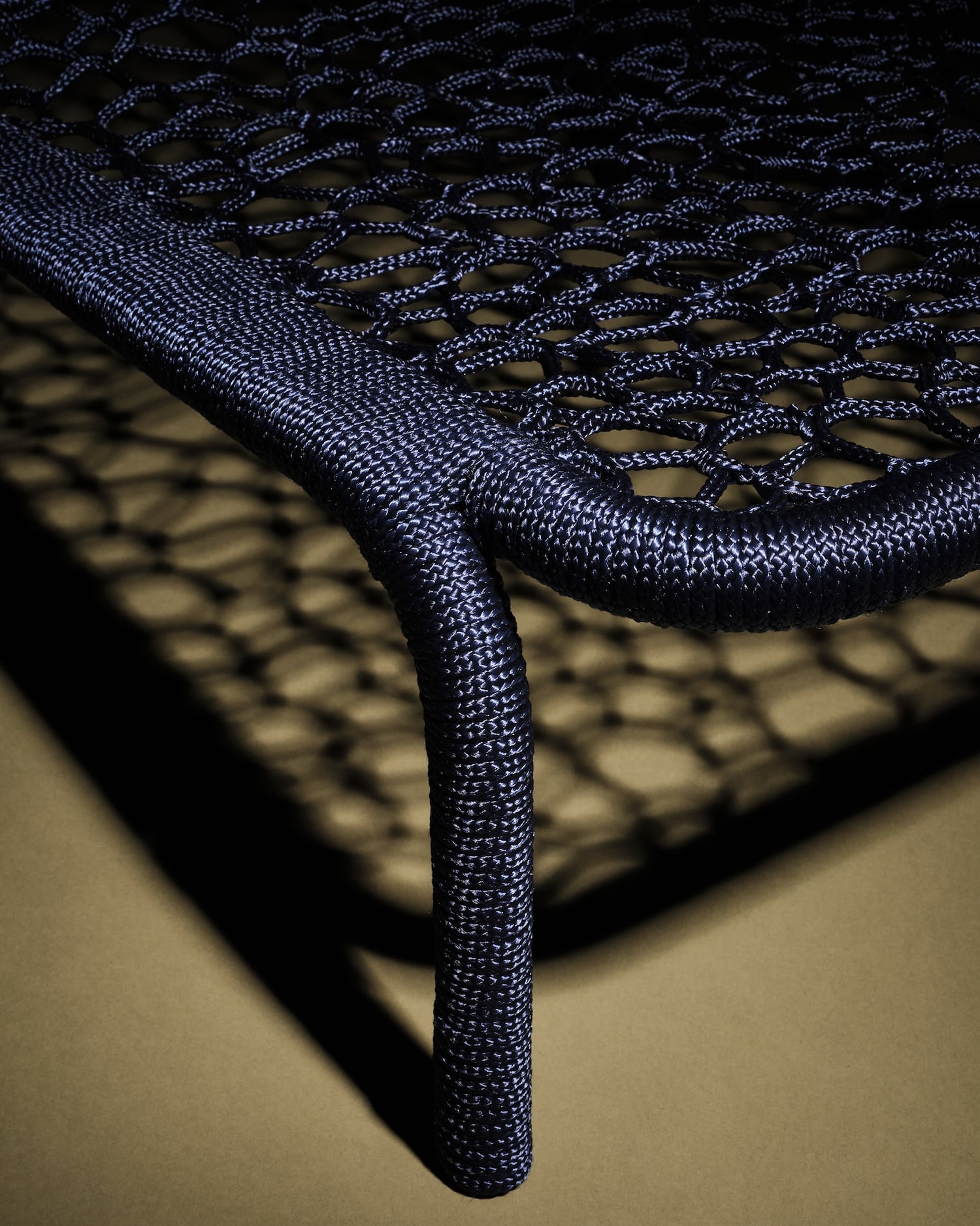Sur ces structures récupérées vient se déposer la corde, tissée sans patron, sans grille, sans gabarit prédéfini. La technique est inspirée des méthodes d’épissure de filets utilisées par les femmes dans les communautés de pêcheurs. Ce n’est pas un clin d’œil décoratif. C’est un transfert de savoir-faire, celui d’un travail souvent invisible, minutieux, pratiqué dans un cadre fonctionnel et utilitaire. Laura Mrksa le déplace vers le mobilier en lui conservant son caractère médiatif.