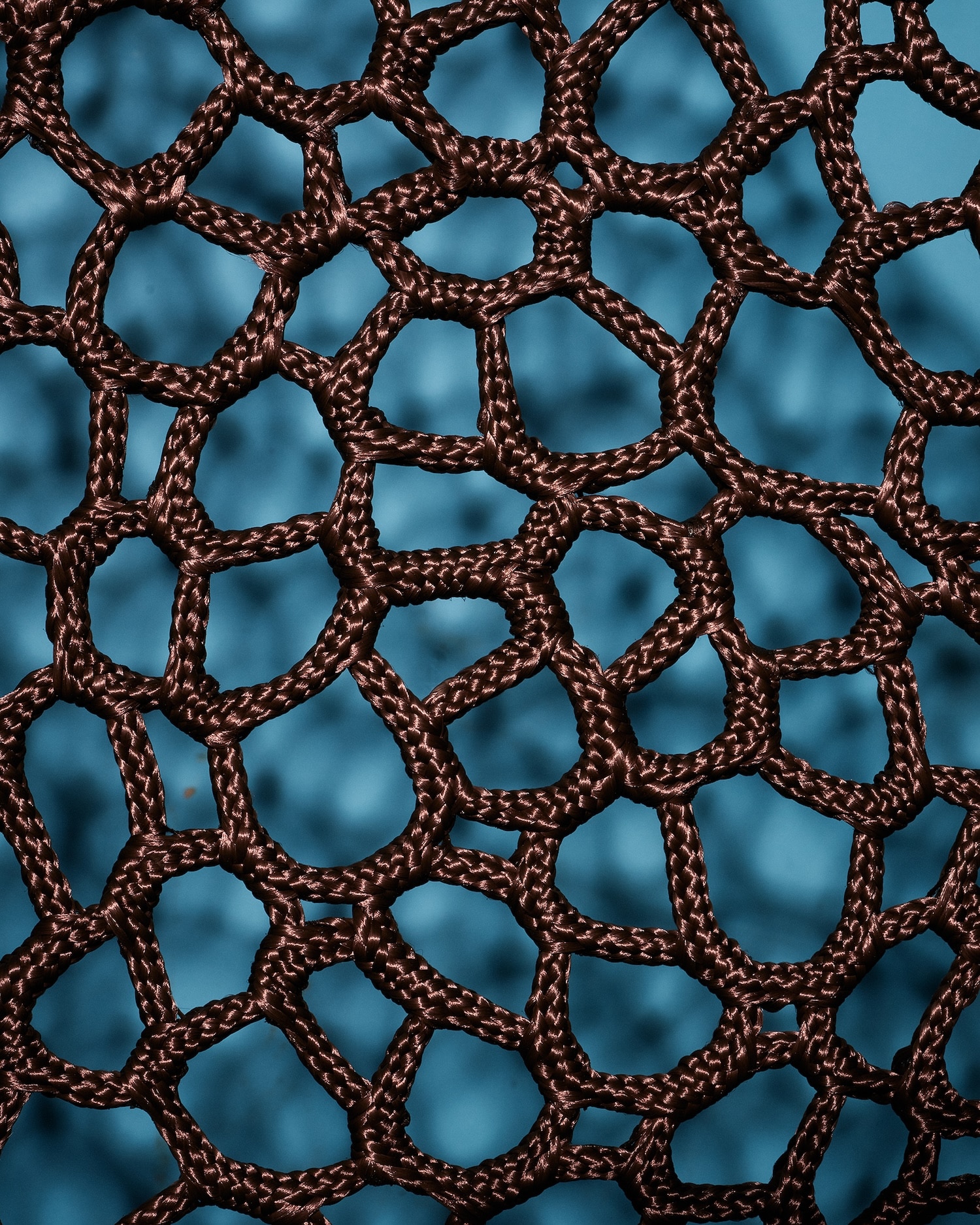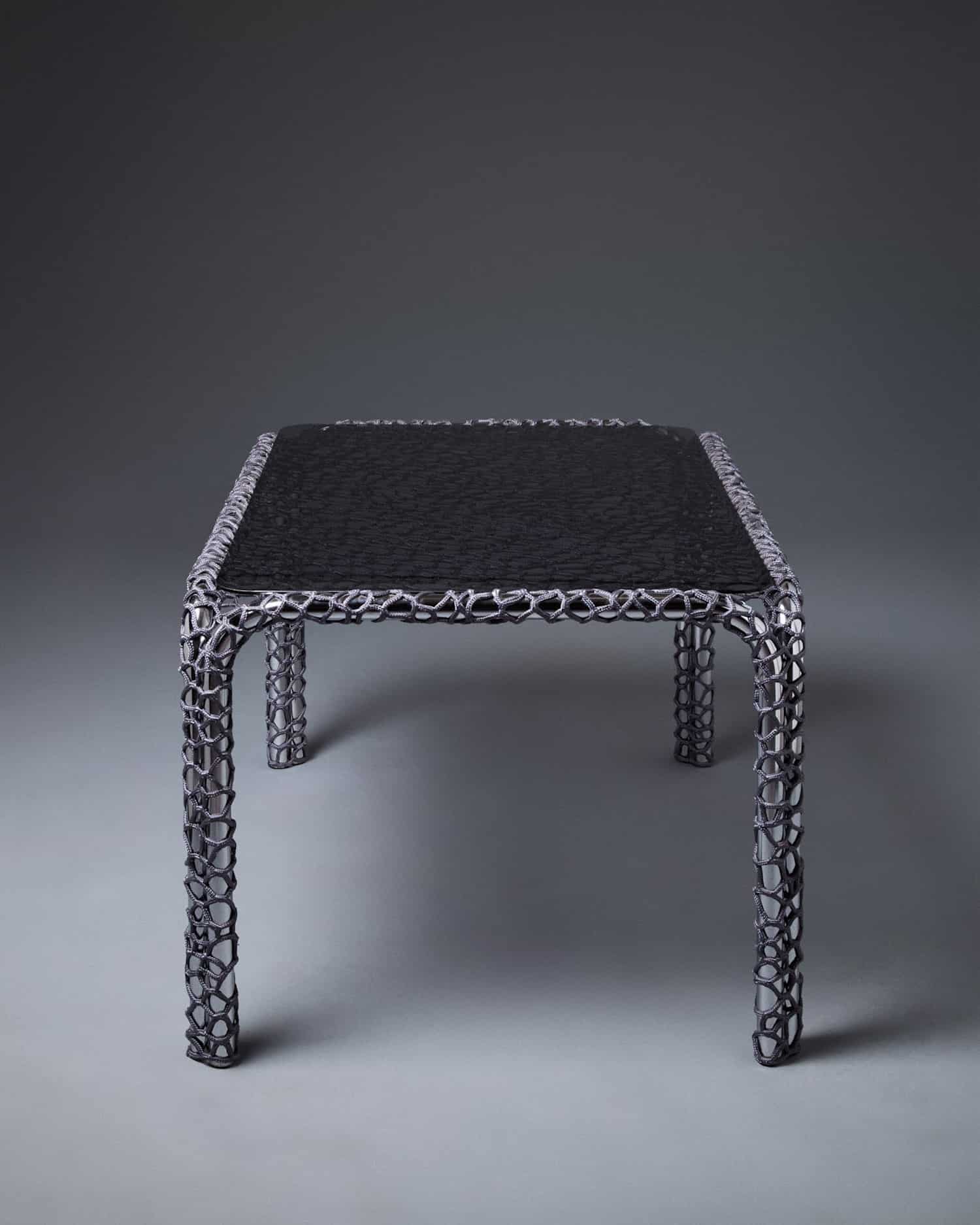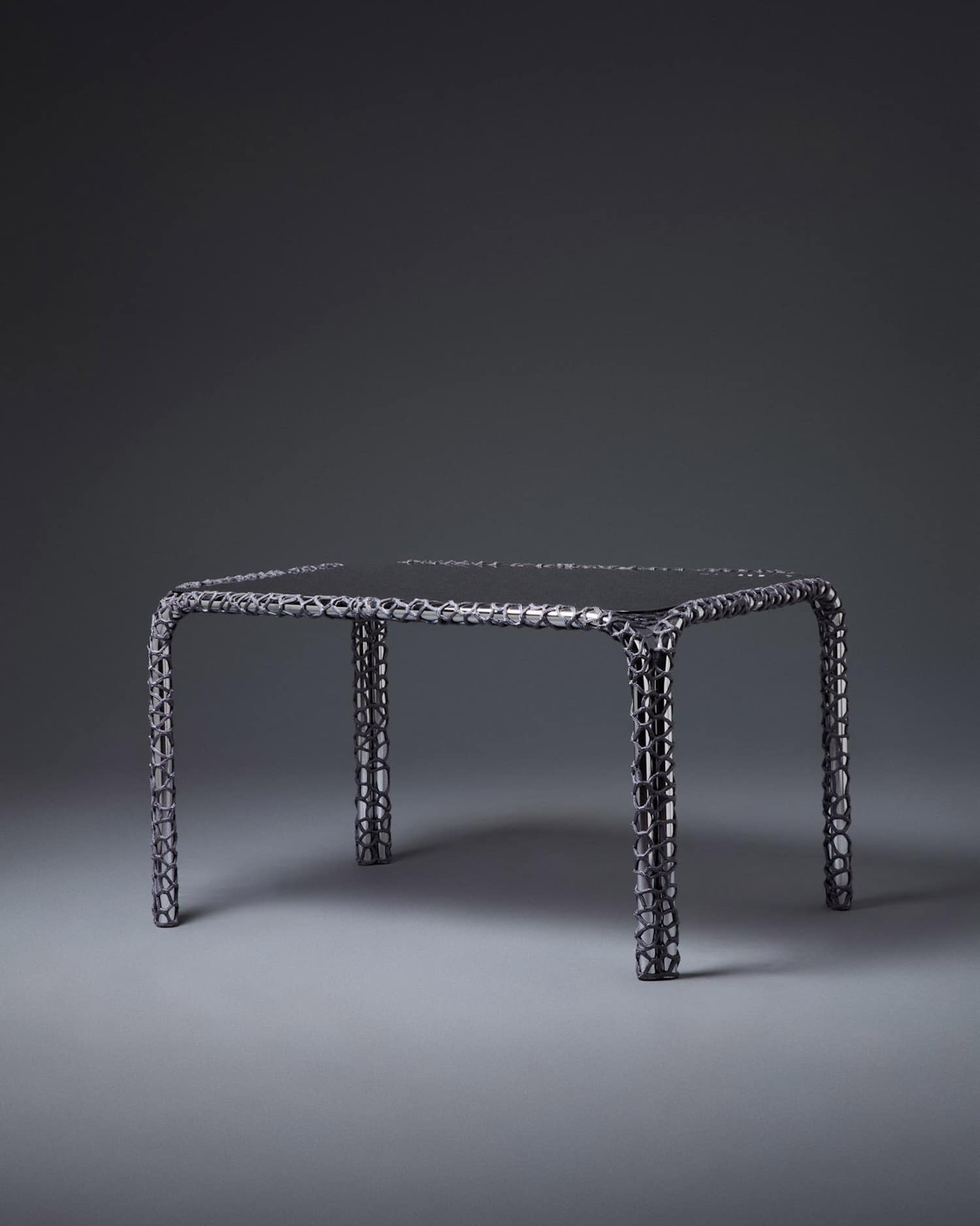 Sur ces structures récupérées vient se déposer la corde, tissée sans patron, sans grille, sans gabarit prédéfini. La technique est inspirée des méthodes d’épissure de filets utilisées par les femmes dans les communautés de pêcheurs. Ce n’est pas un clin d’œil décoratif. C’est un transfert de savoir-faire, celui d’un travail souvent invisible, minutieux, pratiqué dans un cadre fonctionnel et utilitaire. Laura Mrksa le déplace vers le mobilier en lui conservant son caractère médiatif.