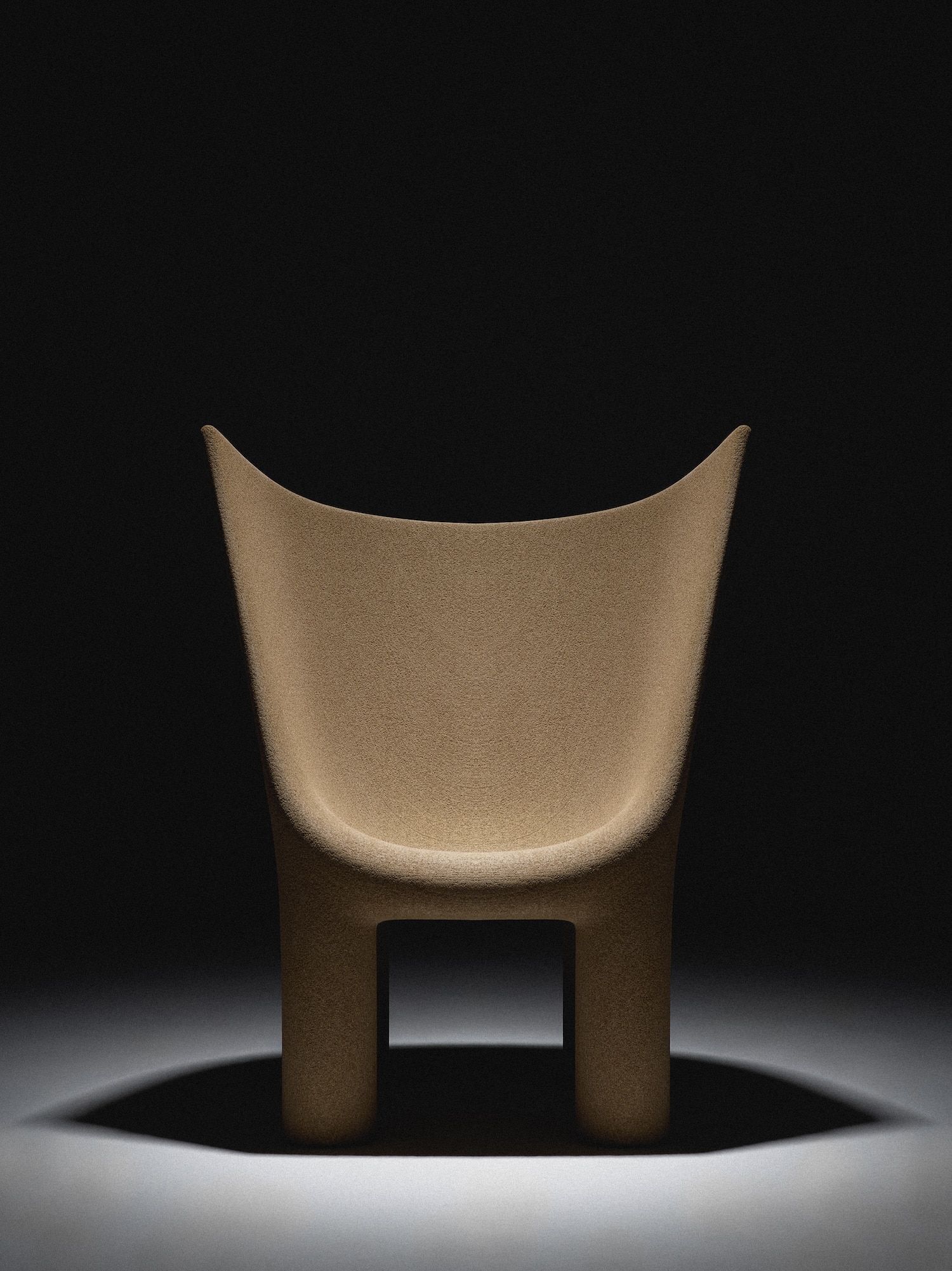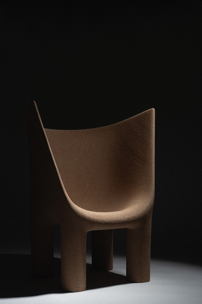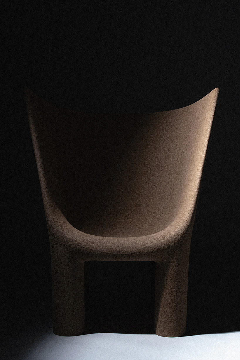 Cette assise offre un large gabarit, ramassée, avec un dossier qui monte haut et s’évase légèrement, la silhouette évoque les sièges cérémoniels de l’Antiquité, ces trônes archaïques en pierre que l’on trouve dans les sanctuaires grecs ou les représentations de pharaons. Renga ne s’en cache pas : le projet dialogue avec des archétypes formels très anciens, réinterprétés à travers un processus résolument contemporain.