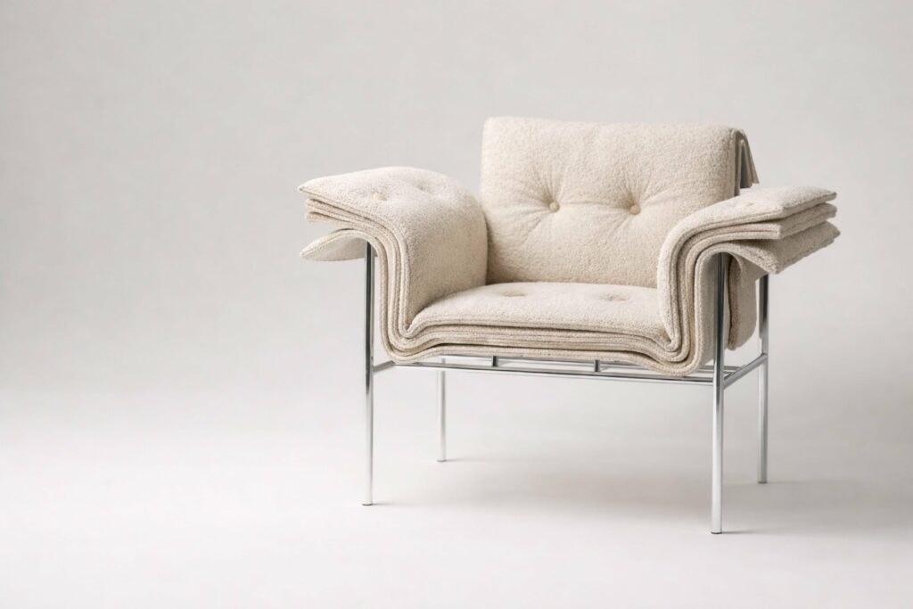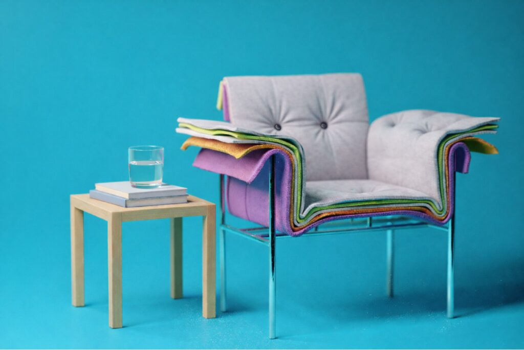 Le projet suggère également des pistes pour une production plus consciente : imaginer des systèmes où les coussins pourraient être remplacés indépendamment, où les combinaisons chromatiques évolueraient au gré des usages et des envies, où la durabilité passerait par la réparabilité et l’évolutivité.