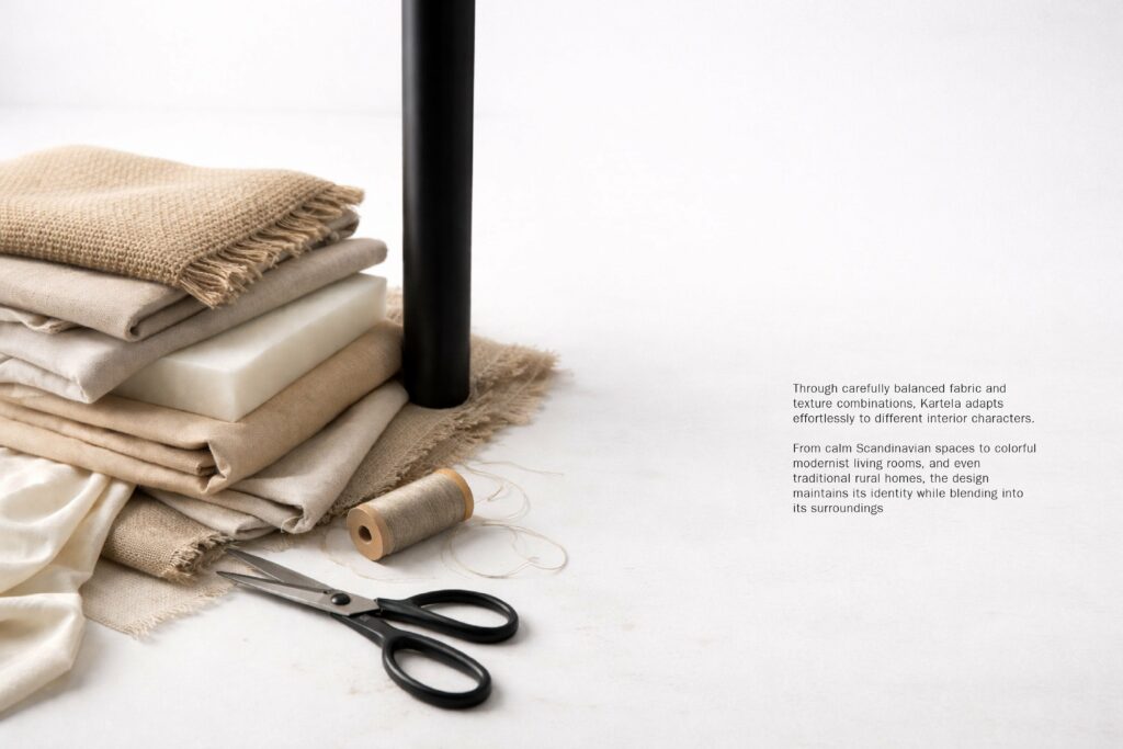 Au-delà de sa dimension fonctionnelle, Kartela interroge notre rapport aux matières et à leur visibilité. En choisissant d’exposer ce qui est habituellement caché, Demirci ne verse pas dans l’esthétique du « making-of » mais propose plutôt une lecture stratigraphique du mobilier. Chaque couche textile raconte une intention, un choix, une nuance.