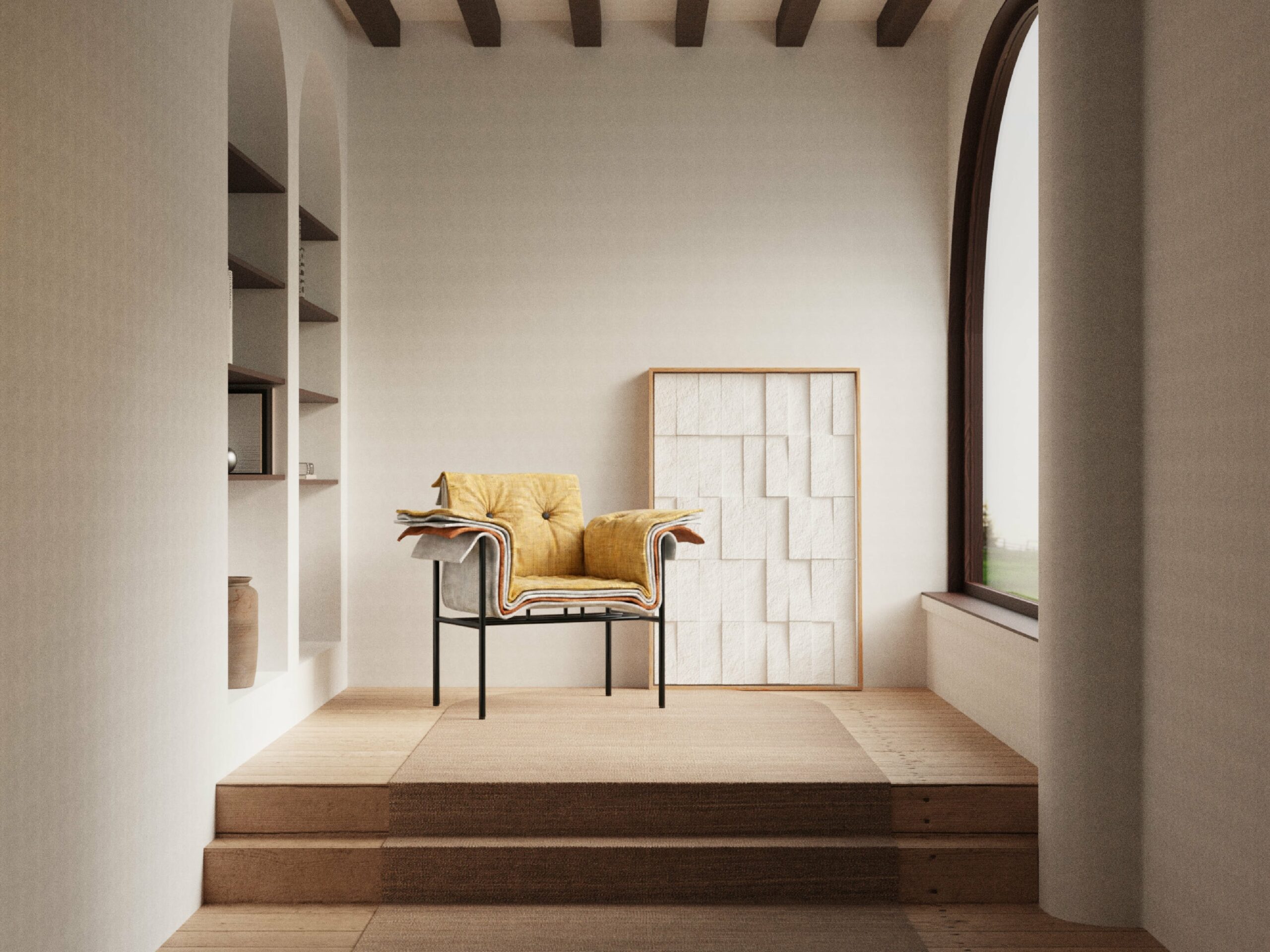 Plutôt que d’en retenir un seul, le jeune designer les superpose, créant une stratification qui évoque autant les carnets de références que les coupes géologiques. La structure métallique, délibérément minimale, s’efface au profit de cette accumulation visible. Les pieds tubulaires en acier thermolaqué, peuvent se décliner en blanc ou en noir. Cette économie de moyens rappelle l’approche de Jimin Lee avec sa collection PONER, où la structure tubulaire métallique accueille différentes configurations textiles selon les préférences de l’utilisateur.