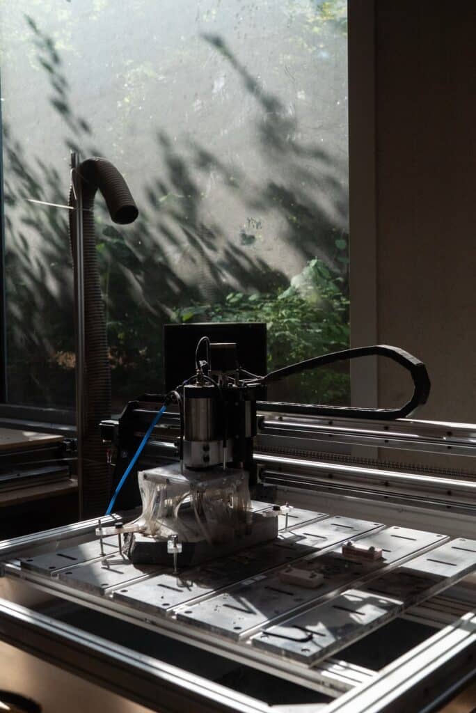 À l’inverse, certains gisements sont plus constants, comme la pierre bleue issue de carrières belges, extraite dans le sud du pays. Une matière fascinante mais exigeante. Pour la transformer en luminaire, Duplex s’appuie sur des machines à commande numérique open source, développées avec son voisin Mekanika : On a hacké une machine pour pouvoir usiner la pierre grâce à un jet d’eau qui vient refroidir la mèche. C’est l’avantage de travailler avec de l’open source, on peut vraiment adapter nos machines.