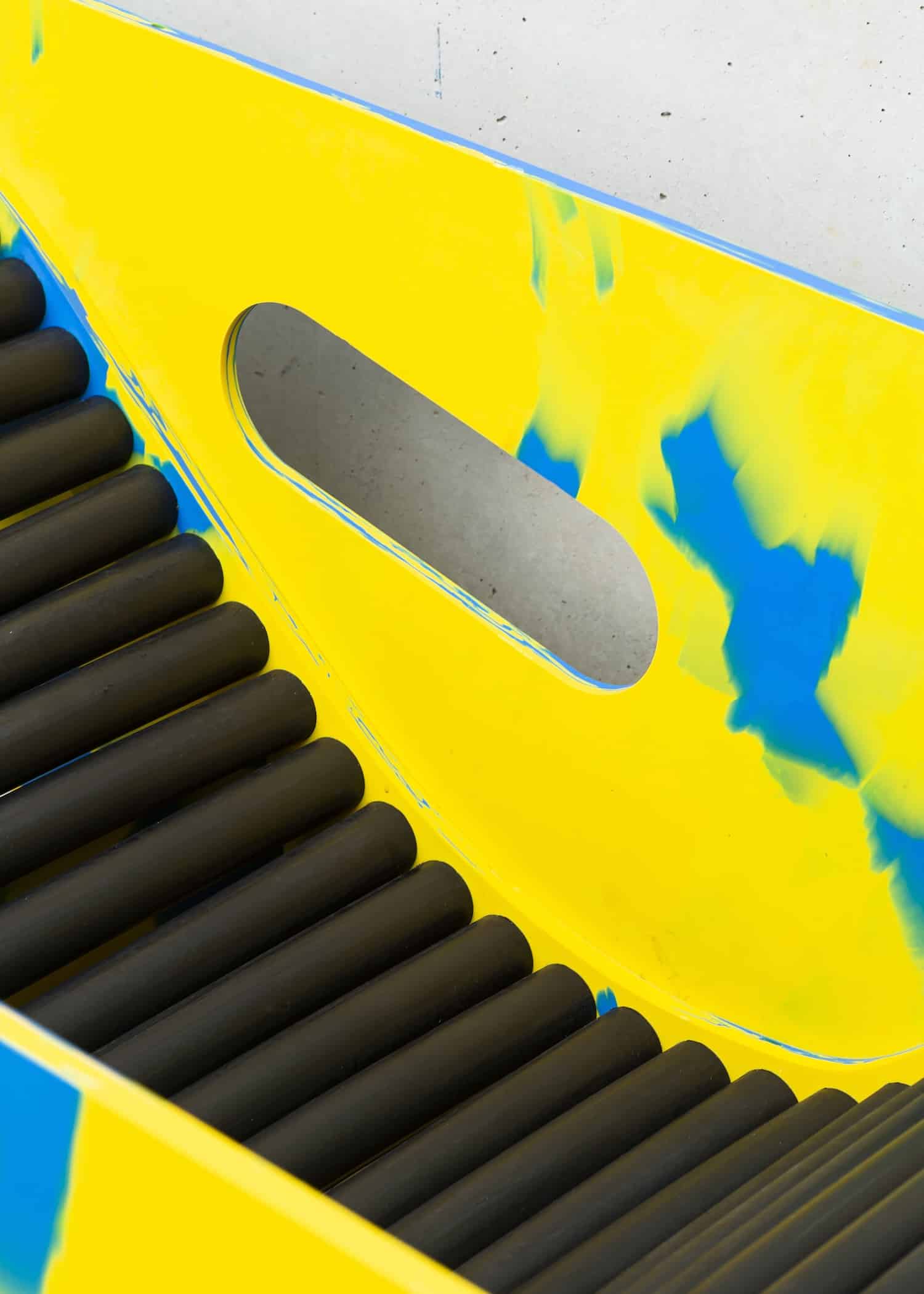 - Les assises sont constituées de tubes en PEA récupérés dans un centre de tri. Cintrés à la vapeur grâce à une simple cocotte-minute, ils incarnent parfaitement le savoir-faire de Cintrage Vapeur, structure fondée par les deux designers.