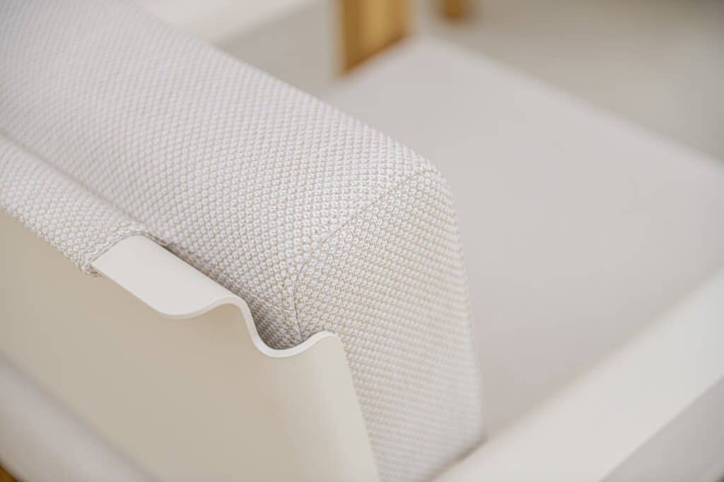 Au-delà de l’esthétique, le fauteuil Piano Piano affiche une ambition claire : offrir un confort équivalent à celui d’une assise intérieure. Pour y parvenir, Belveo a développé des coussins dotés d’une mousse « Haute Résilience » qui ne se tasse pas avec le temps. Le système de coussin repose sur une technologie de mousse à cellules ouvertes, non absorbante, qui laisse l’eau traverser plutôt que de s’en imbiber. Le tissu en oléfine, déperlant, complète ce dispositif : l’eau glisse à la surface, permettant un séchage rapide après une averse.