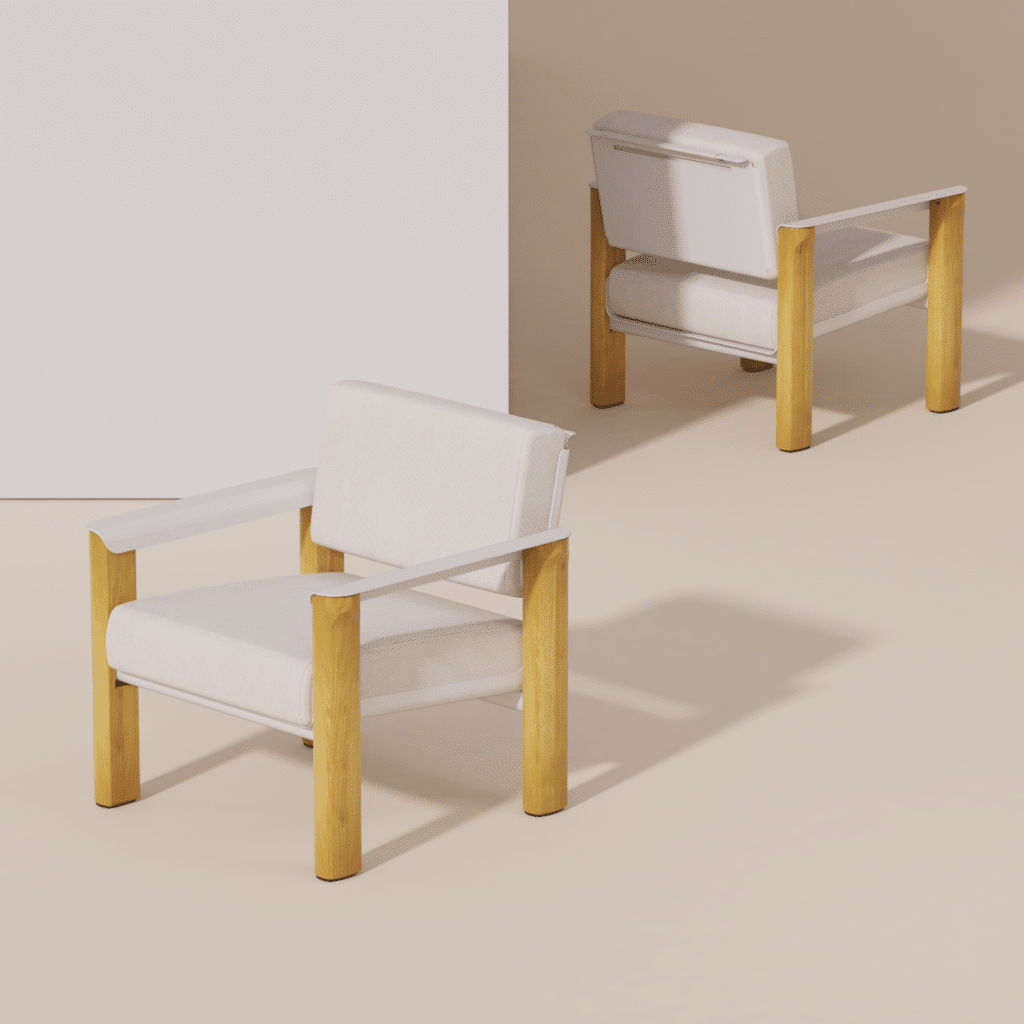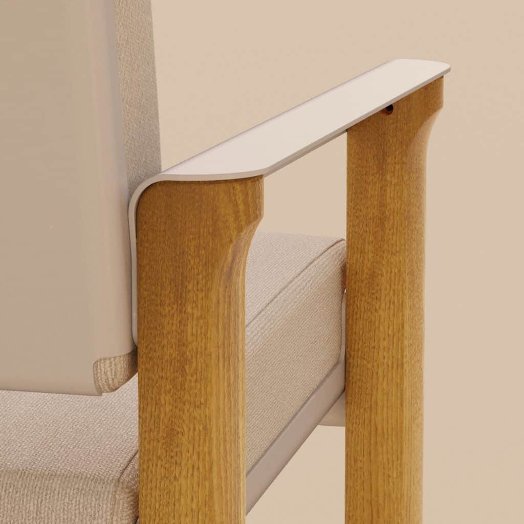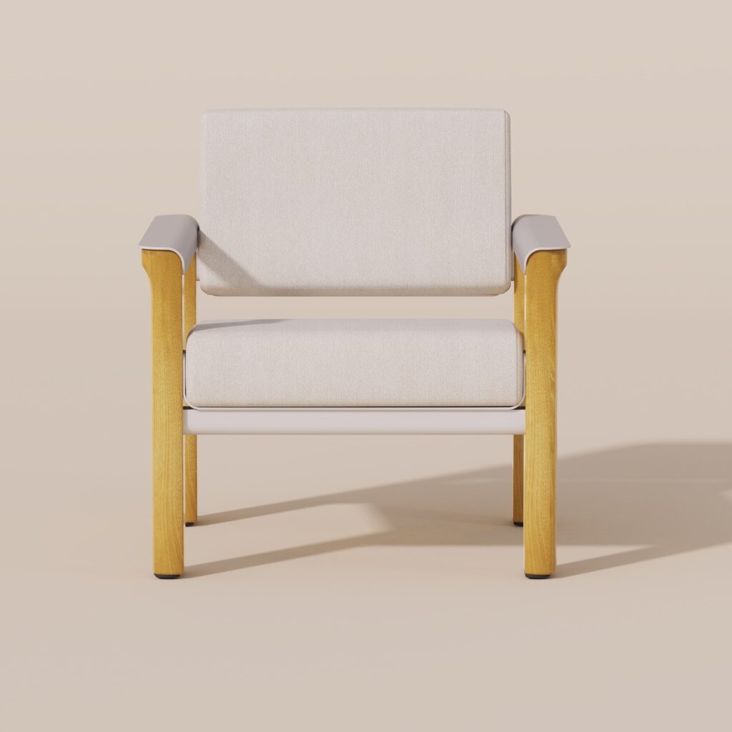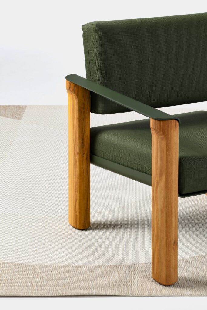 Le fauteuil se reconnaît immédiatement à ses accoudoirs aux courbes caractéristiques, ils ne sont pas de simples appendices fonctionnels, mais participent pleinement à l’identité visuelle du projet. En aluminium courbé, ils dessinent une ligne élégante qui contraste avec la verticalité des pieds en robinier. Cette attention portée à la forme rappelle certains travaux où la courbe devient langage, comme le récent projet Cresta par Andrea Ponti, qui sculpte les rythmes de la mer dans le mobilier.