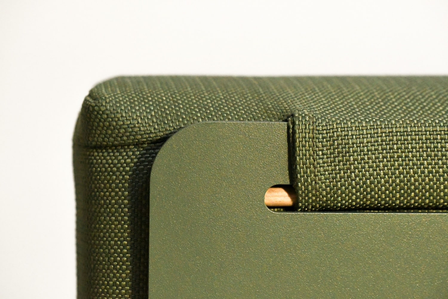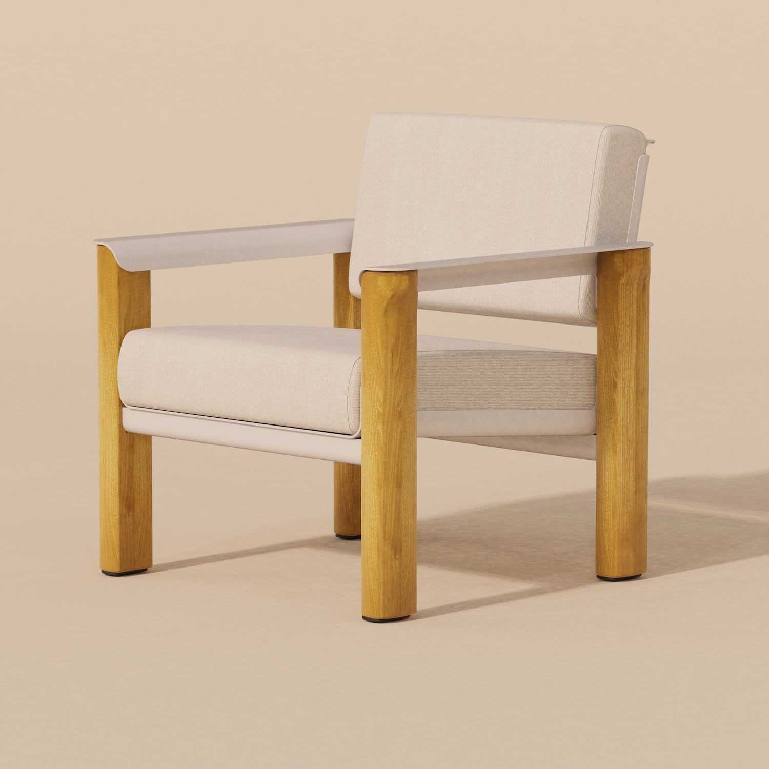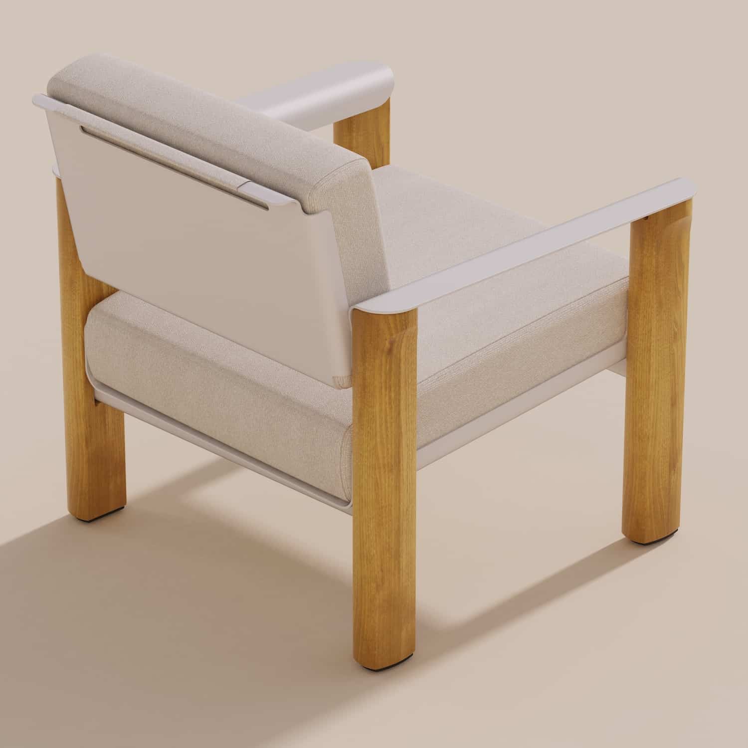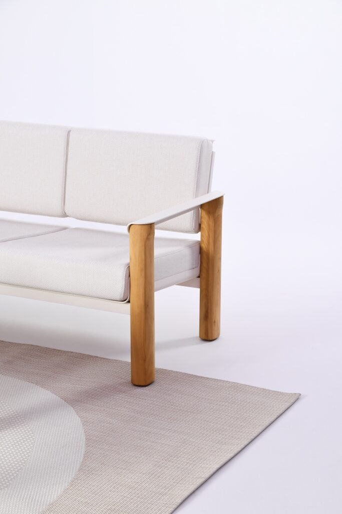 Le fauteuil se reconnaît immédiatement à ses accoudoirs aux courbes caractéristiques, ils ne sont pas de simples appendices fonctionnels, mais participent pleinement à l’identité visuelle du projet. En aluminium courbé, ils dessinent une ligne élégante qui contraste avec la verticalité des pieds en robinier. Cette attention portée à la forme rappelle certains travaux où la courbe devient langage, comme le récent projet Cresta par Andrea Ponti, qui sculpte les rythmes de la mer dans le mobilier.