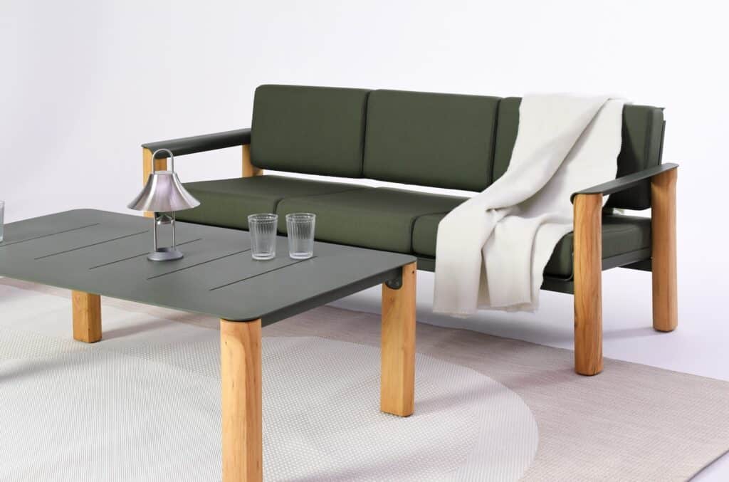 La première lecture du fauteuil Piano Piano révèle une composition harmonieuse : l’aluminium et le bois massif se répondent sans se contraindre. Le designer a fait le choix du robinier, essence européenne certifiée FSC-PEFC, provenant des forêts slovènes. Souvent désigné comme « le teck de l’Europe« , ce bois massif possède une résistance naturelle à l’humidité qui le rend particulièrement adapté aux usages extérieurs. À ne pas confondre avec l’acacia, moins résistant, le robinier se distingue par sa capacité à traverser les saisons sans traitement chimique lourd.
