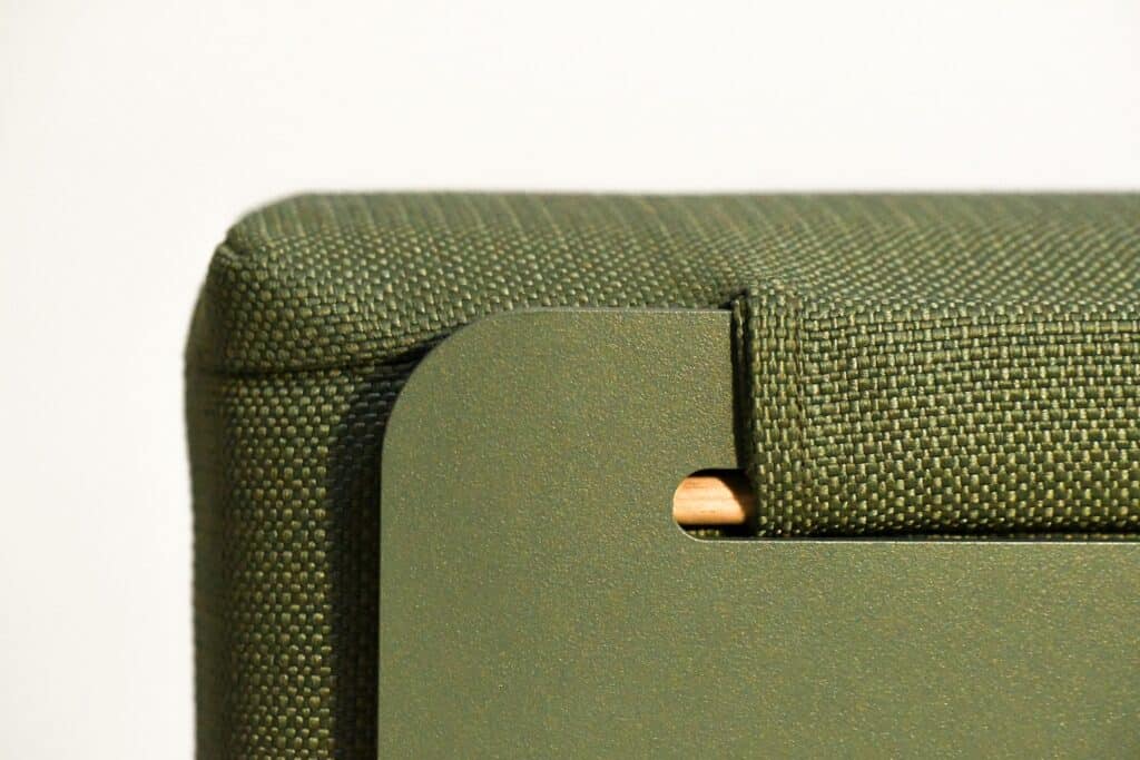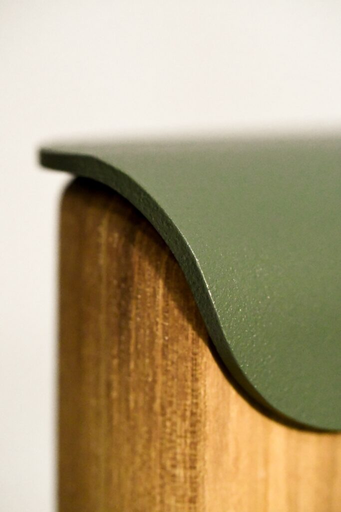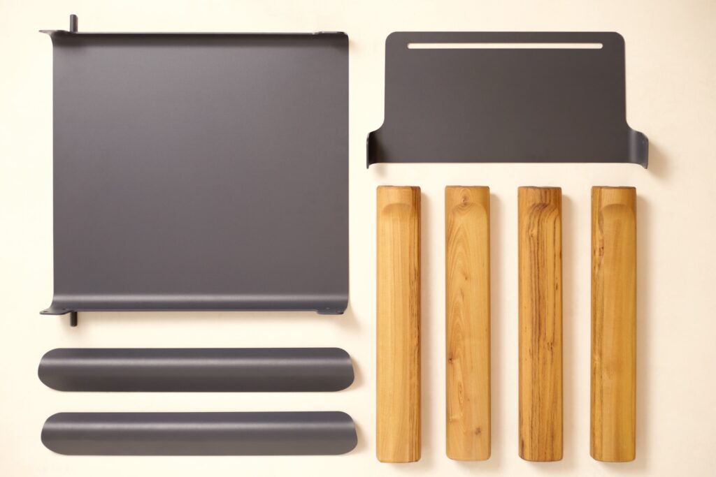 L’aluminium, quant à lui, n’est pas choisi au hasard. Belveo a opté pour une série 5, reconnue pour ses qualités exceptionnelles de résistance à la corrosion. Les tôles, d’une épaisseur de 4mm, sont laminées avant découpe laser et cintrage, un processus qui densifie le métal et le rend plus résistant. On retrouve ici une approche qui n’est pas sans évoquer d’autres projets combinant bois et métal, comme la chaise Kobuz par Wo Mierzwa, où le bois structure et le métal enveloppe. (projet présenté en 2015, le temps passe si vite..)