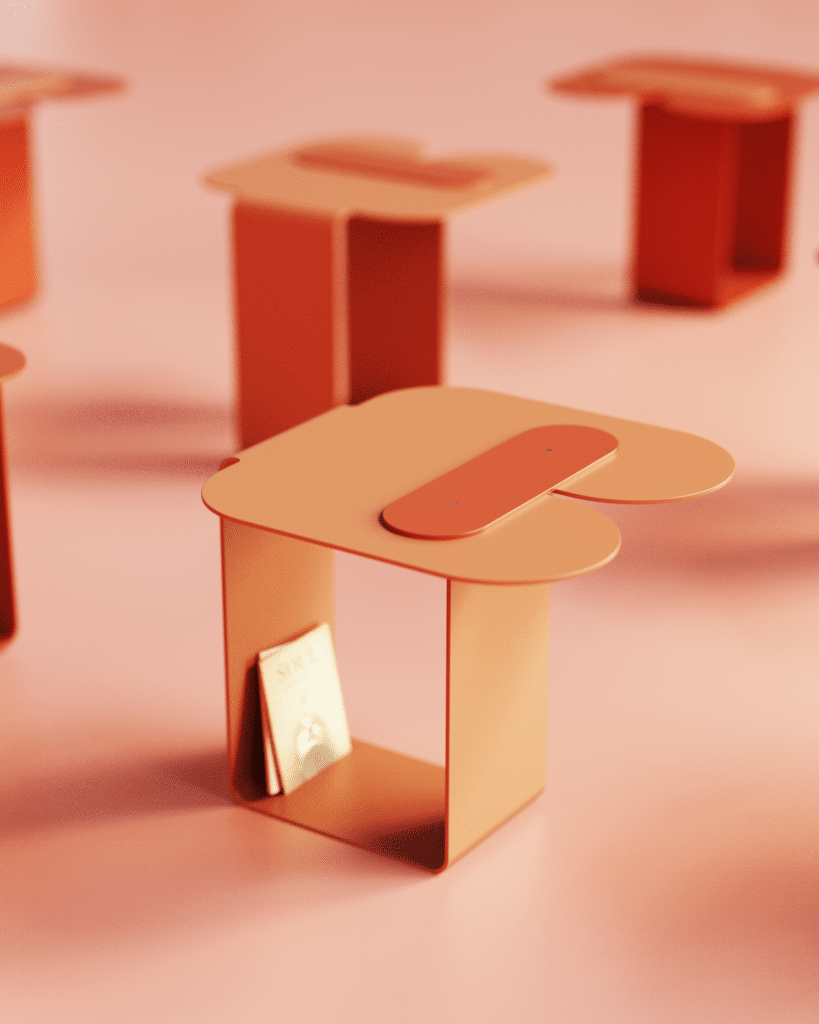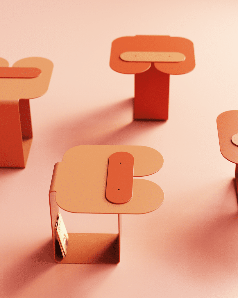 Ce qui unit les différentes pièces de Furniture et information, c’est cette volonté de réconcilier le geste artisanal avec les contraintes de production contemporaine. Le métal, loin d’être perçu comme un matériau figé, devient une surface à interpréter, à plier, à perforer, à teinter. Associé au bois, il gagne en chaleur visuelle et en richesse de texture.
