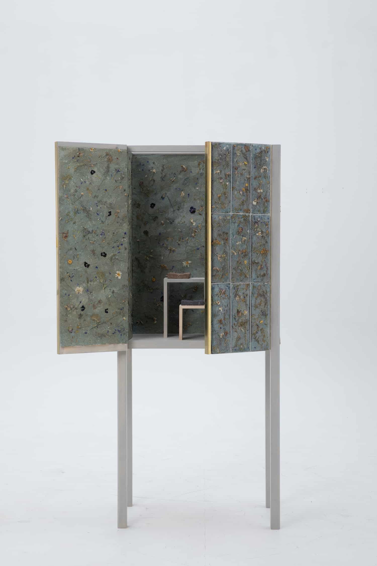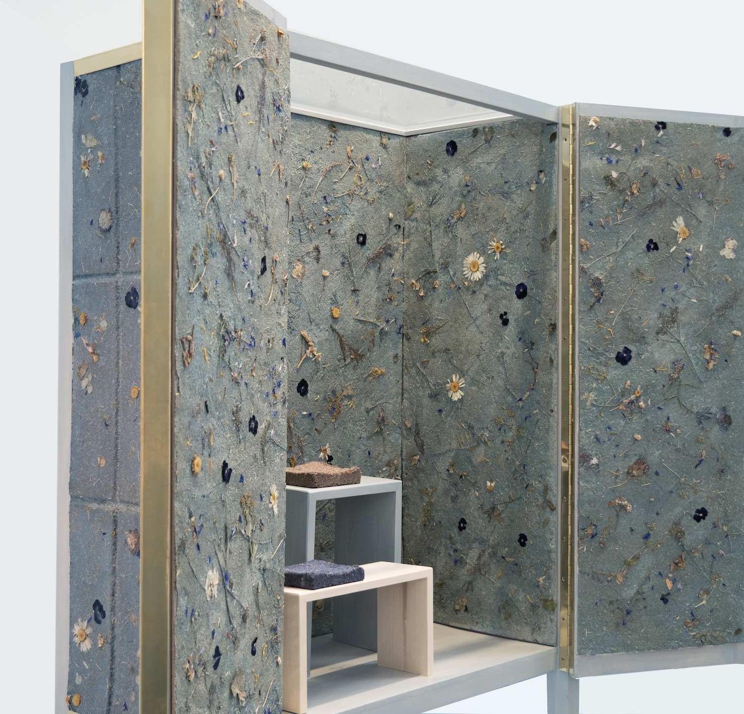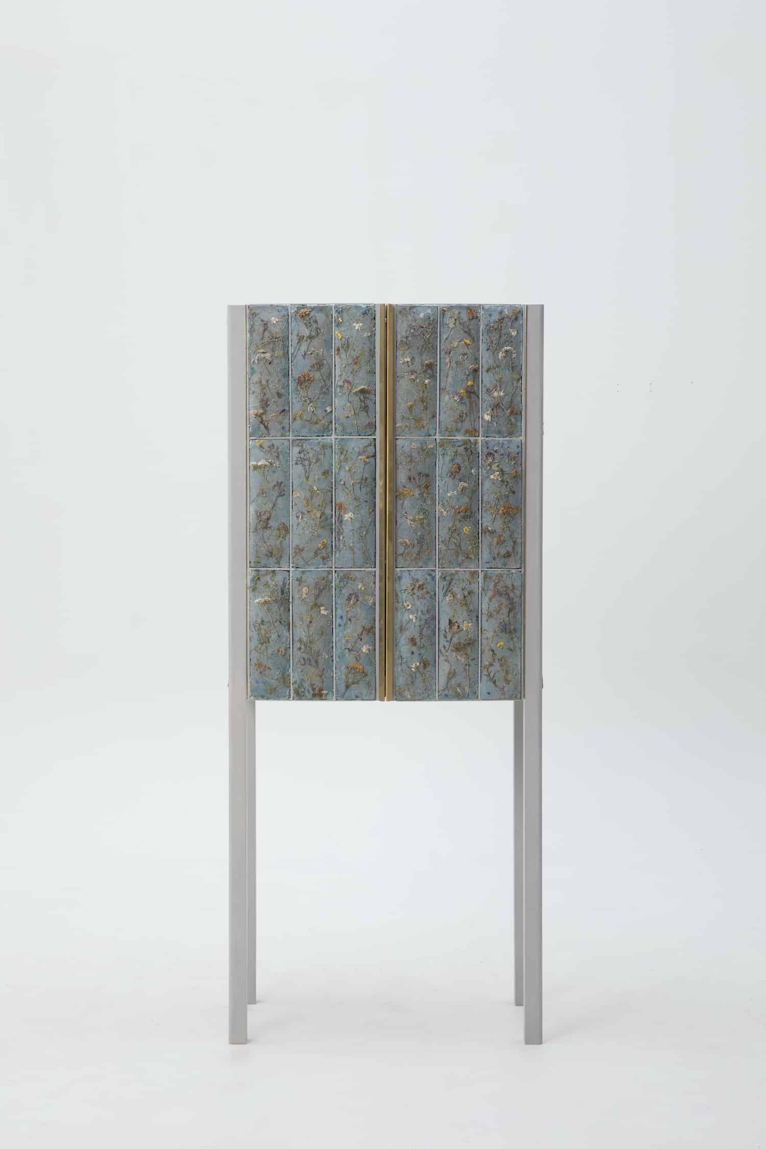 Anne Ländle formule une proposition que Green Edge rend tangible : et si les meubles n’étaient pas seulement fabriqués, mais cultivés ? Enracinés dans un lieu, dans un paysage, dans une saison. La matière qui compose le cabinet est littéralement prélevée dans l’environnement immédiat de la designer, transformée selon un protocole qu’elle a mis au point, puis restituée sous forme d’objet domestique habité par ces fragments de nature.