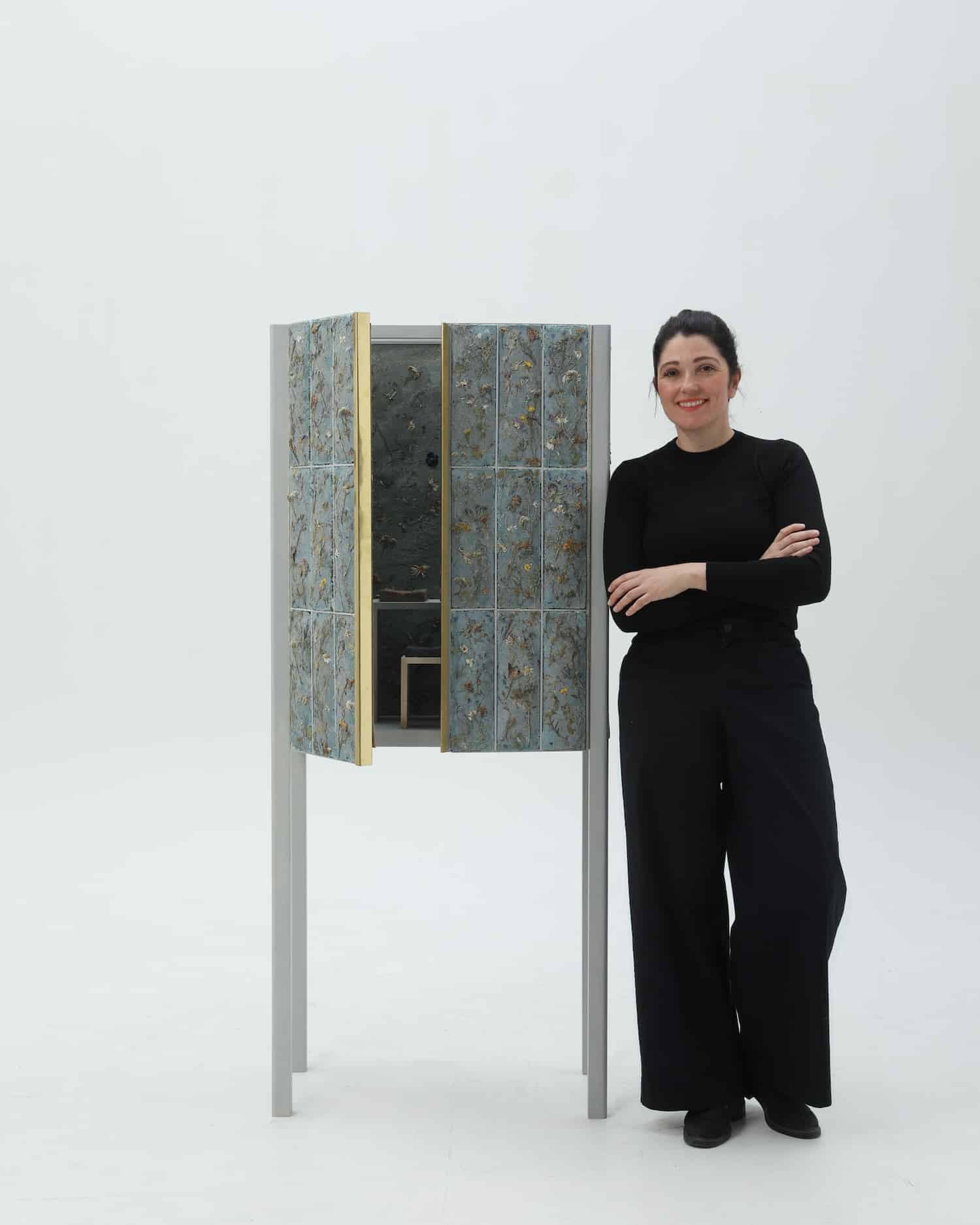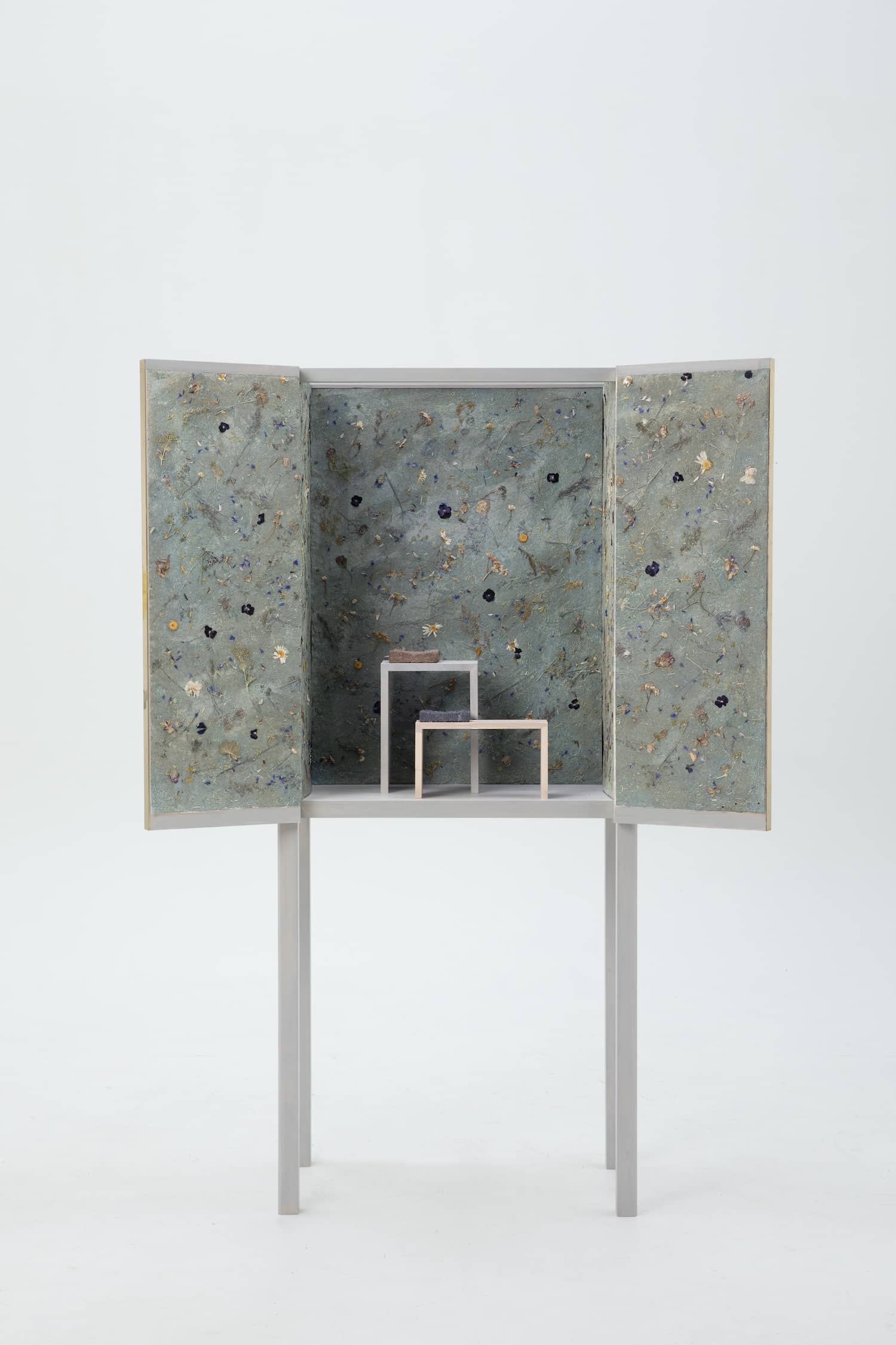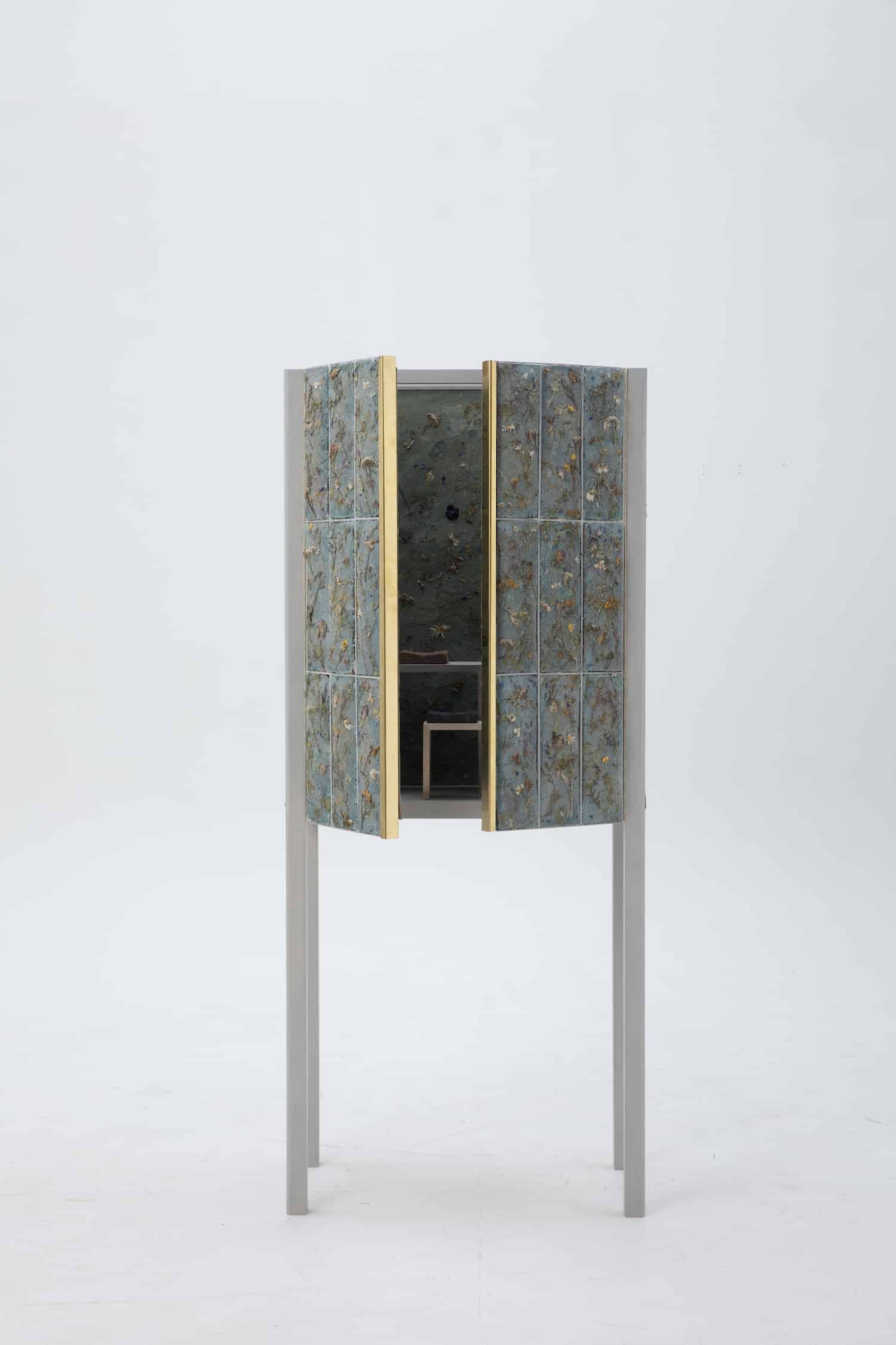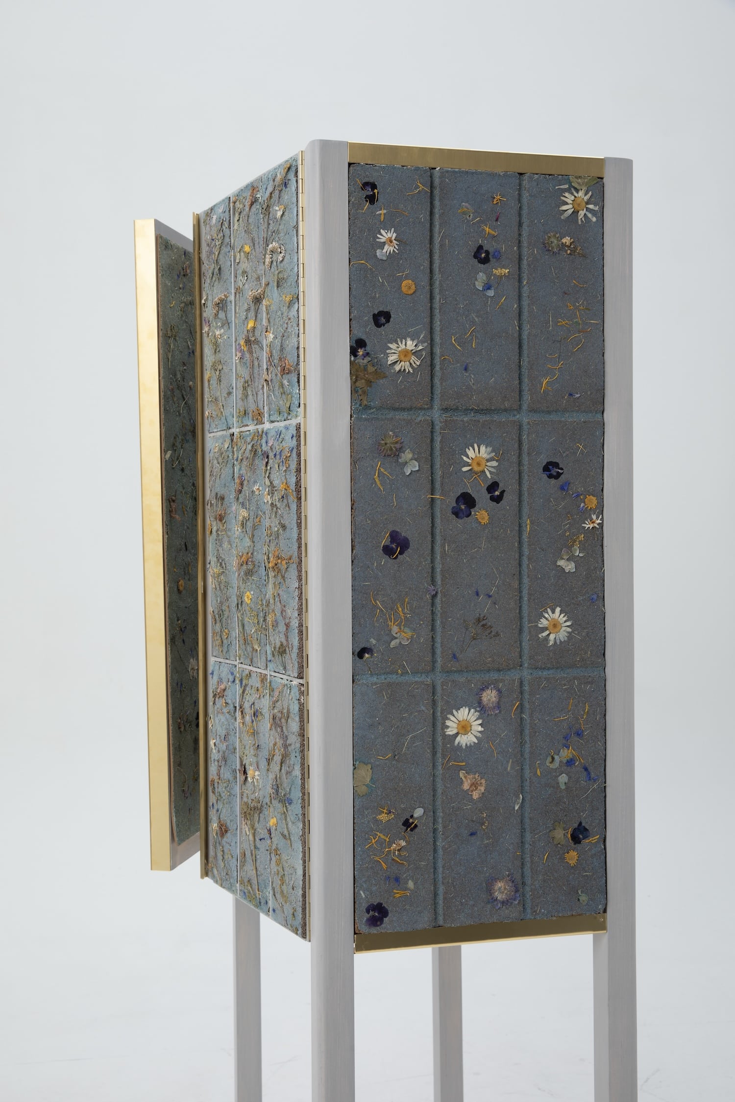 Anne Ländle formule une proposition que Green Edge rend tangible : et si les meubles n’étaient pas seulement fabriqués, mais cultivés ? Enracinés dans un lieu, dans un paysage, dans une saison. La matière qui compose le cabinet est littéralement prélevée dans l’environnement immédiat de la designer, transformée selon un protocole qu’elle a mis au point, puis restituée sous forme d’objet domestique habité par ces fragments de nature.