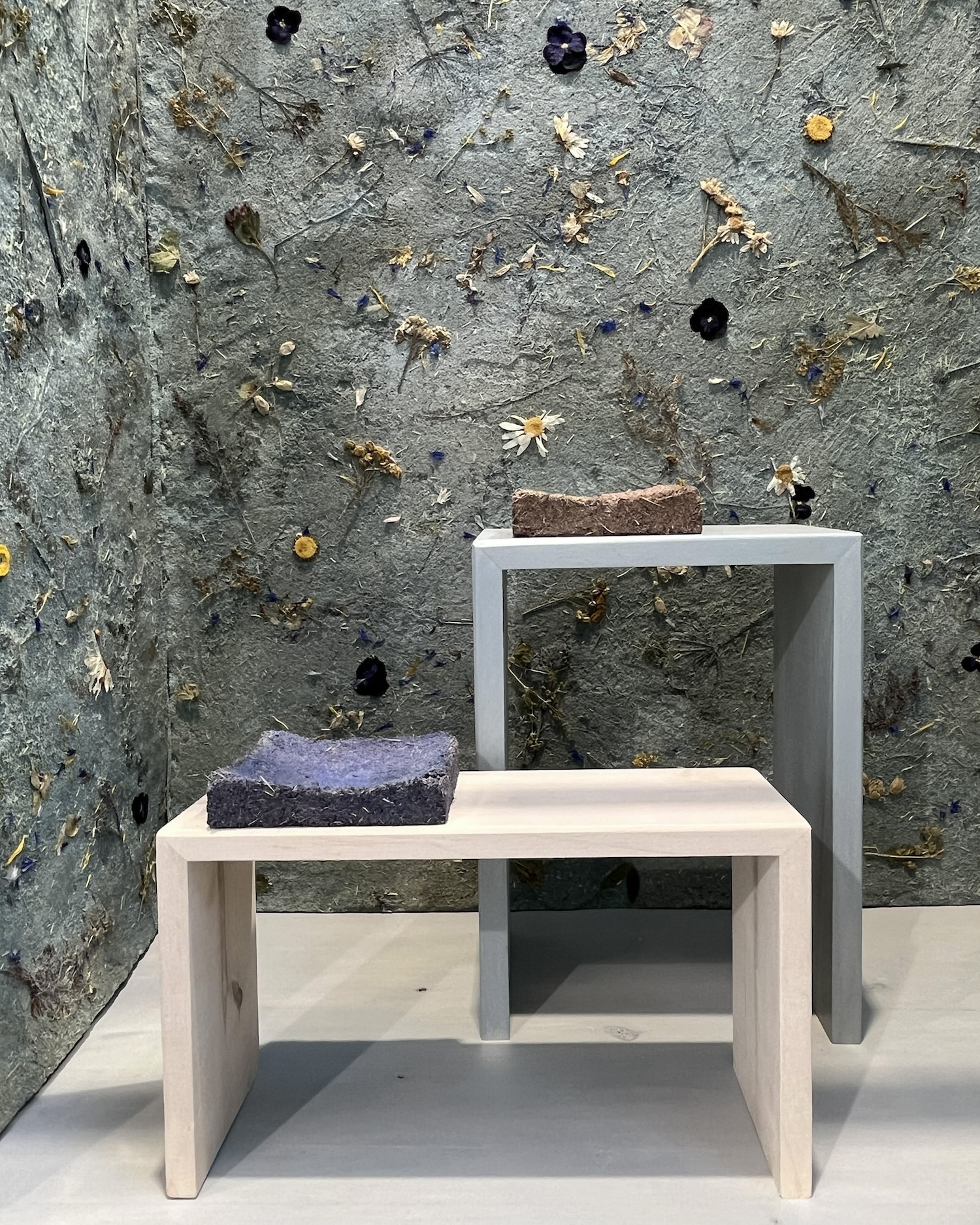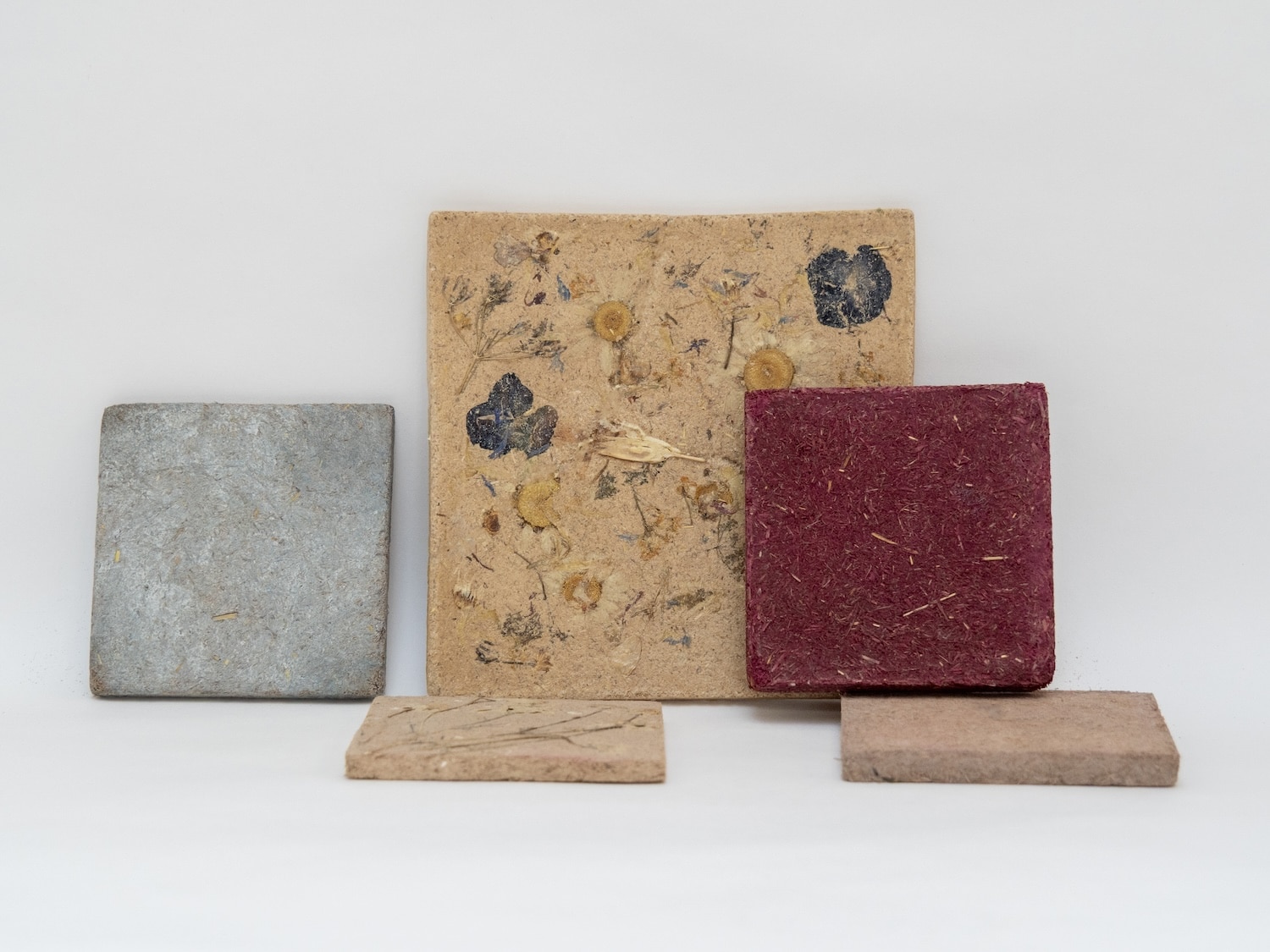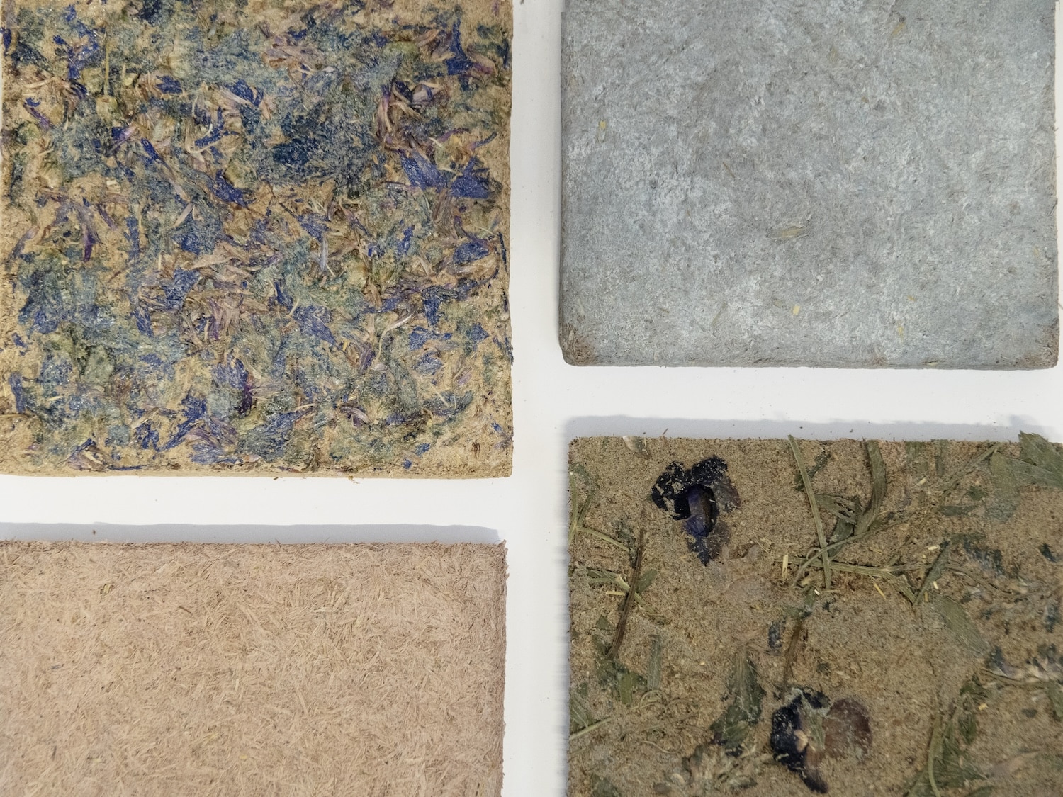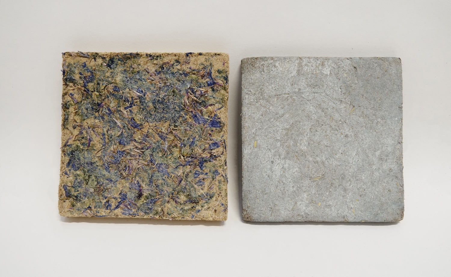 Sur le plan des propriétés mécaniques, Green Edge présente une résistance adaptée à la création de meubles et aux aménagements intérieurs. Le matériau peut être broyé, pigmenté, coloré et enrichi en inclusions florales, ces fragments de fleurs des champs dont la présence devient visible à la surface, créant une esthétique proche du terrazzo floral où chaque pièce révèle une composition unique. Une véritable poésie des champs invitée dans nos intérieurs.