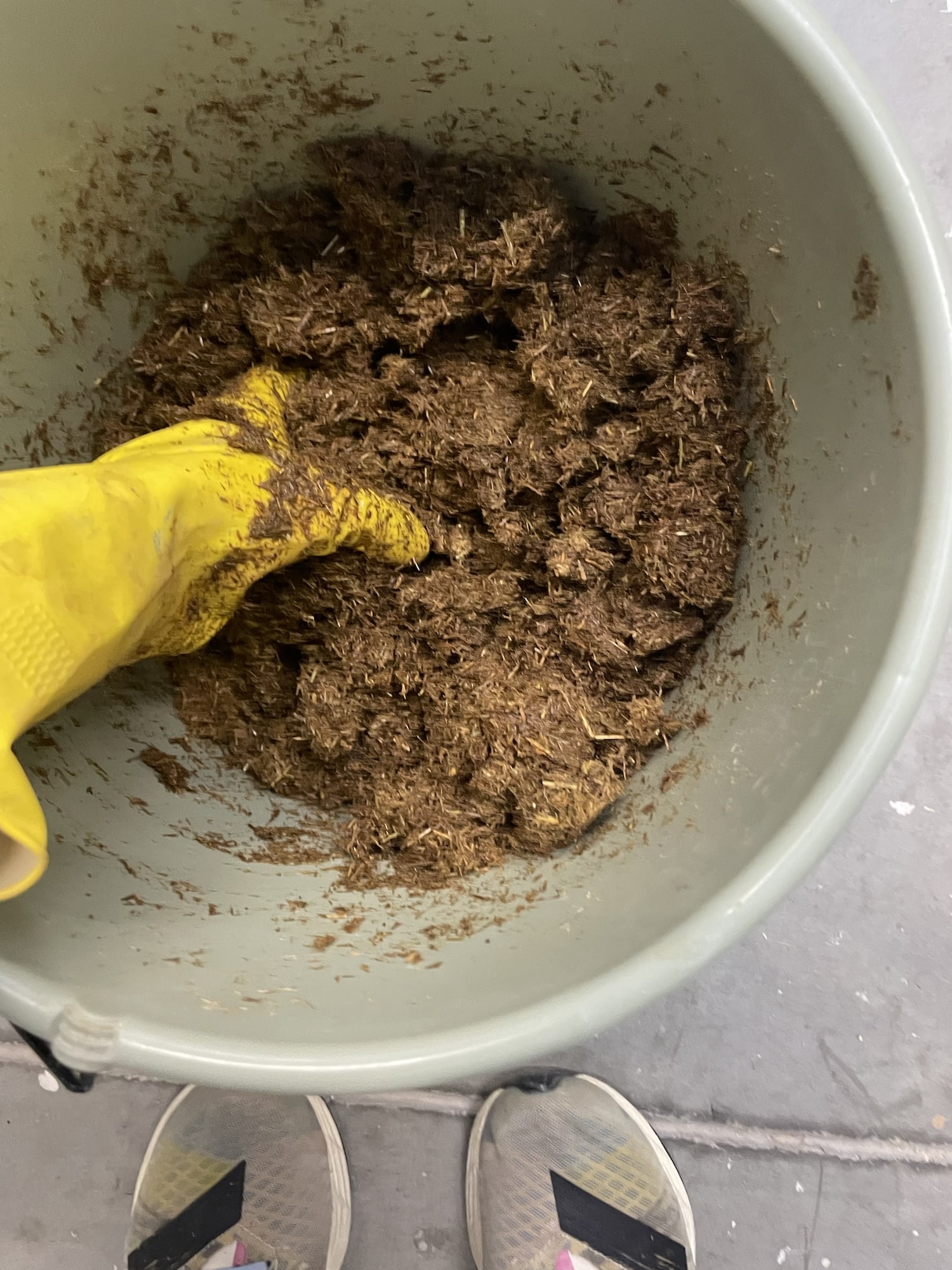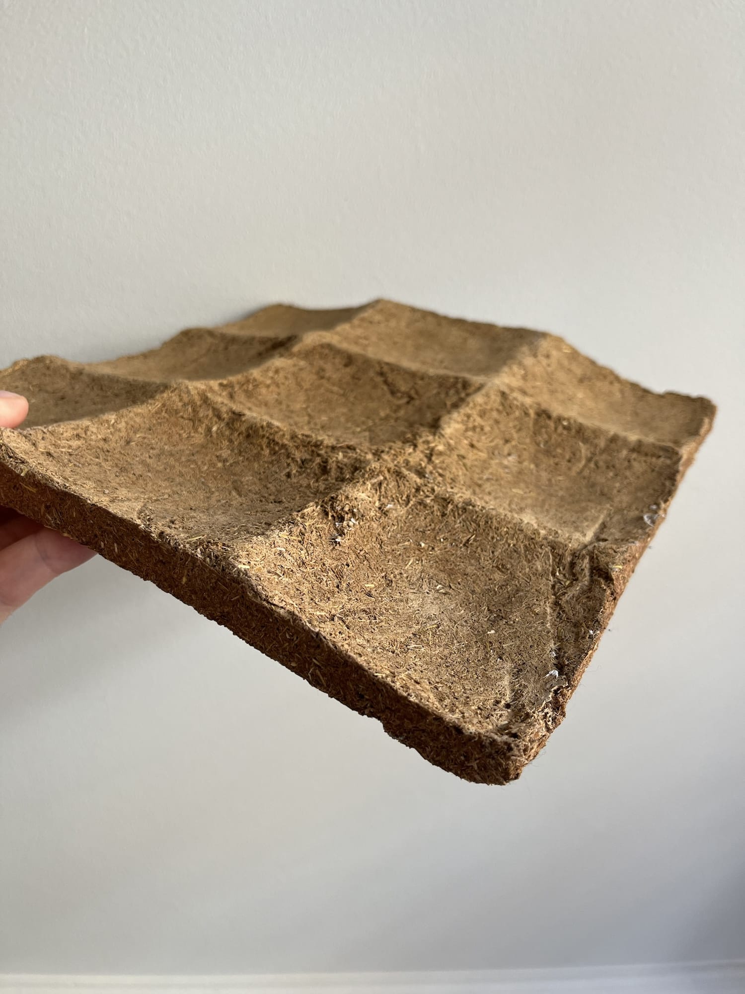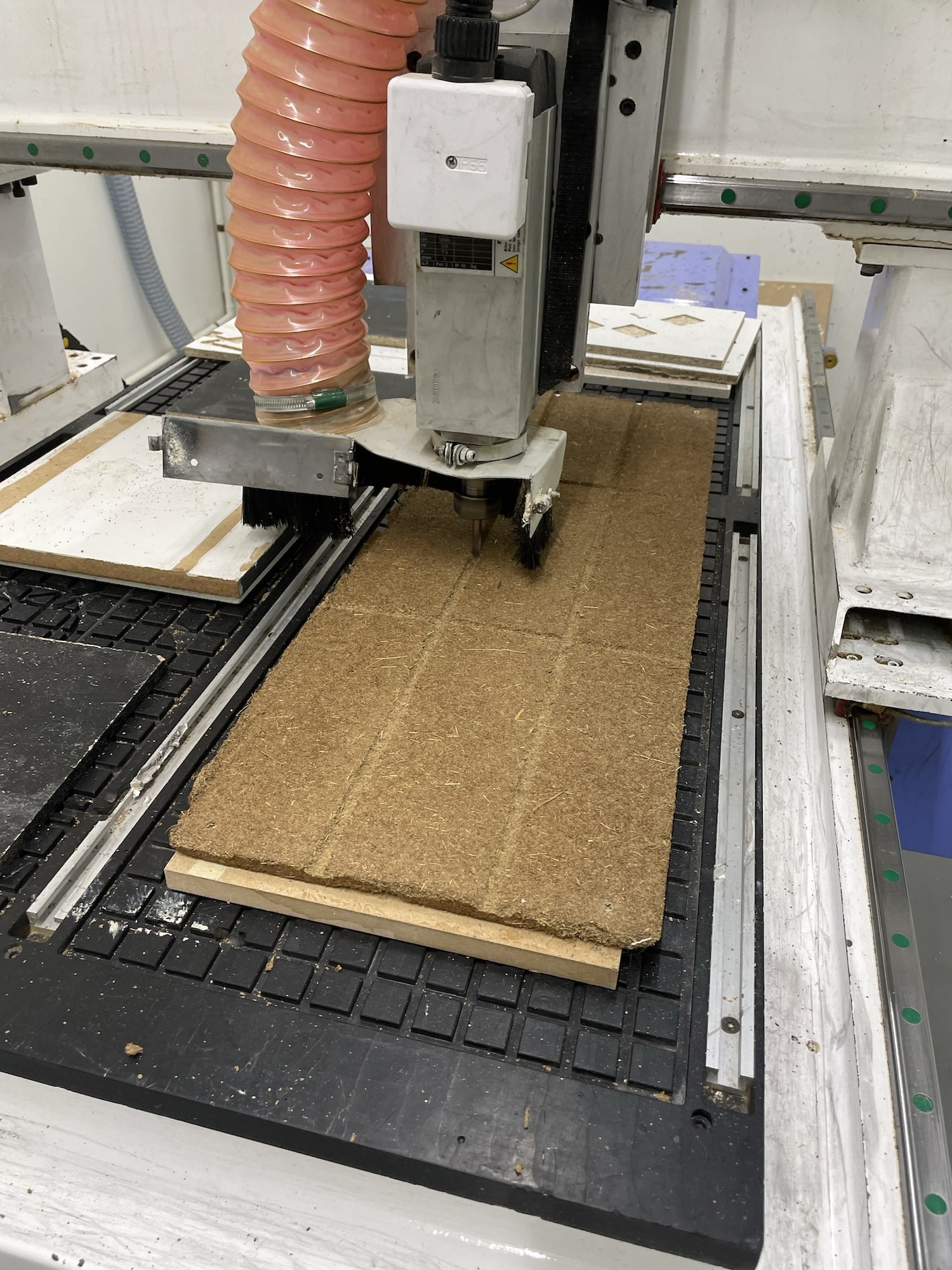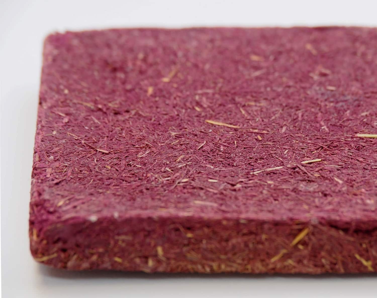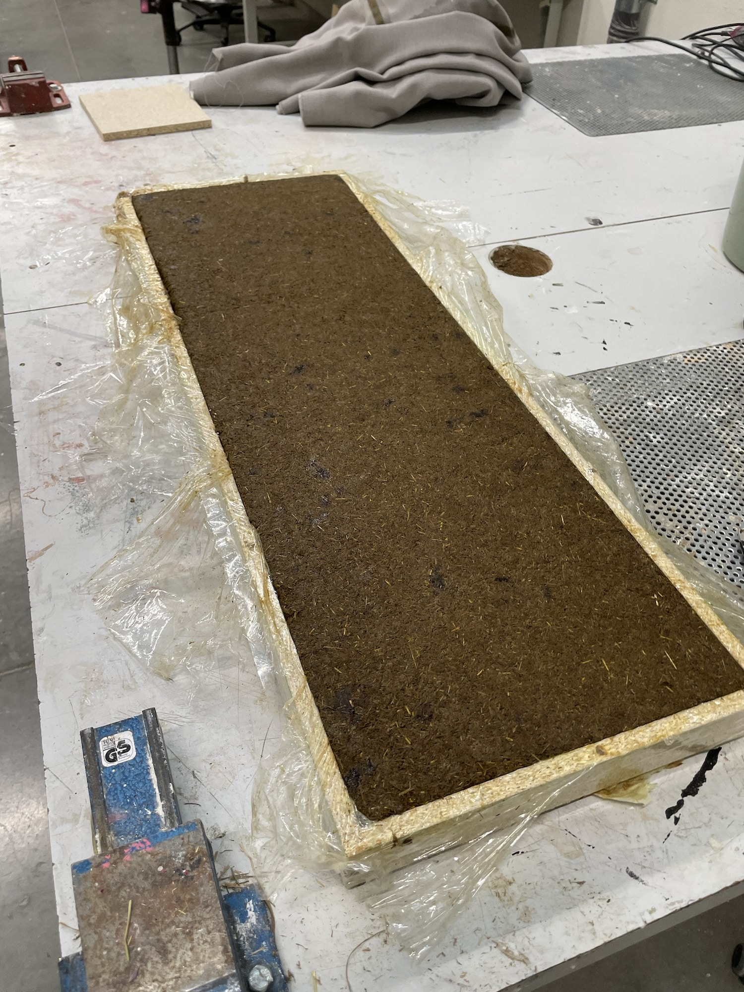 Green Edge se compose à environ 40 % de foin ramassé en bord de route, des fleurs sauvages et herbes mêlées et 60 % de déchets de bois issus des procédés d’usinage CNC. Ces chutes de fraisage et de découpe numérique, généralement valorisées au mieux en granulés combustibles, deviennent ici une matière première à part entière.