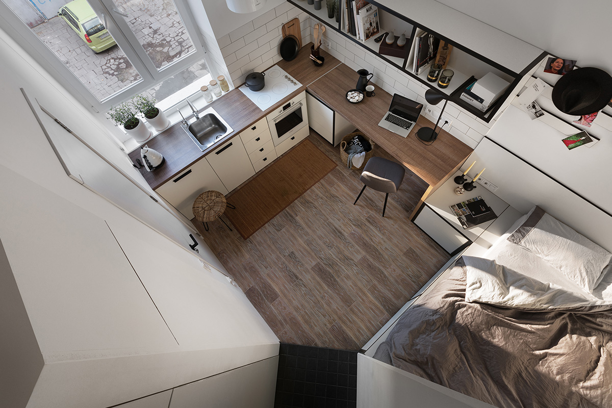 Le studio du projet Odessa se situait dans un vieux bâtiment dans le centre même d’Odessa. Les propriétaire ont hérité de ce bien et, ne sachant qu’en faire, ils ont fait appel au studio de design créatif Fateeva Design. En dépit de la superficie très limitée et de la faible valeur marchande du lieu, le studio partait tout même du fait qu’il semblait tout à fait possible d’en faire un lieu de location à long terme. Et l’idée a fonctionné. En effet, une université étant à proximité du studio, un étudiant pouvait donc en être locataire.