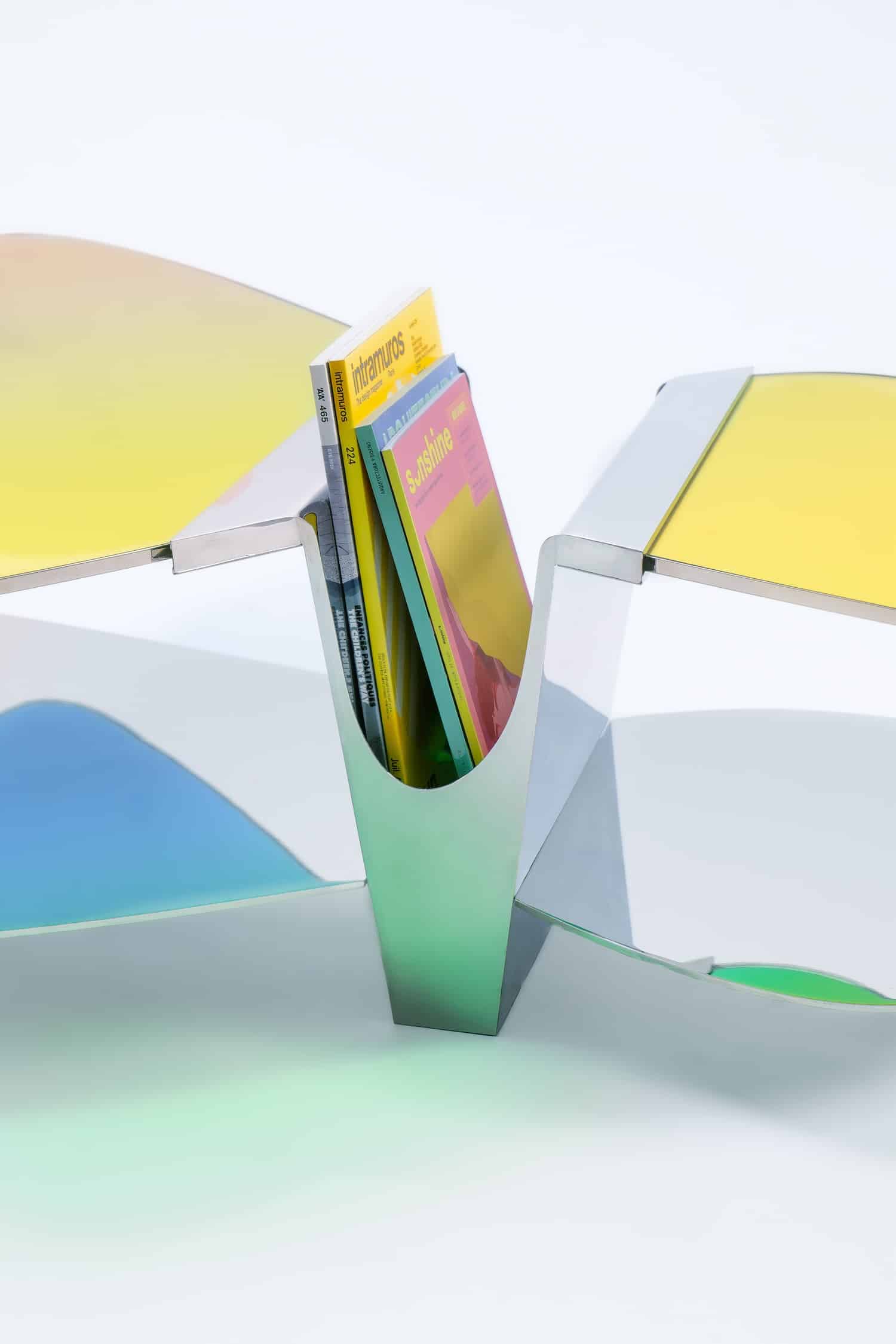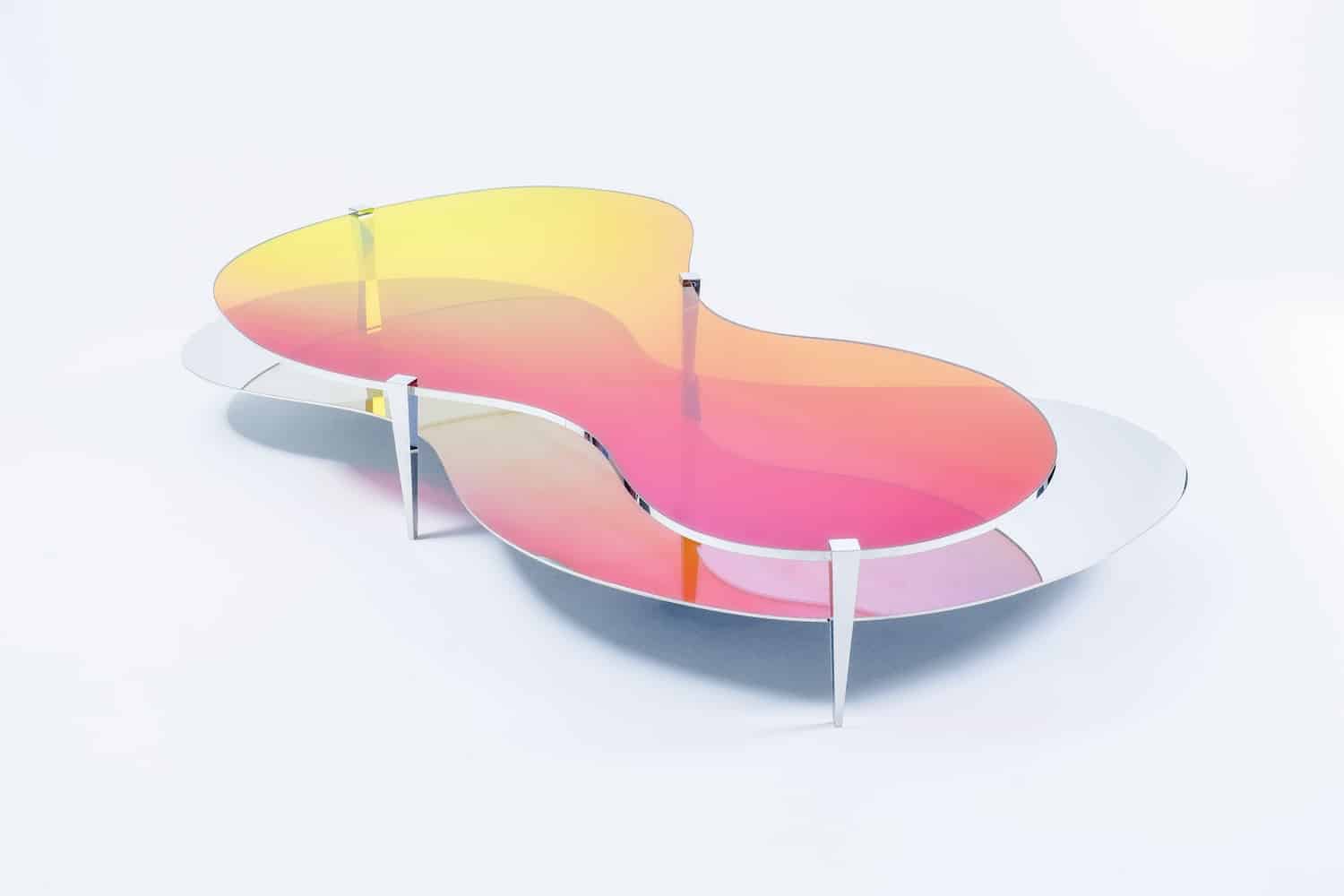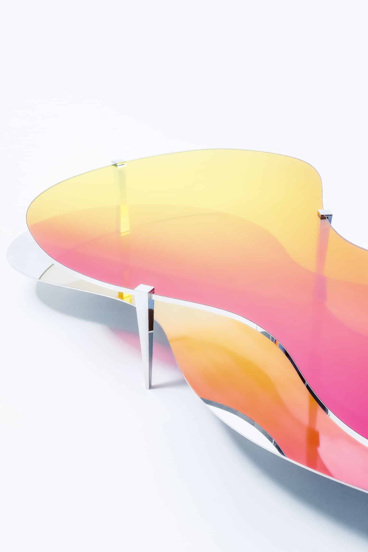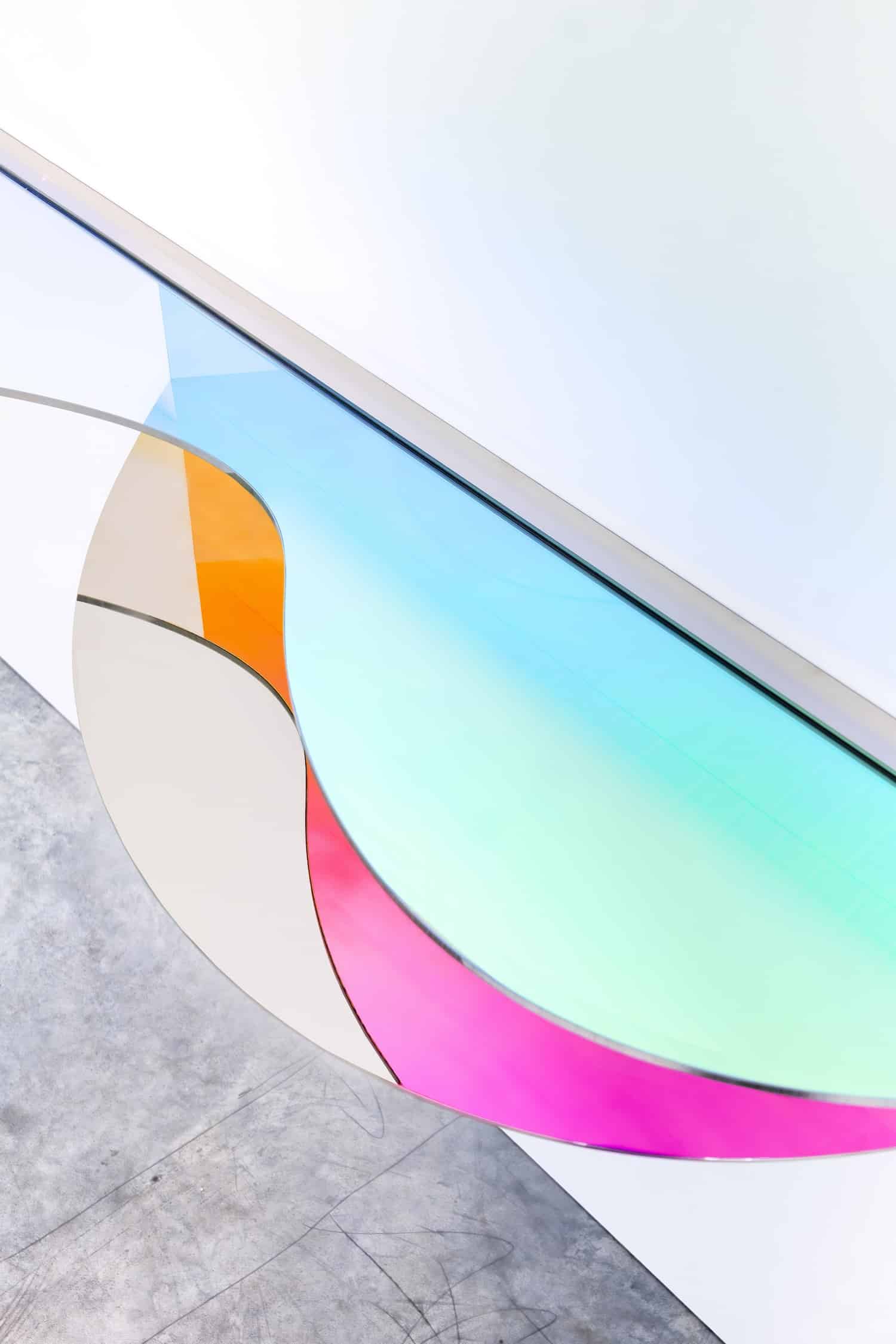 L’acier poli miroir, lui, opère différemment : il capte l’espace environnant et le redistribue, agissant comme une surface active qui amplifie le jeu optique initié par le verre. Là où le verre dichroïque diffracte et colore, l’acier reflète et prolonge. Les deux surfaces se répondent, se nourrissent mutuellement, et composent ce que le studio décrit comme une « alchimie optique ». Ce dialogue entre métal et verre dans le mobilier d’art n’est pas nouveau — on l’a vu par exemple dans les explorations de Tim Teven autour de la déformation de l’acier mais ODA LIK le pousse vers une dimension quasi phénoménologique, où l’objet devient instrument de perception plutôt que simple pièce de mobilier.