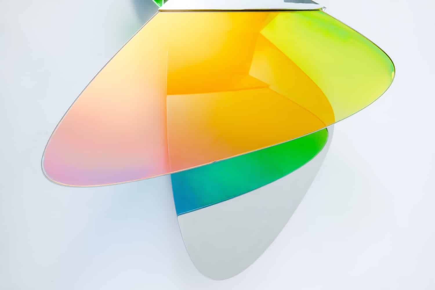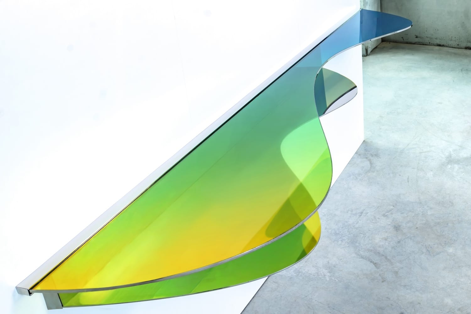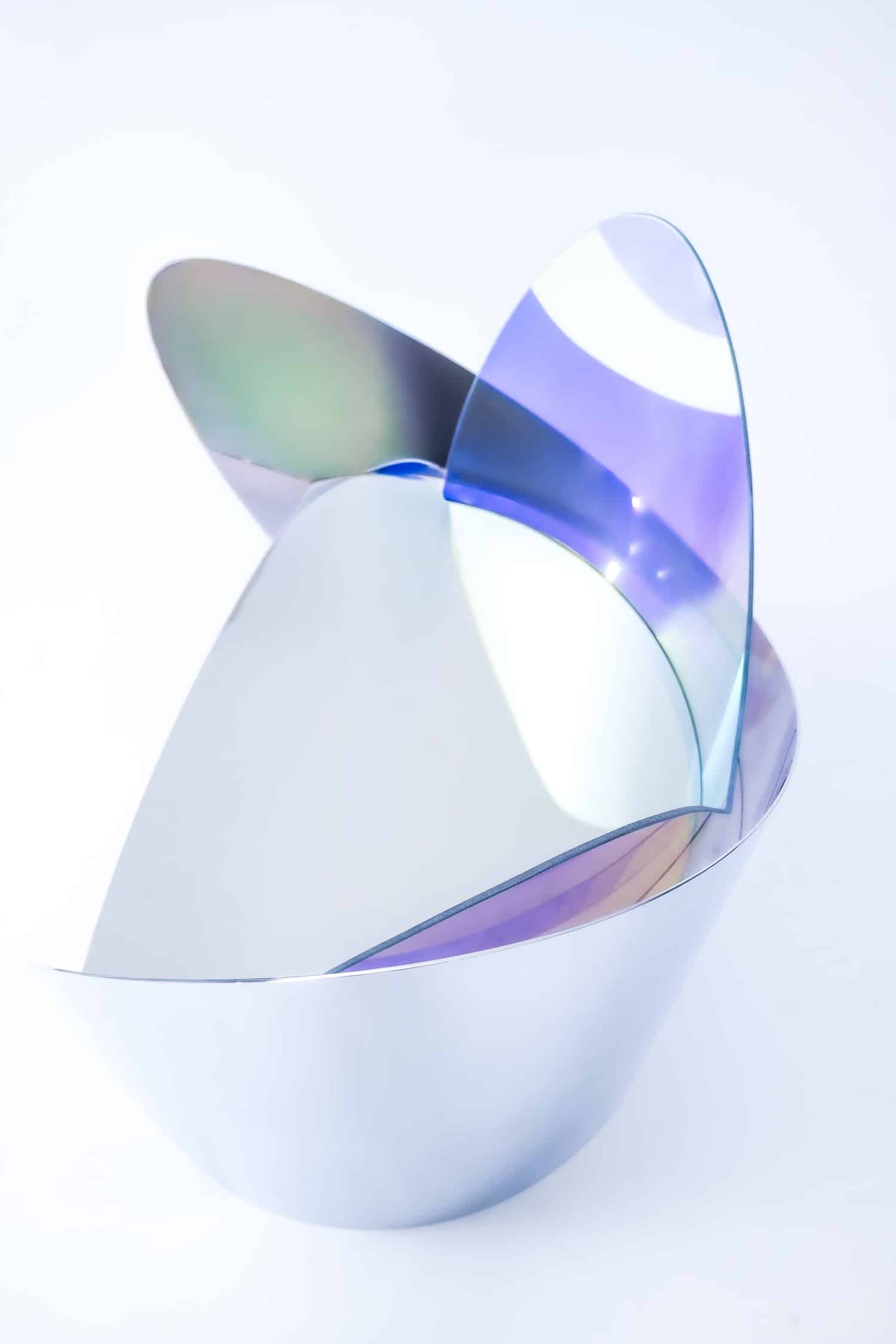 Le verre dichroïque est un matériau à propriétés optiques particulières : il est capable de transmettre et de réfléchir différentes longueurs d’onde de la lumière selon l’angle de vue et les conditions d’éclairage, les teintes, les couleurs dérivent, les surfaces semblent habitées par une profondeur qui n’existe pas réellement. Ce phénomène de modulation de couleur est au cœur même de la démarche. Le studio a d’ailleurs développé un procédé exclusif pour travailler ce verre, ce qui lui donne à chaque pièce une aura changeante et imprévisible impossible à reproduire strictement à l’identique, même en série.