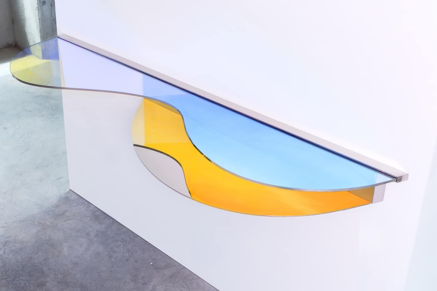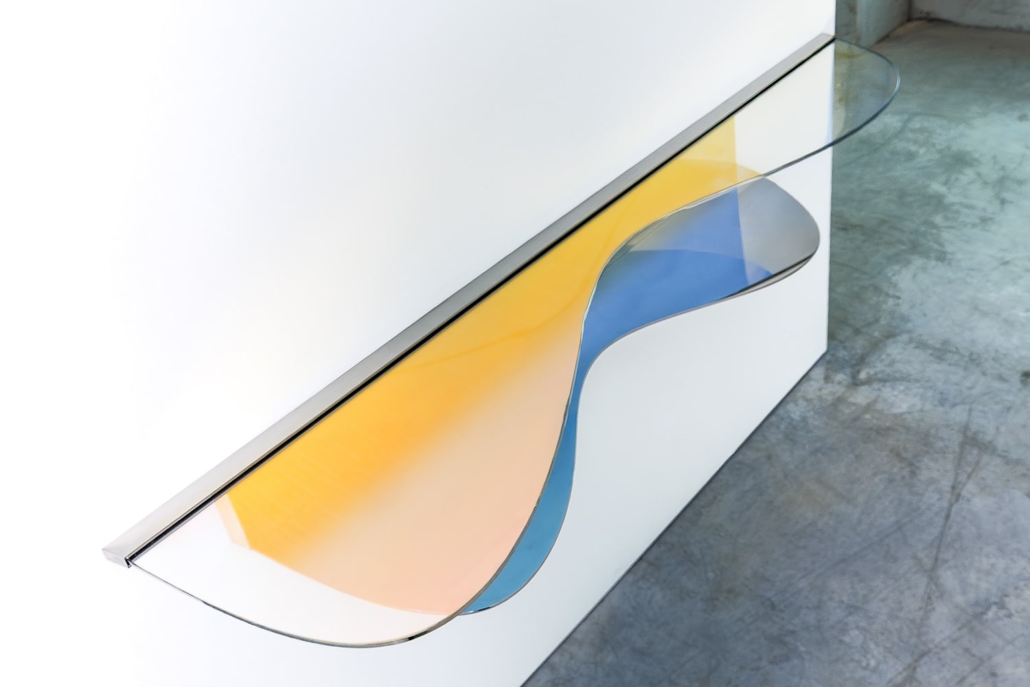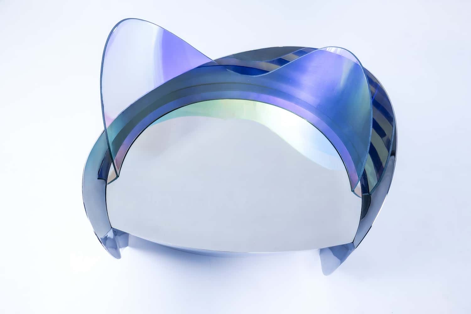 Le verre dichroïque est un matériau à propriétés optiques particulières : il est capable de transmettre et de réfléchir différentes longueurs d’onde de la lumière selon l’angle de vue et les conditions d’éclairage, les teintes, les couleurs dérivent, les surfaces semblent habitées par une profondeur qui n’existe pas réellement. Ce phénomène de modulation de couleur est au cœur même de la démarche. Le studio a d’ailleurs développé un procédé exclusif pour travailler ce verre, ce qui lui donne à chaque pièce une aura changeante et imprévisible impossible à reproduire strictement à l’identique, même en série.