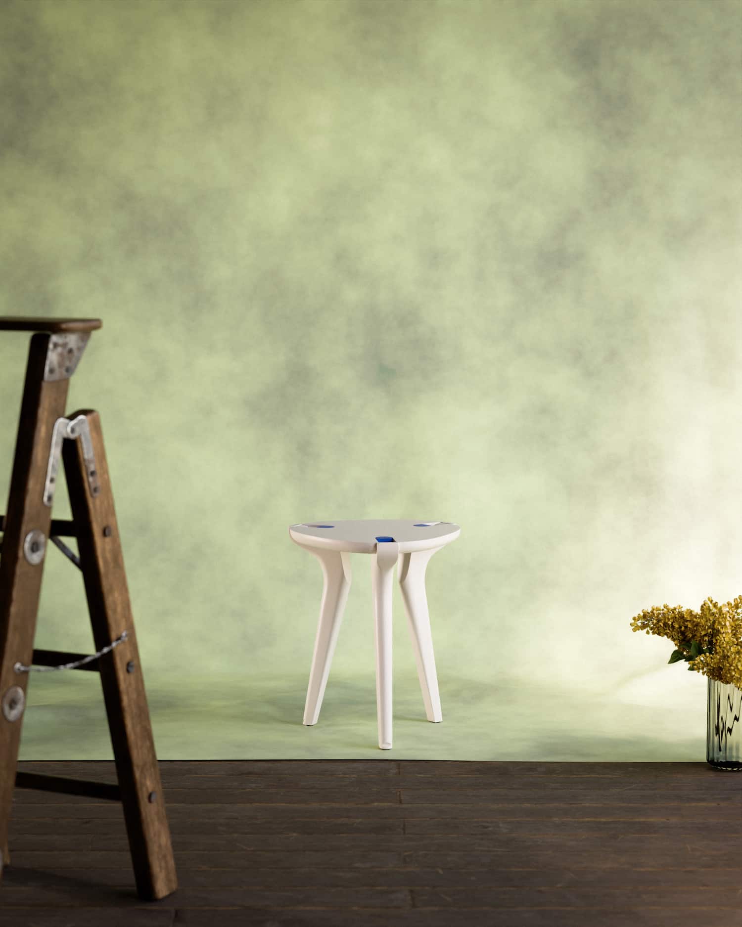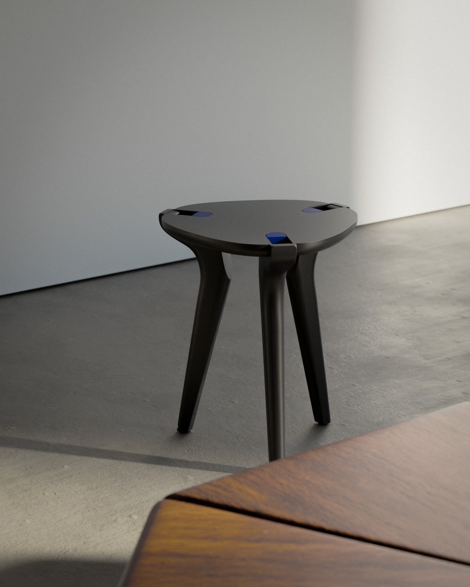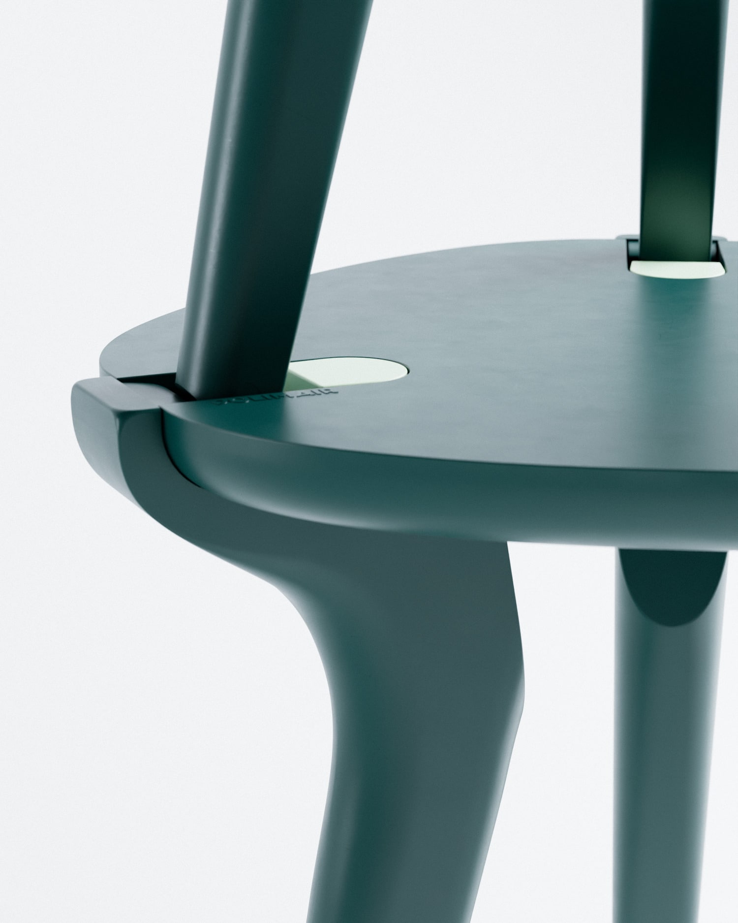 L’assise est circulaire, avec des encoches qui accueillent les clips. Les trois pieds sont légèrement évasés vers le bas, avec un galbe organique qui rappelle vaguement les céramiques de studio des années 70, sans y faire directement référence. La jonction entre les pieds et l’assise est l’un des points où les tabourets trahissent souvent une conception bâclée. Ici, la liaison est nette, et la silhouette reste lisible aussi bien posée à plat que superposée dans une structure verticale.