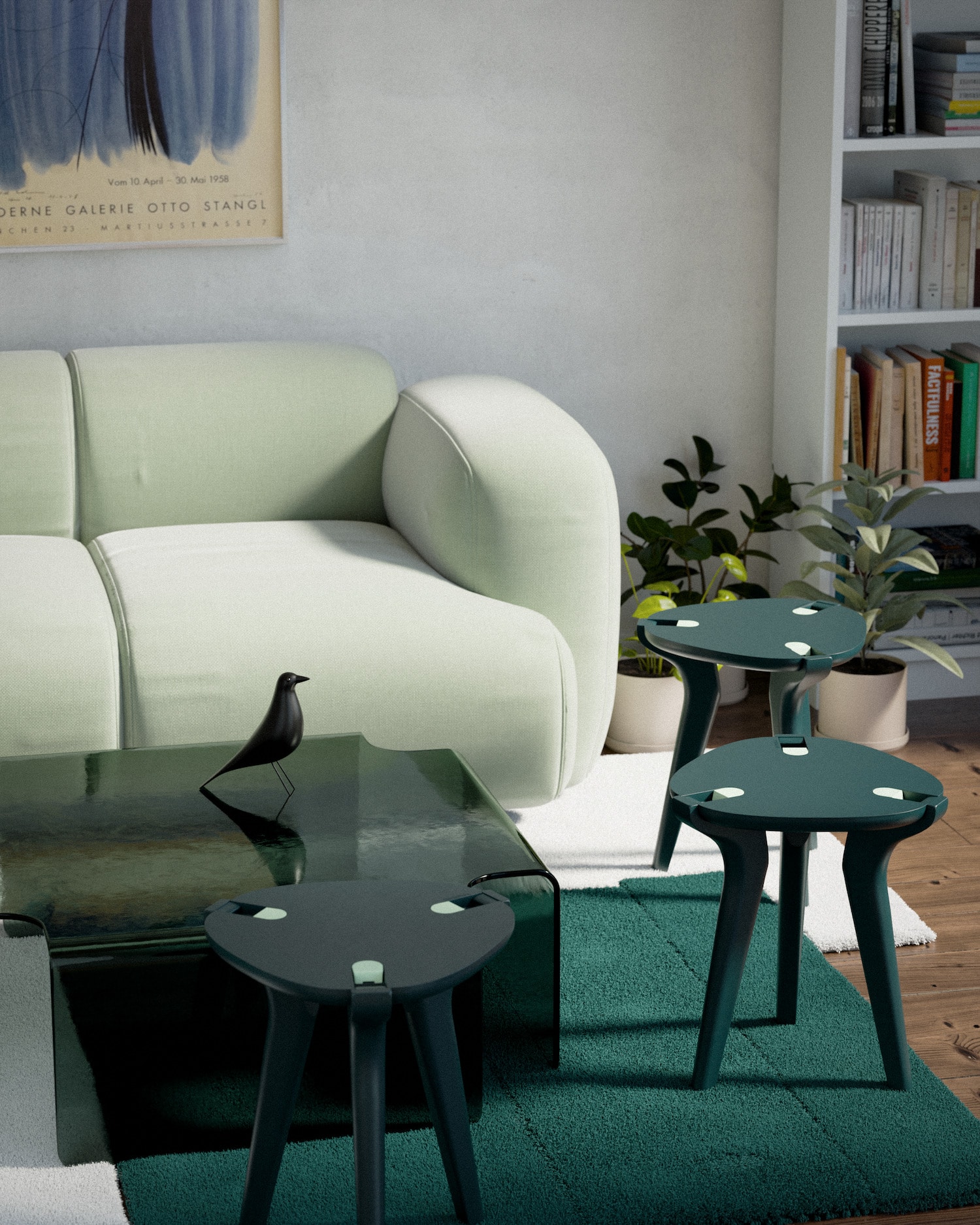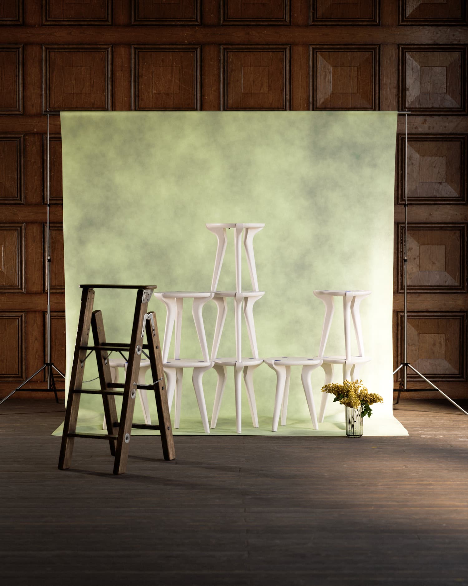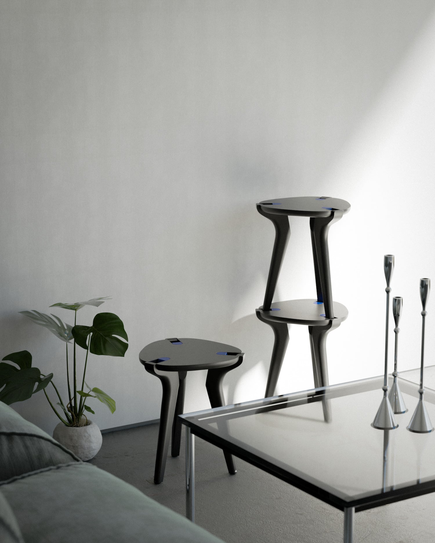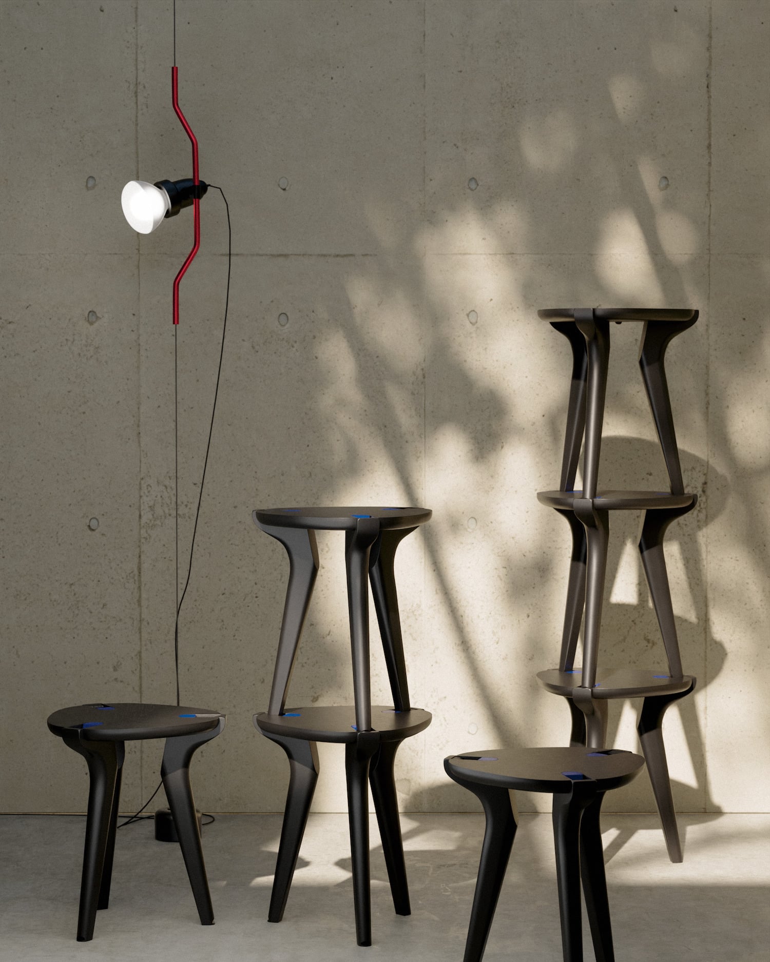 Les tabourets peuvent s’assembler entre eux verticalement pour former des structures autonomes : totems, claustras, étagères légères, compositions libres. L’objet change de rôle selon le moment de la journée ou la configuration de l’espace. Il passe d’assise à sculpture, de siège à rangement ponctuel. Ce n’est pas la première fois que la question de la modularité du mobilier est posée ici, mais rarement dans cette matière et avec cette économie de moyens.
