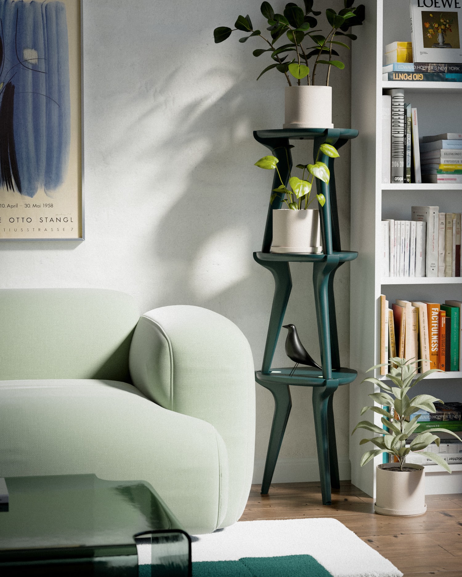 La couleur n’est pas une finition appliquée en surface. Elle est intégrée à la masse du matériau. Chaque pièce peut être commandée dans une teinte différente, ce qui ouvre la voie à des compositions qui vont du monochrome sobre au totem multicolore façon Mondrian sous influence Memphis. C’est une décision formelle autant qu’industrielle : les couleurs vives révèlent la matière plutôt qu’elles ne la dissimulent.