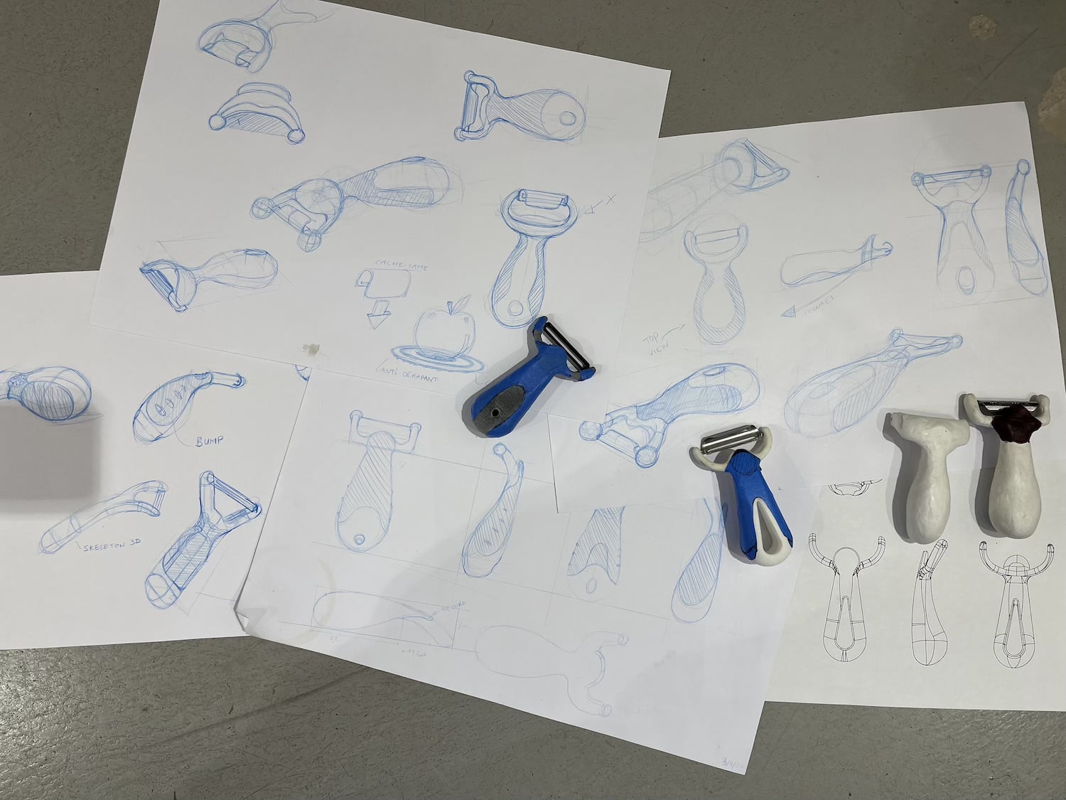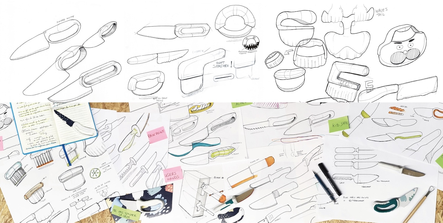 Le couteau Chefclub pour enfant, le brief était de couper les carottes mais pas les doigts. J’ai fait beaucoup de tests en cuisine, j’ai observé des enfants, j’ai écouté les appréhensions de l’entourage adulte. Ce projet m’a amené à faire un grand nombre de prototypes en pâte à modeler, en impression 3D et beaucoup d’aller retour avec les fournisseurs industriels. Je suis très fière du résultat, j’ai eu de bon retours des utilisateurs et c’est un succès commercial. Récemment, l’économe que j’ai dessiné vient également de sortir.