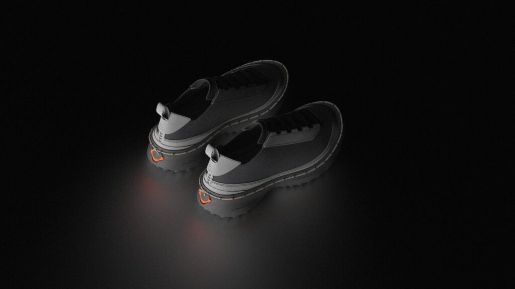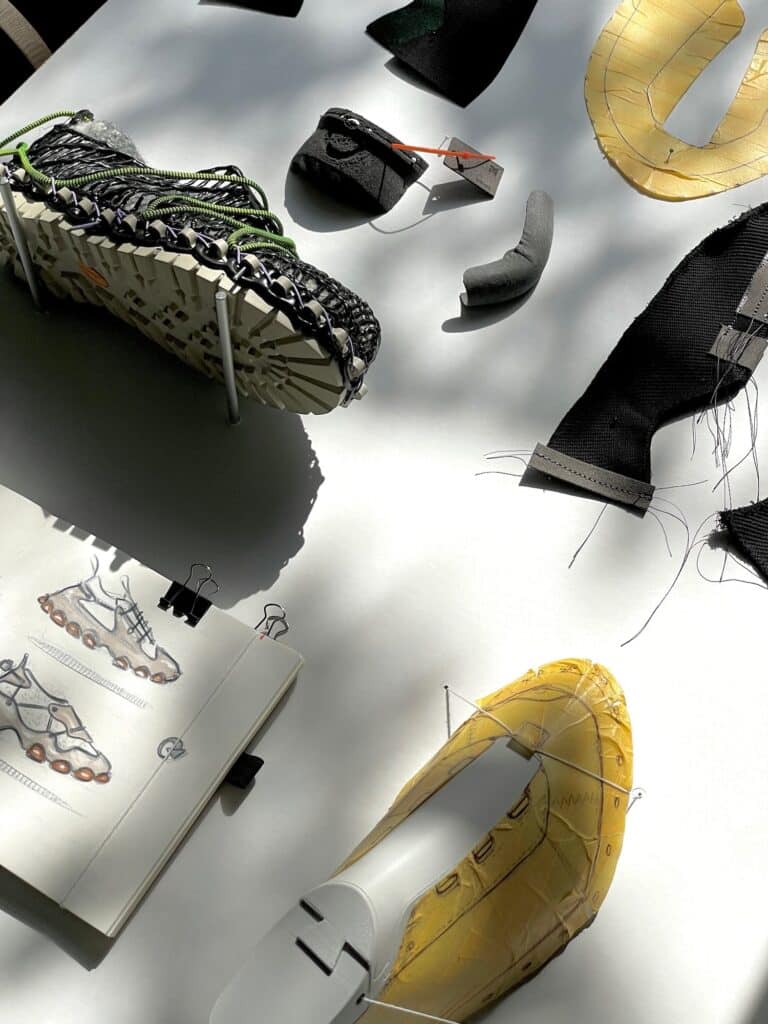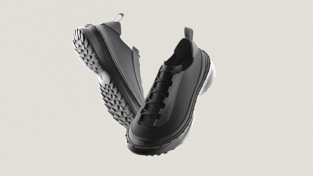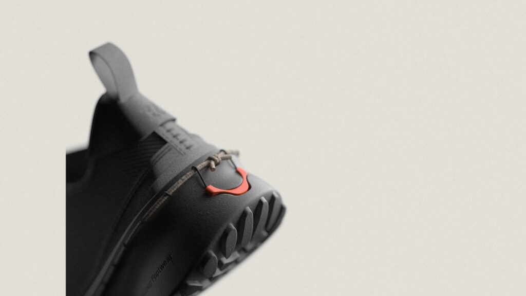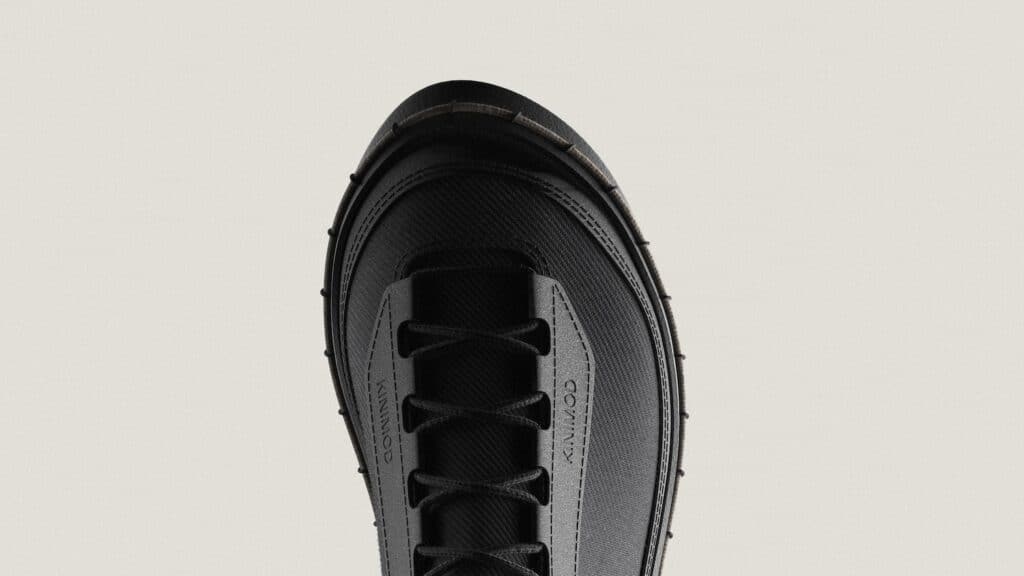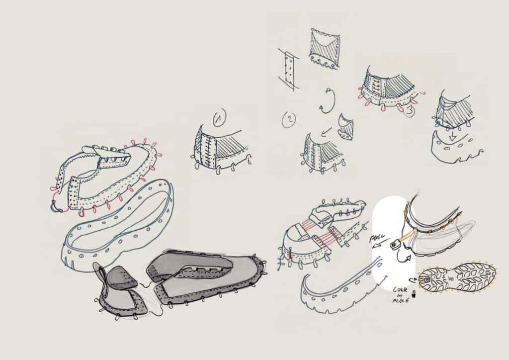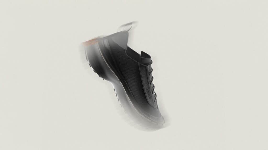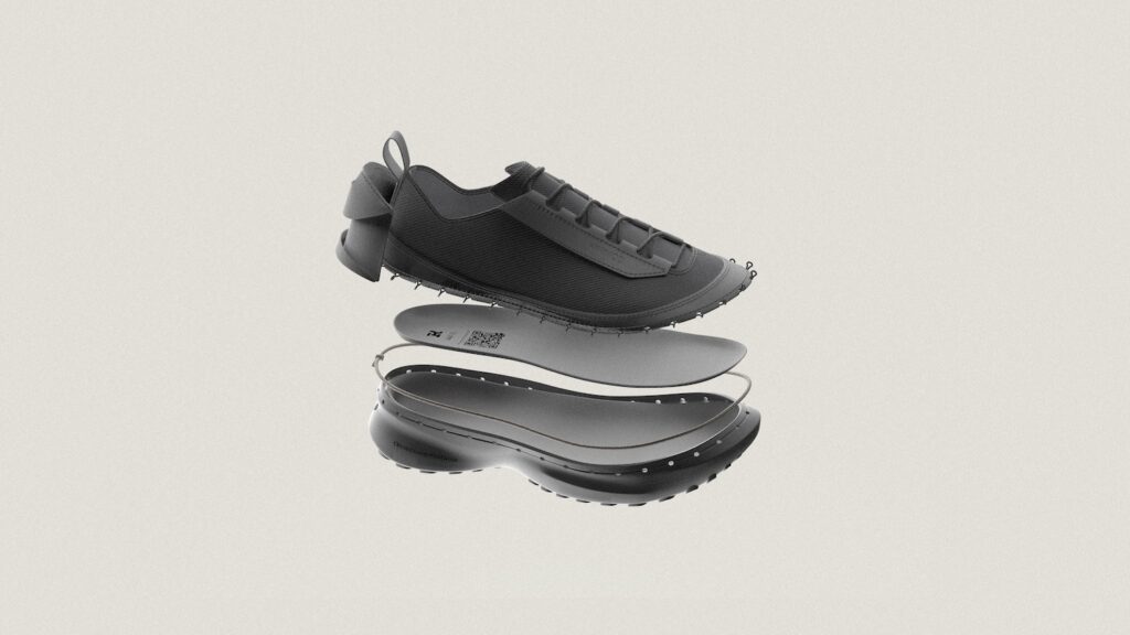 Le système repose sur un laçage différent, en périphérie de la chaussure, intégré à la semelle, qui connecte mécaniquement l’ensemble des composants sans nécessiter de colle ni de couture permanente, entre la semelle et le reste de la chaussure. Cette solution technique permet trois avantages décisifs : l’auto-assemblage par l’utilisateur, le remplacement de pièces usées, et la séparation complète des matériaux en fin de vie. Une approche qui résonne avec les recherches actuelles sur le design modulaire, comme nous l’avions observé avec EXOSKYN, cette sneaker conceptuelle qui explorait déjà l’impression 3D pour créer des structures adaptatives.