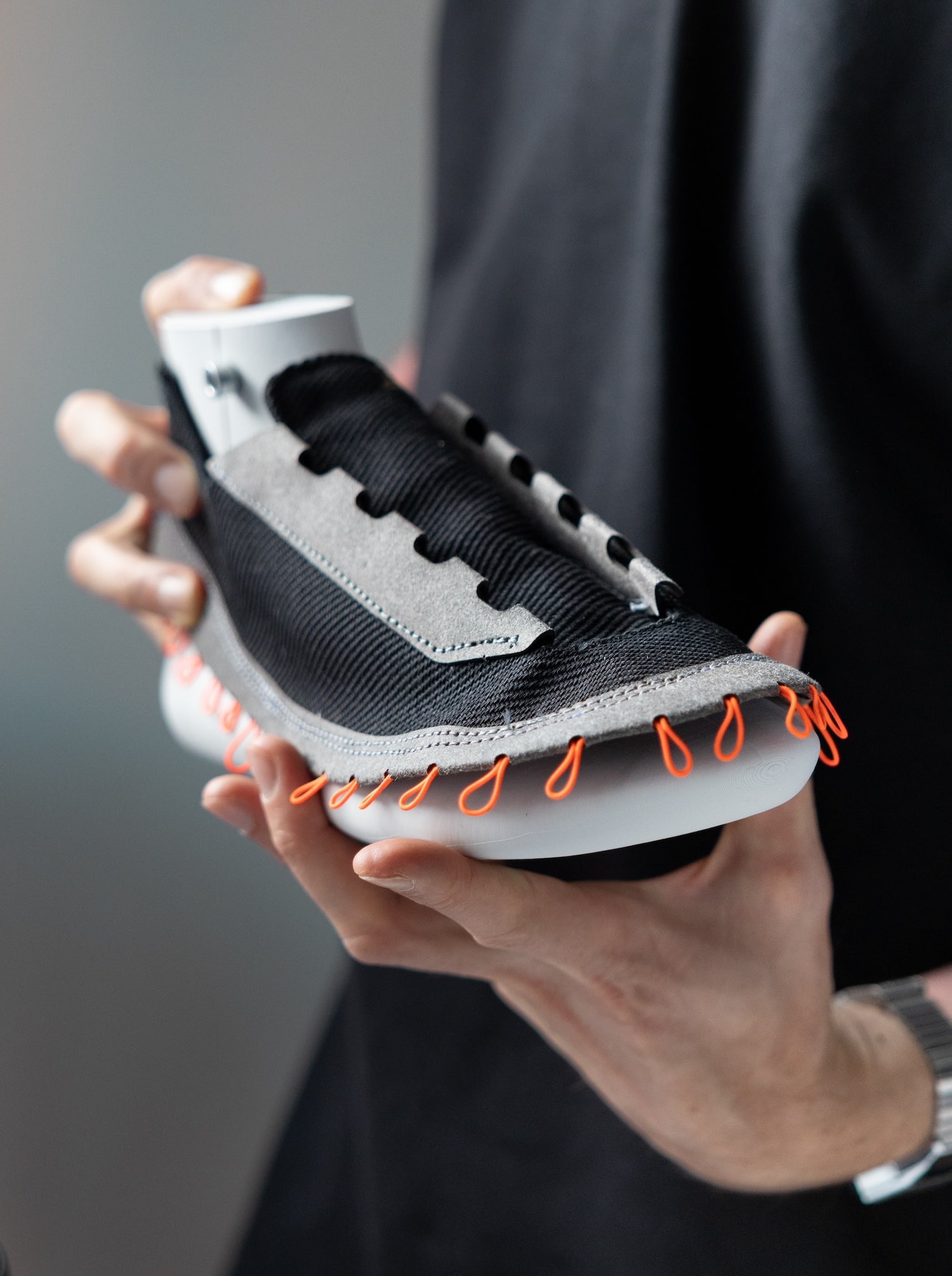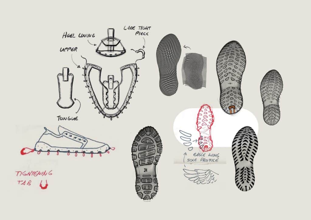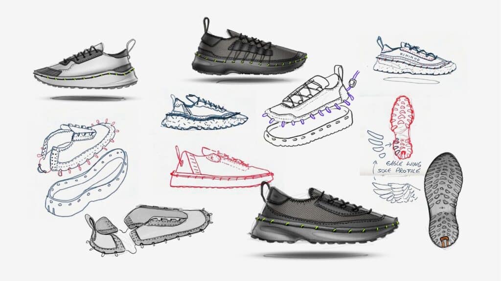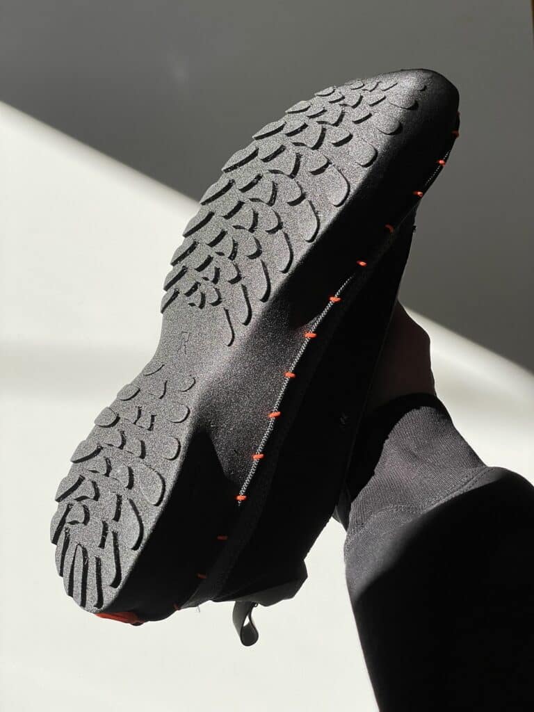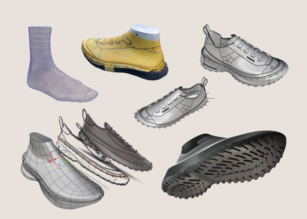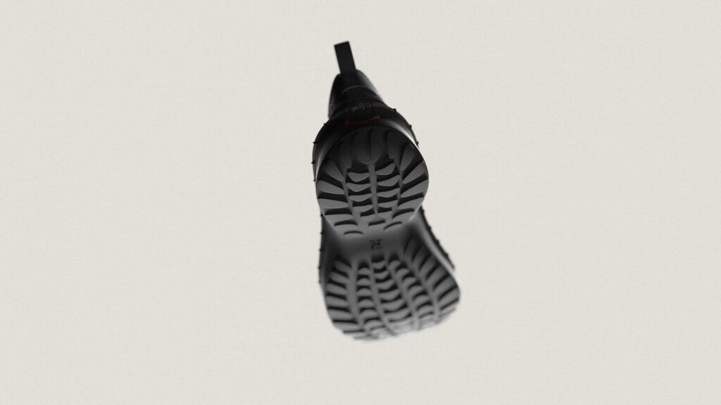 Le système repose sur un laçage différent, en périphérie de la chaussure, intégré à la semelle, qui connecte mécaniquement l’ensemble des composants sans nécessiter de colle ni de couture permanente, entre la semelle et le reste de la chaussure. Cette solution technique permet trois avantages décisifs : l’auto-assemblage par l’utilisateur, le remplacement de pièces usées, et la séparation complète des matériaux en fin de vie. Une approche qui résonne avec les recherches actuelles sur le design modulaire, comme nous l’avions observé avec EXOSKYN, cette sneaker conceptuelle qui explorait déjà l’impression 3D pour créer des structures adaptatives.