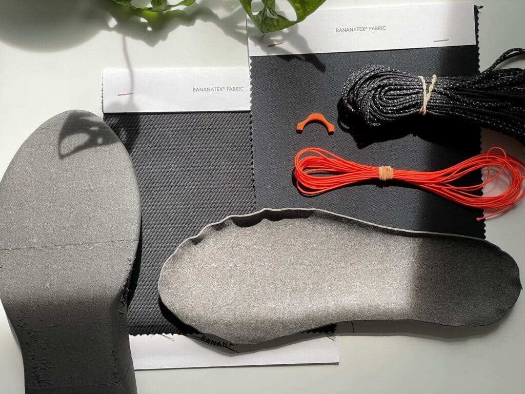 Pour la tige, les semelles intérieures et les renforts au talon, Dominik Scherrer a sélectionné deux matériaux textiles naturels aux propriétés remarquables. Le Bananatex, tissu technique issu de fibres de bananiers cultivés dans les hauts plateaux philippins, offre une résistance surprenante tout en restant compostable en fin de vie. Cultivé sans pesticides ni irrigation artificielle, ce textile représente une alternative crédible aux synthétiques conventionnels.