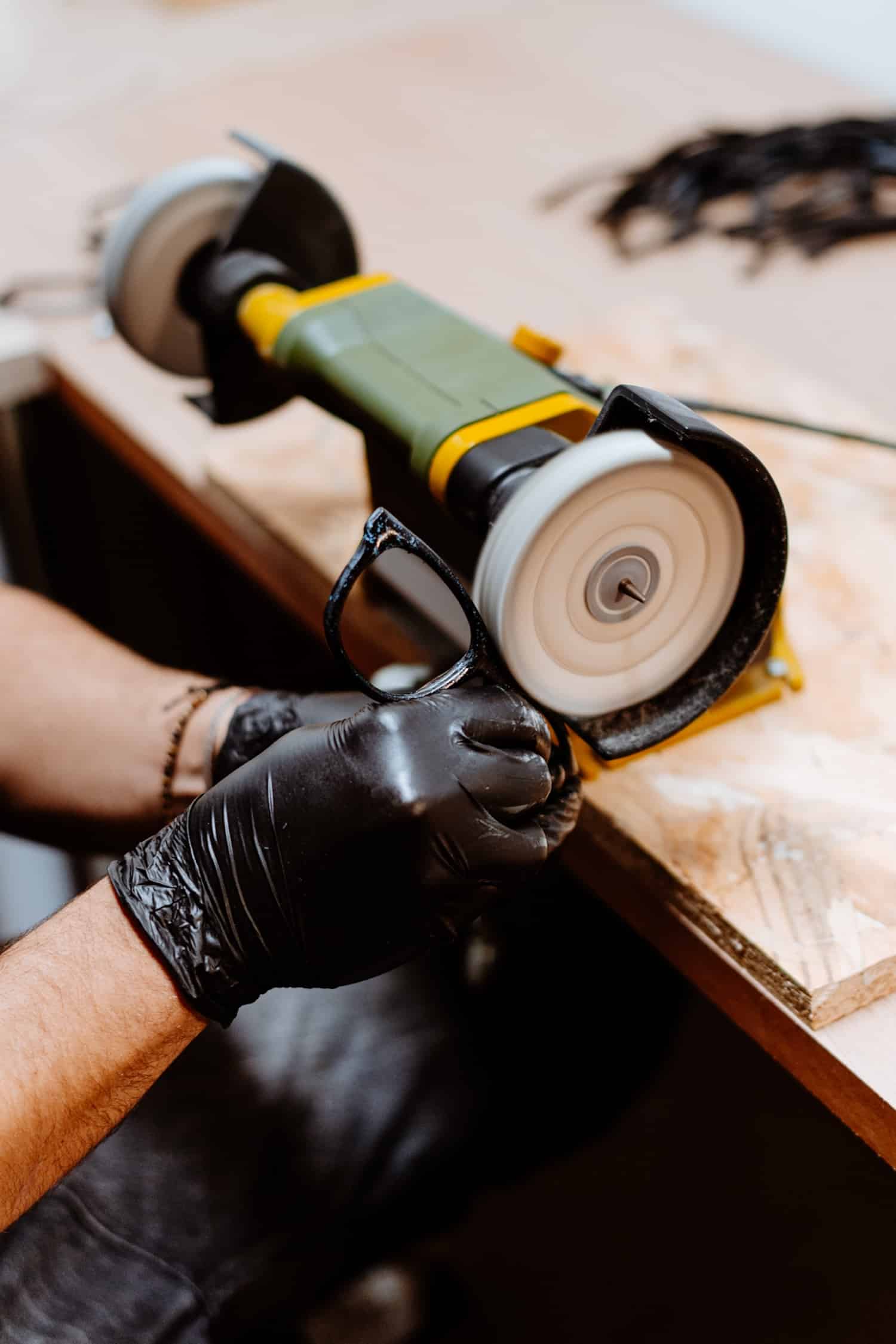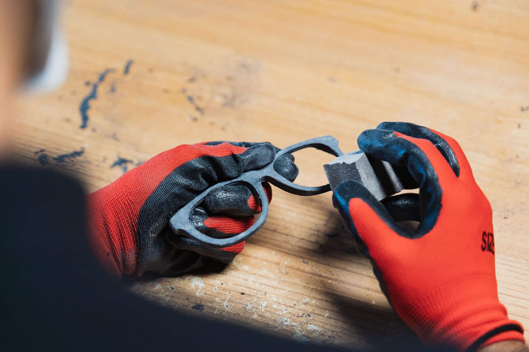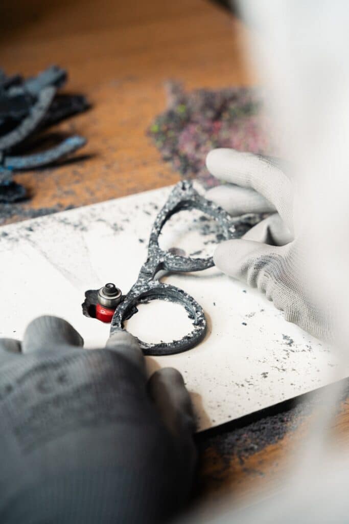 L’innovation se situe dans l’étape suivante : ces particules de néoprène broyées sont mélangées avec une résine biosourcée d’origine végétale, créant ainsi un matériau composite robuste et écologique. Cette fusion entre néoprène recyclé et résine végétale donne naissance à des plaques solides qui conservent les propriétés physiques du néoprène résistance à l’eau, flexibilité, texture agréable au toucher tout en offrant la rigidité nécessaire à la fabrication de montures.