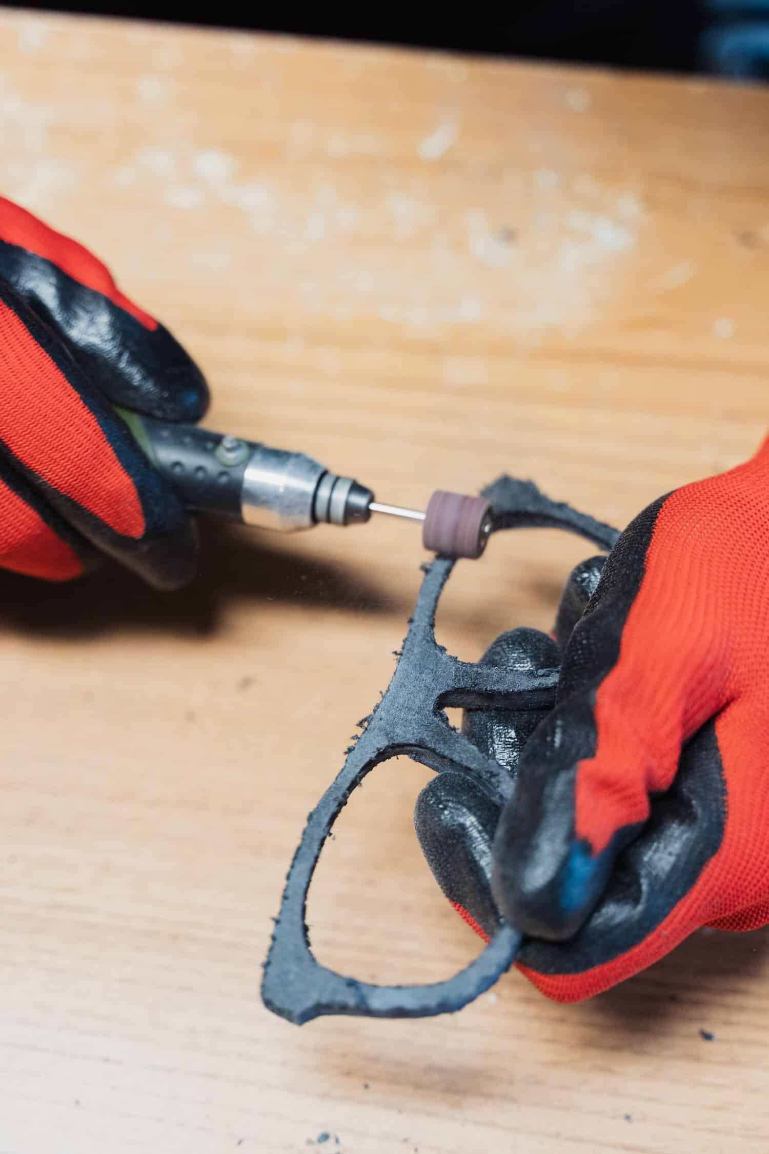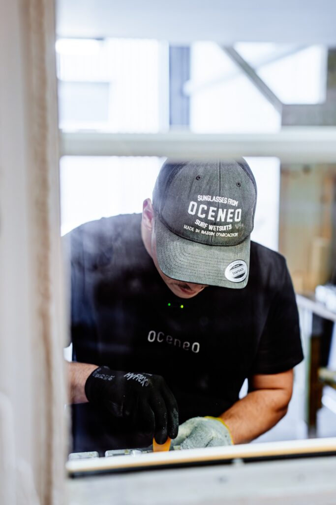 Quatre années de recherche et développement ont été nécessaires pour transformer ce questionnement en projet. Le défi technique était de taille : comment faire d’un matériau souple et flexible comme le néoprène une matière solide, car oui l’idée sera bien d’en faire des lunettes. La réponse réside dans un processus de fabrication entièrement internalisé, développé sur le Bassin d’Arcachon, où chaque étape révèle une maîtrise artisanale rare.