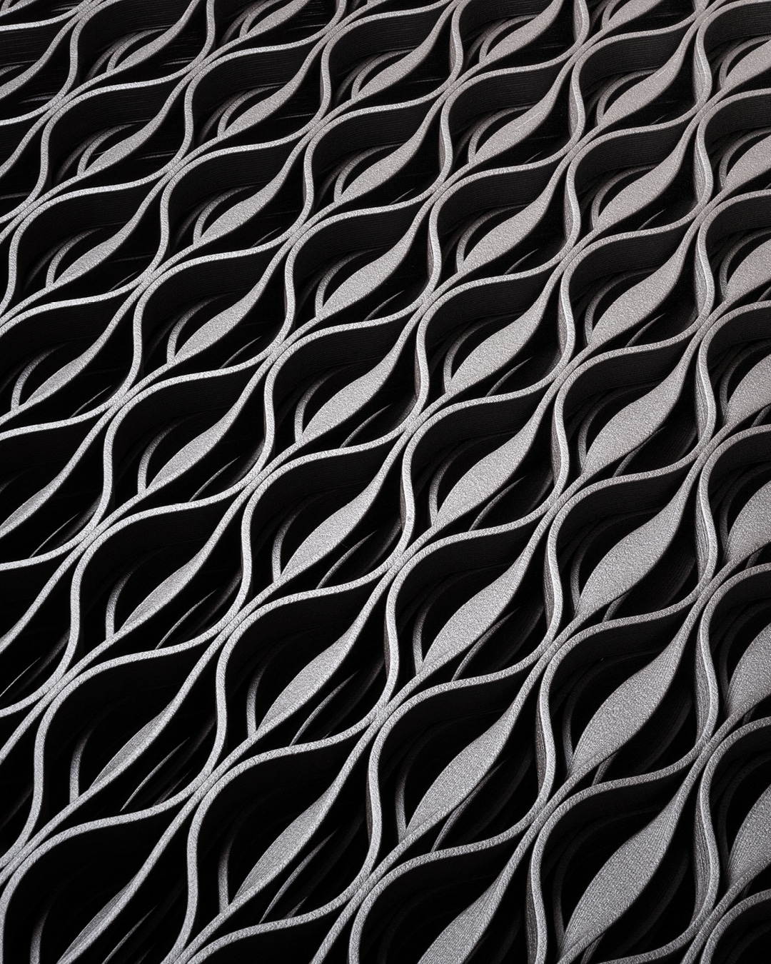 La plateforme propose deux gammes distinctes. Les systèmes destinés aux espaces professionnels, types bureaux, hôtels, restaurants exploitent des formats généreux pouvant atteindre 1 x 2 mètres par module. Cette échelle permet de créer des compositions rythmées où les motifs se répètent sans rupture visible entre les joints. Trois langages formels structurent l’offre : Curve joue sur les ondulations organiques, Nazka développe des trames géométriques inspirées du graphisme précolombien, tandis que Mesh propose des tissages ajourés.