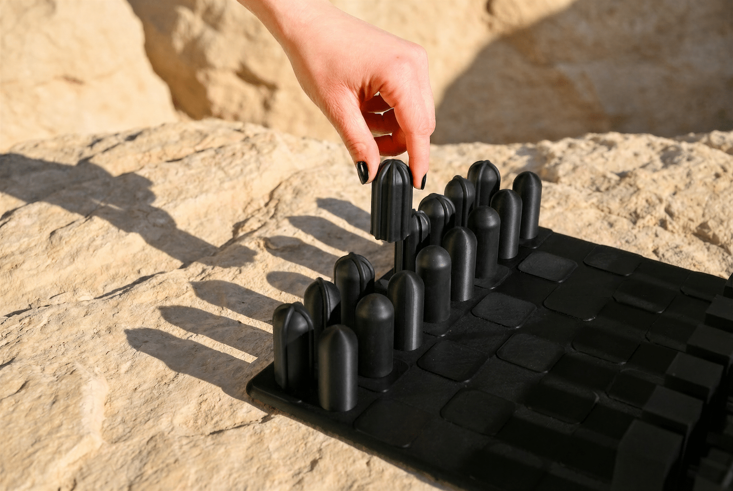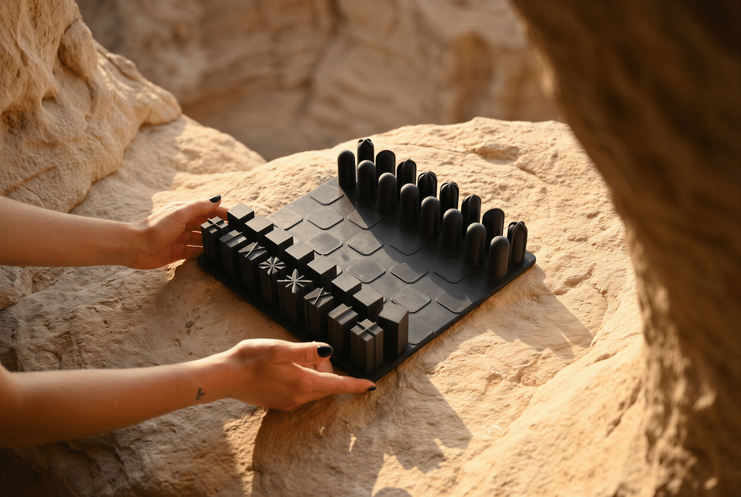 Le noir uniforme, appliqué à toutes les pièces et au plateau, efface toute hiérarchie chromatique. On ne lit plus le camp d’une pièce par sa couleur. On lit sa géométrie. C’est un glissement conceptuel important : la forme devient porteuse de sens à la place de la couleur, traditionnellement signal le plus immédiat.