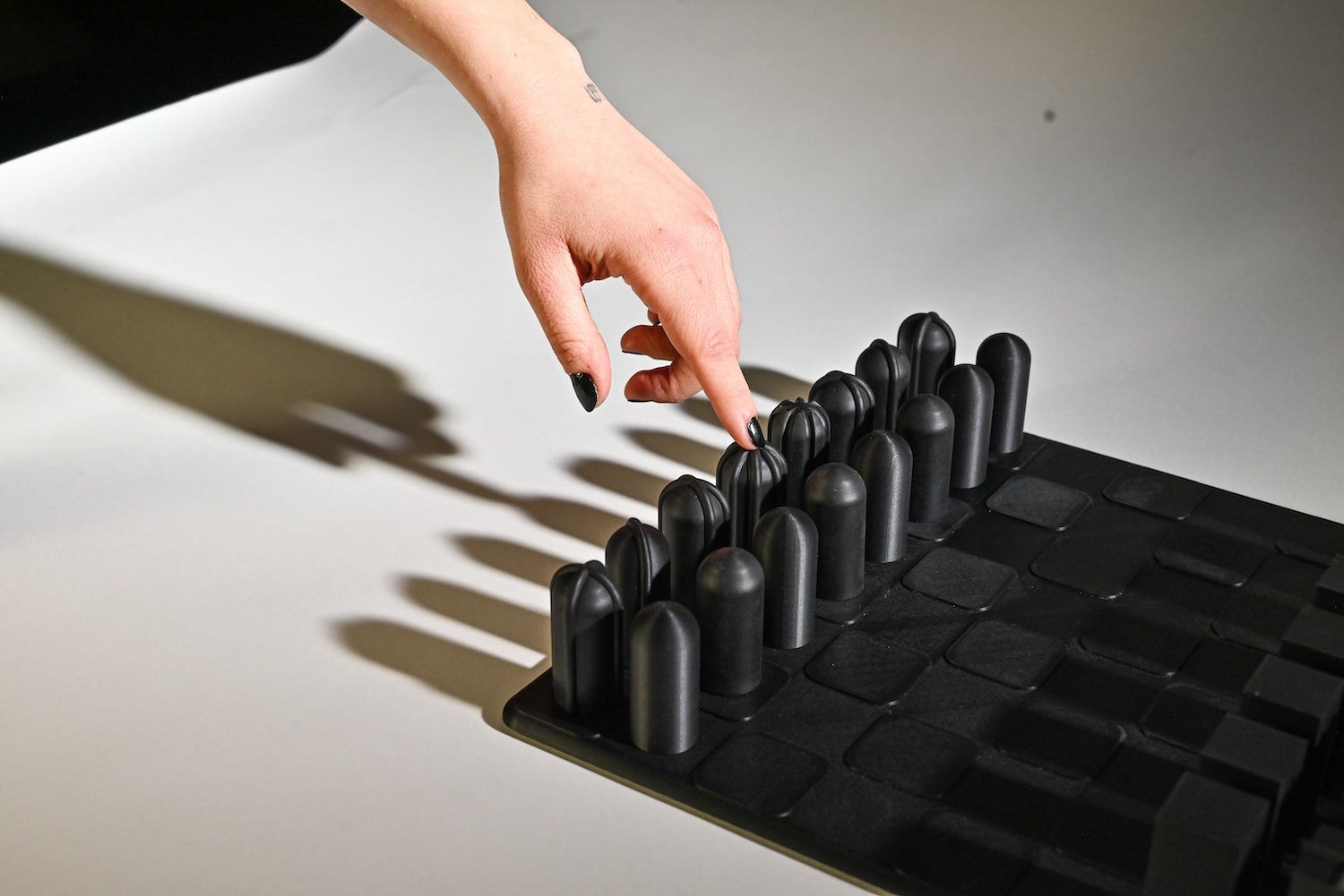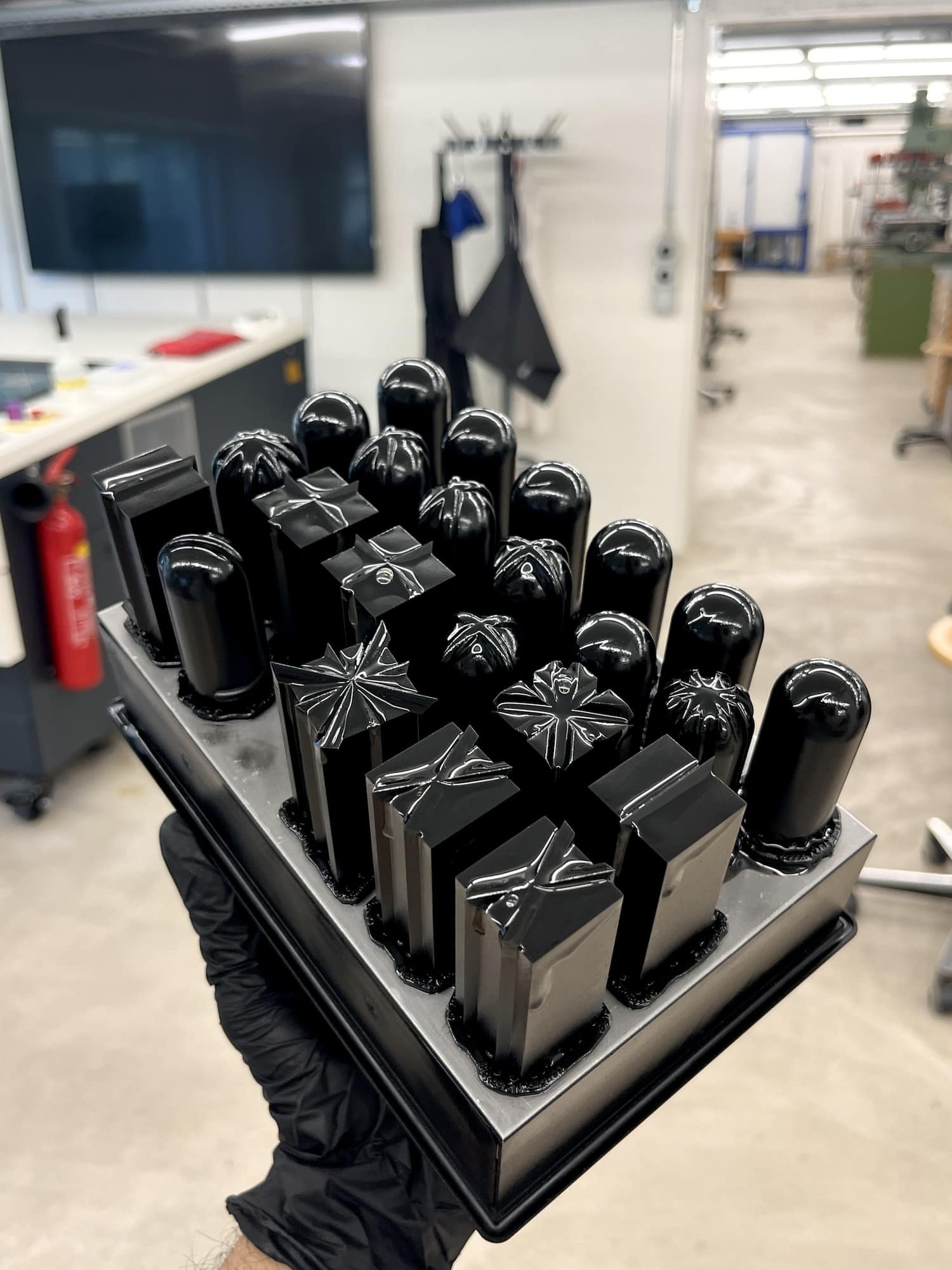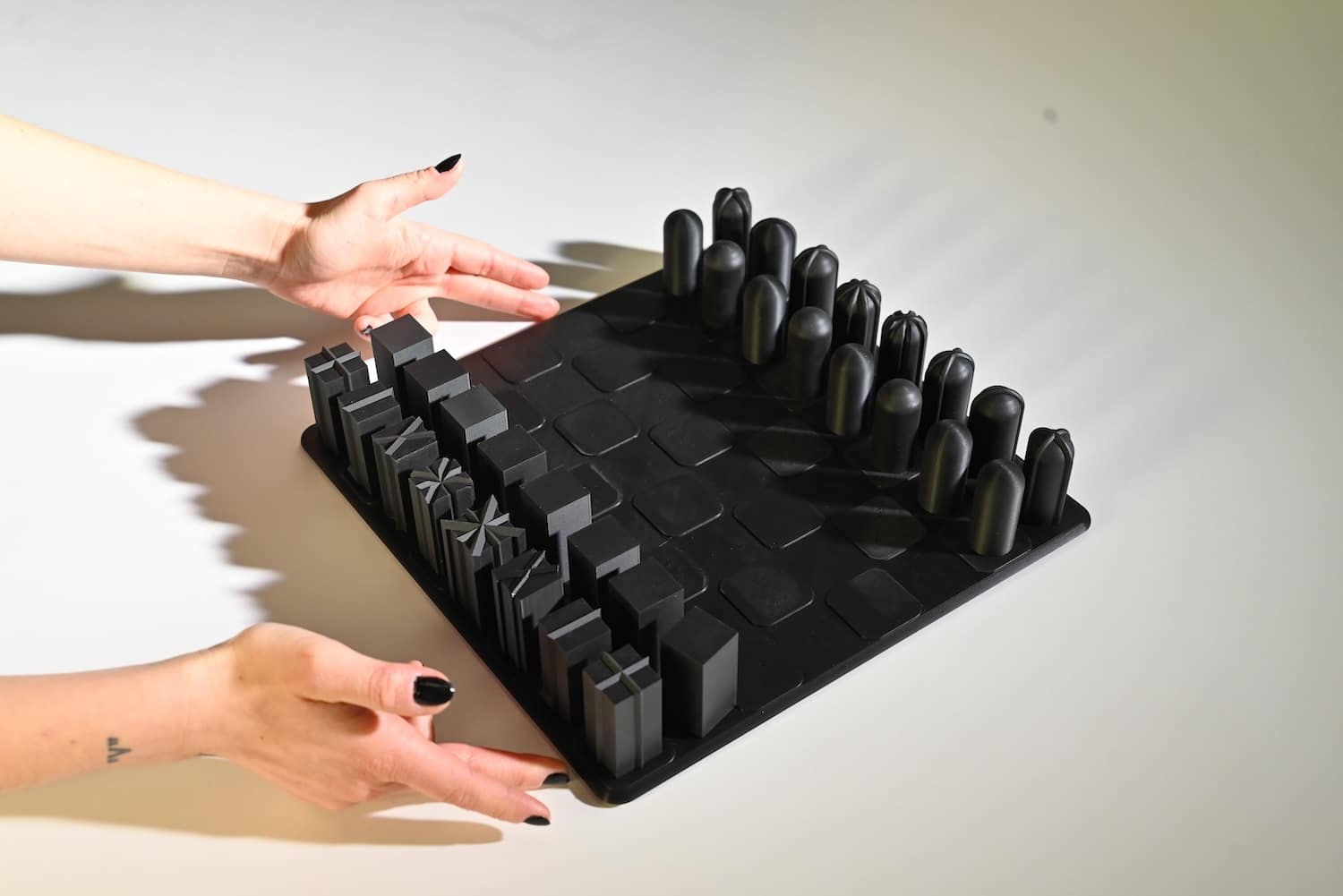 L’ensemble de la série, plateau compris, est réalisé en polymère noir mat. La surface des pièces présente une texture fine, caractéristique d’un procédé de fabrication additive en polyamide imprimée en 3d. Cette technique permet des volumes complexes, des cannelures profondes, des surfaces modulées selon l’axe de construction, sans moule ni contrainte de démoulage. Le résultat est dense, presque minéral. Les pièces tiennent dans la main avec un poids et une matité qui tranchent avec les jeux en bois verni ou en plastique injecté brillant que l’on connaît.