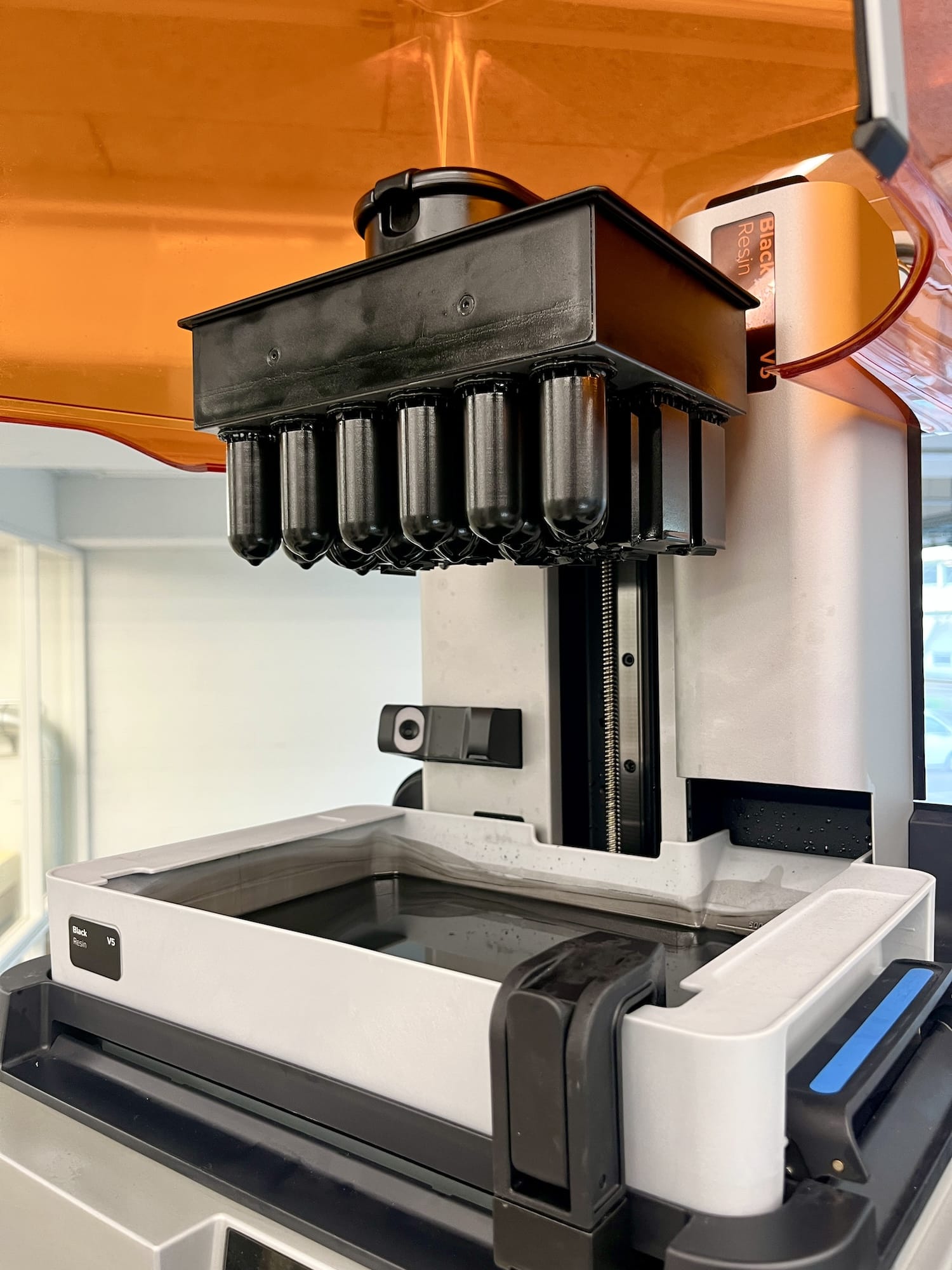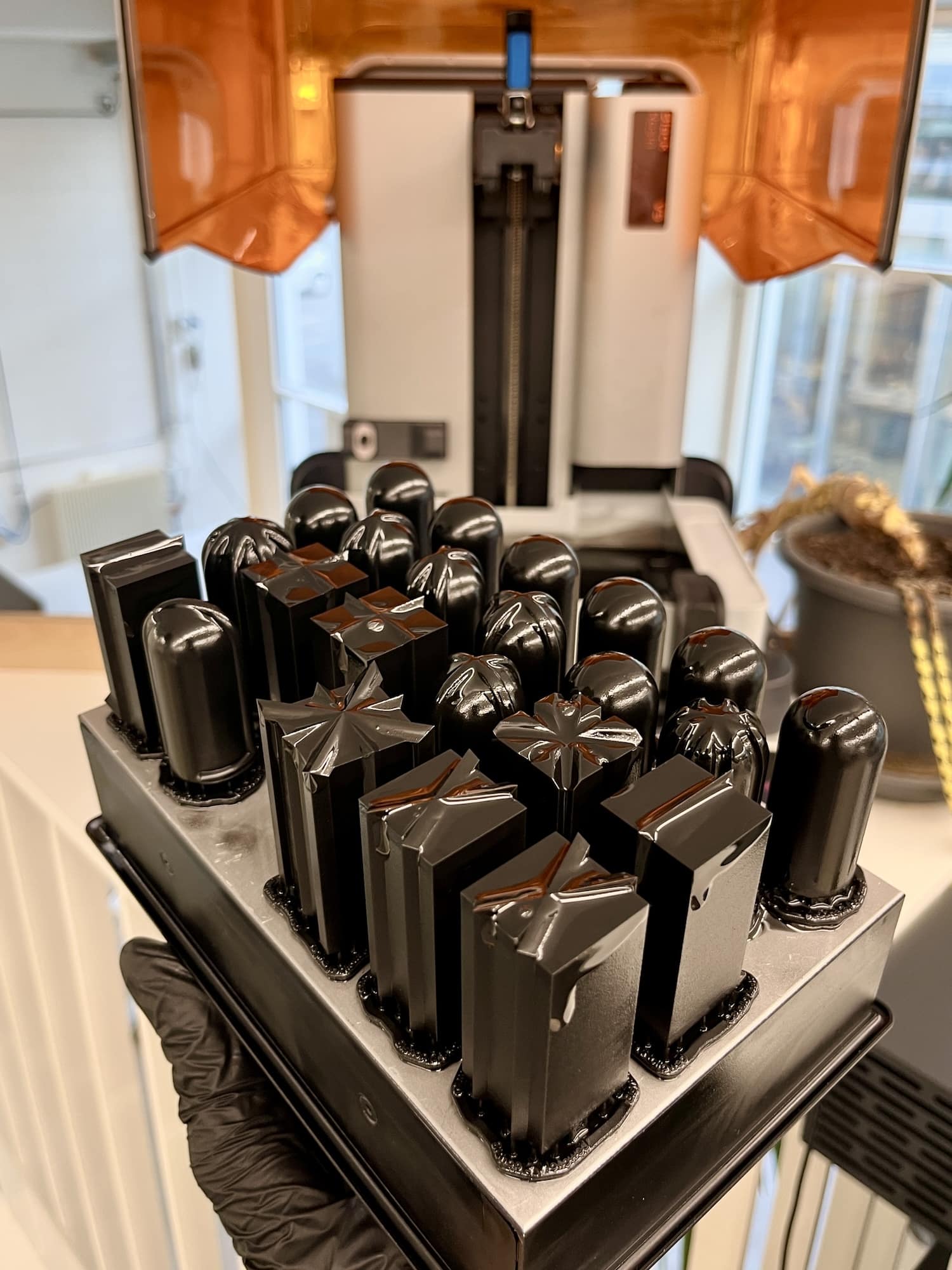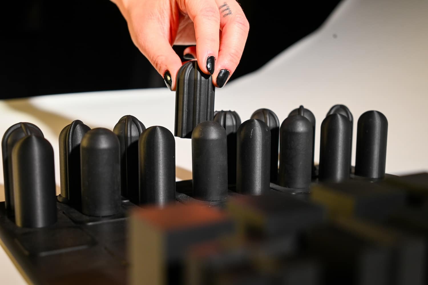 L’ensemble de la série, plateau compris, est réalisé en polymère noir mat. La surface des pièces présente une texture fine, caractéristique d’un procédé de fabrication additive en polyamide imprimée en 3d. Cette technique permet des volumes complexes, des cannelures profondes, des surfaces modulées selon l’axe de construction, sans moule ni contrainte de démoulage. Le résultat est dense, presque minéral. Les pièces tiennent dans la main avec un poids et une matité qui tranchent avec les jeux en bois verni ou en plastique injecté brillant que l’on connaît.