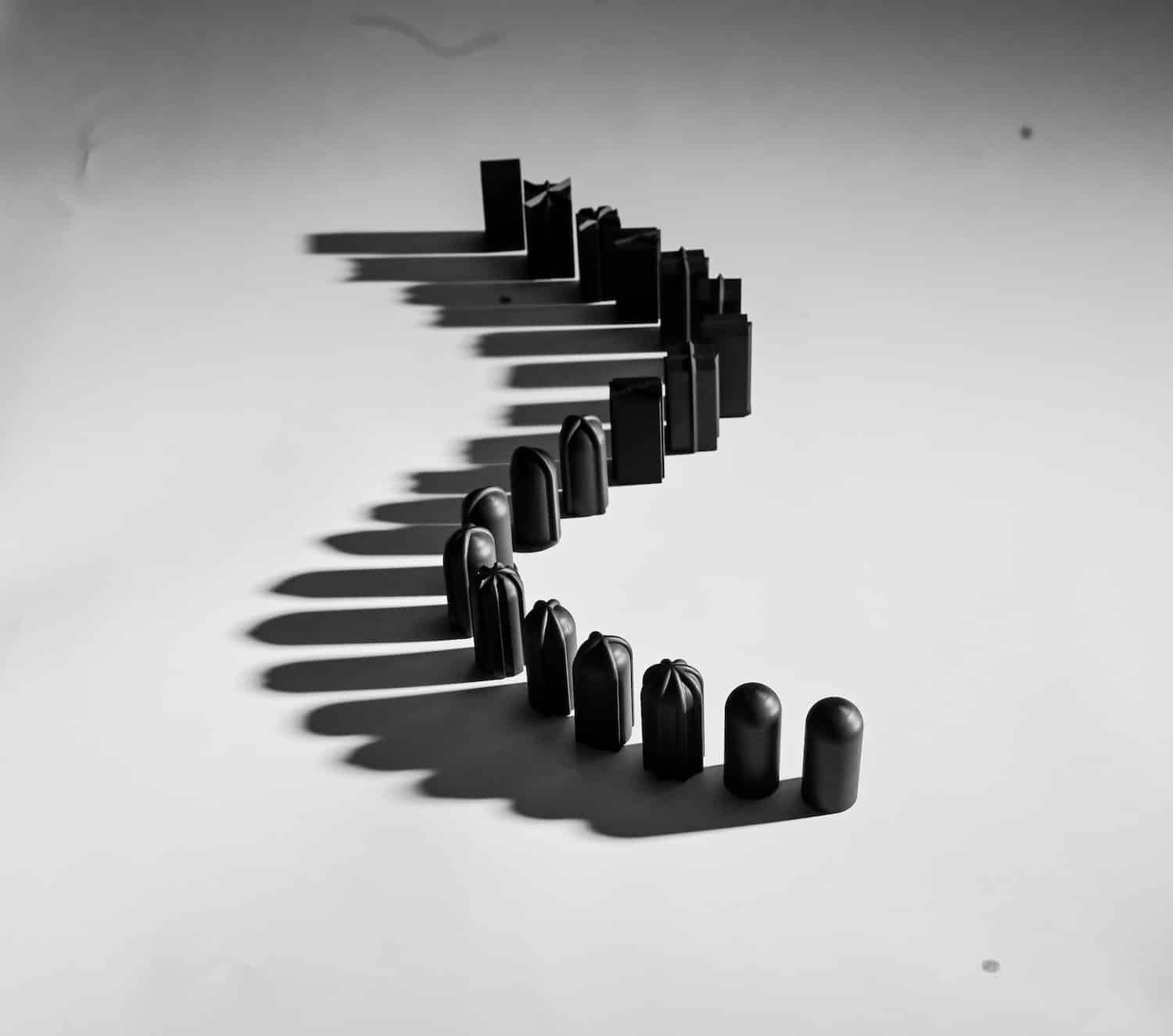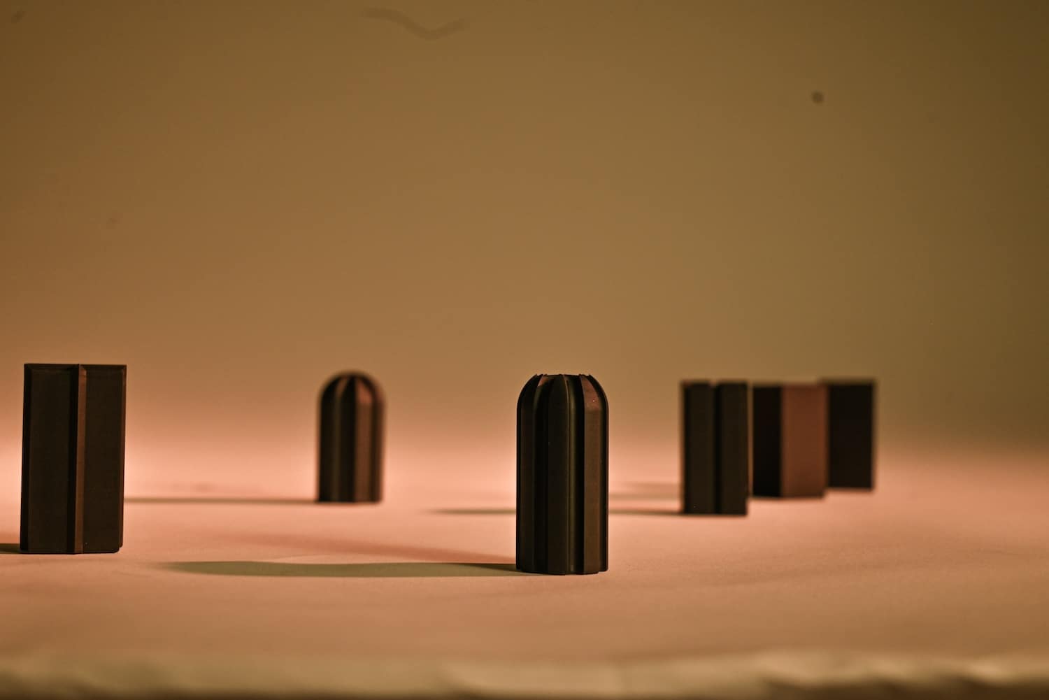 Chaque pièce est une déclinaison de cette géométrie fondatrice, selon les possibilités de mouvement qu’elle possède sur l’échiquier. Un pion, par exemple, dont le mouvement est simple et directionnel, a une forme sobre, allongée, fermée. Une reine, dont le mouvement est libre dans toutes les directions, porte une silhouette plus complexe, rayonnante, ouverte.