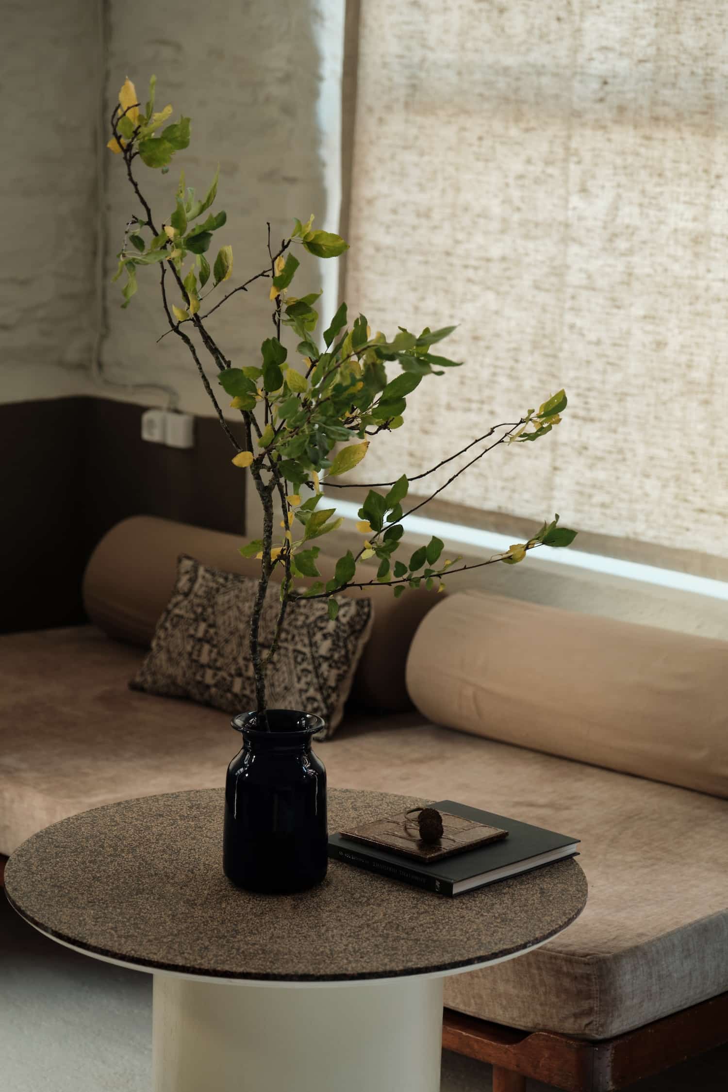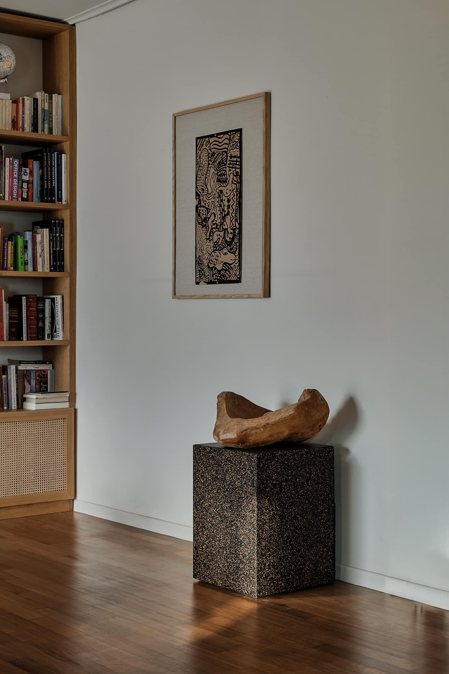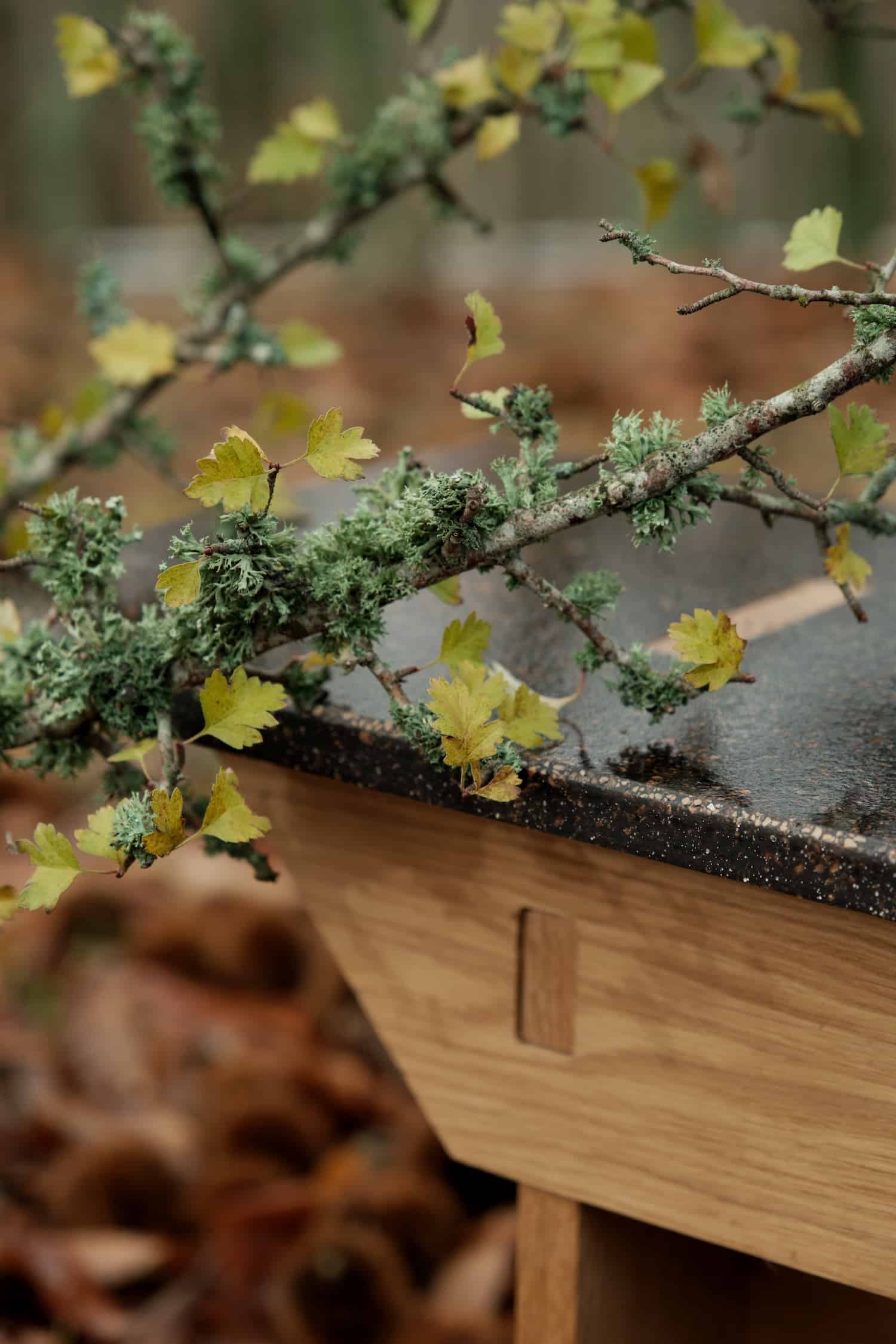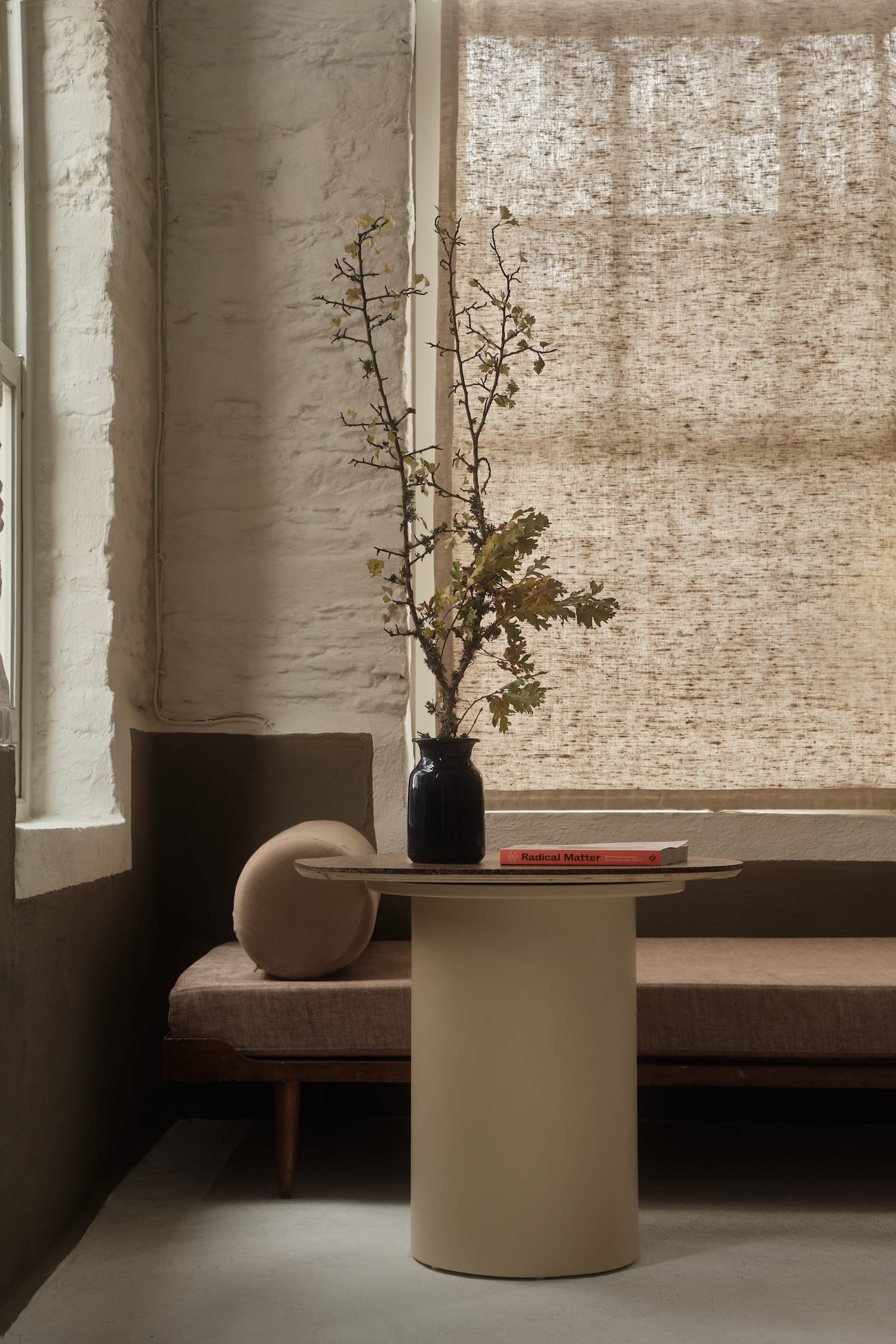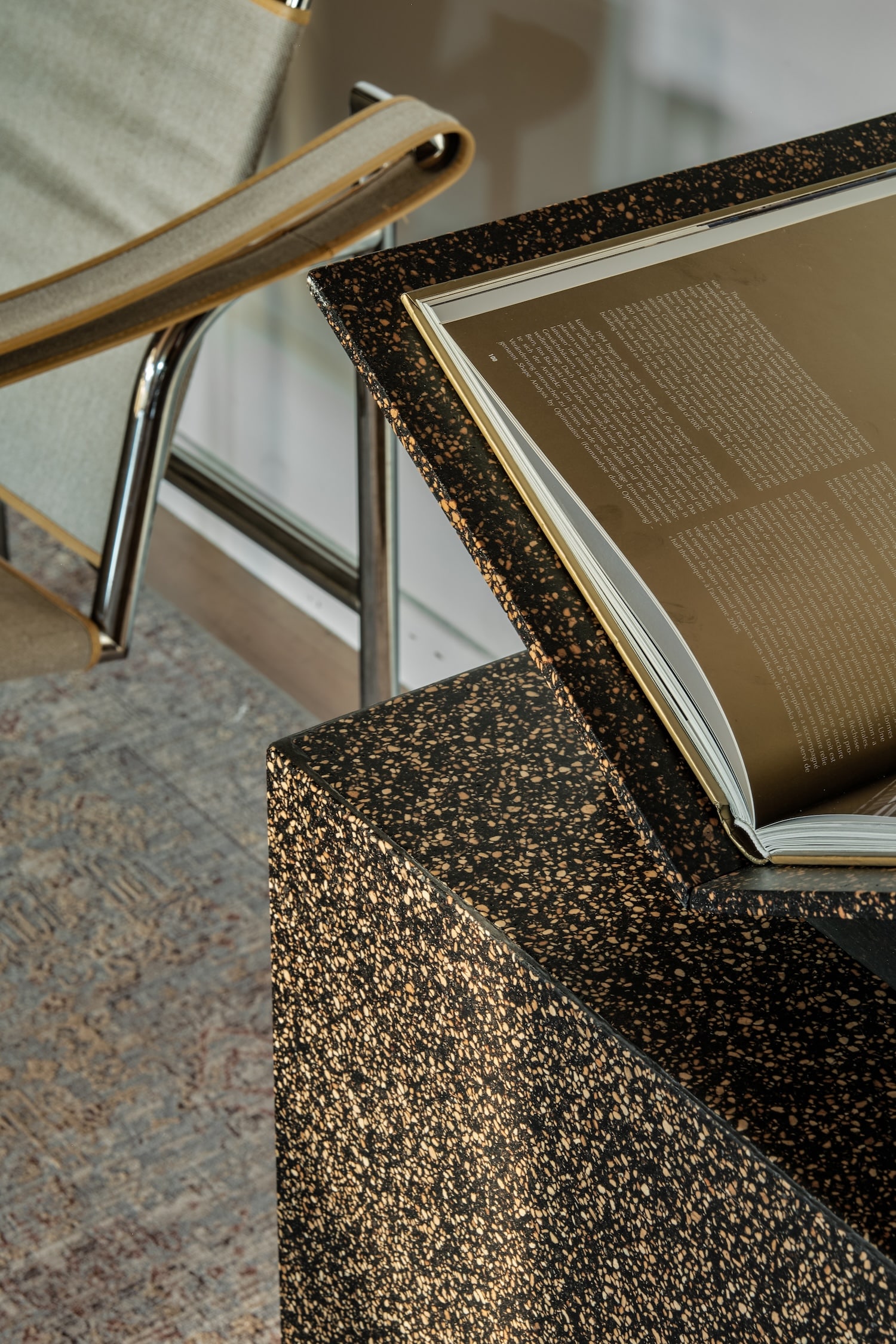 Le projet Koukoutsi Monolith pousse la logique matériau jusqu’à créer des volumes massifs monolithiques, évoquant visuellement la pierre tout en conservant la légèreté relative d’un composite biosourcé. Ces pièces fonctionnent comme tables d’appoint, chevets ou socles, leur aspect brut assumant pleinement la texture granuleuse du noyau d’olive compacté.