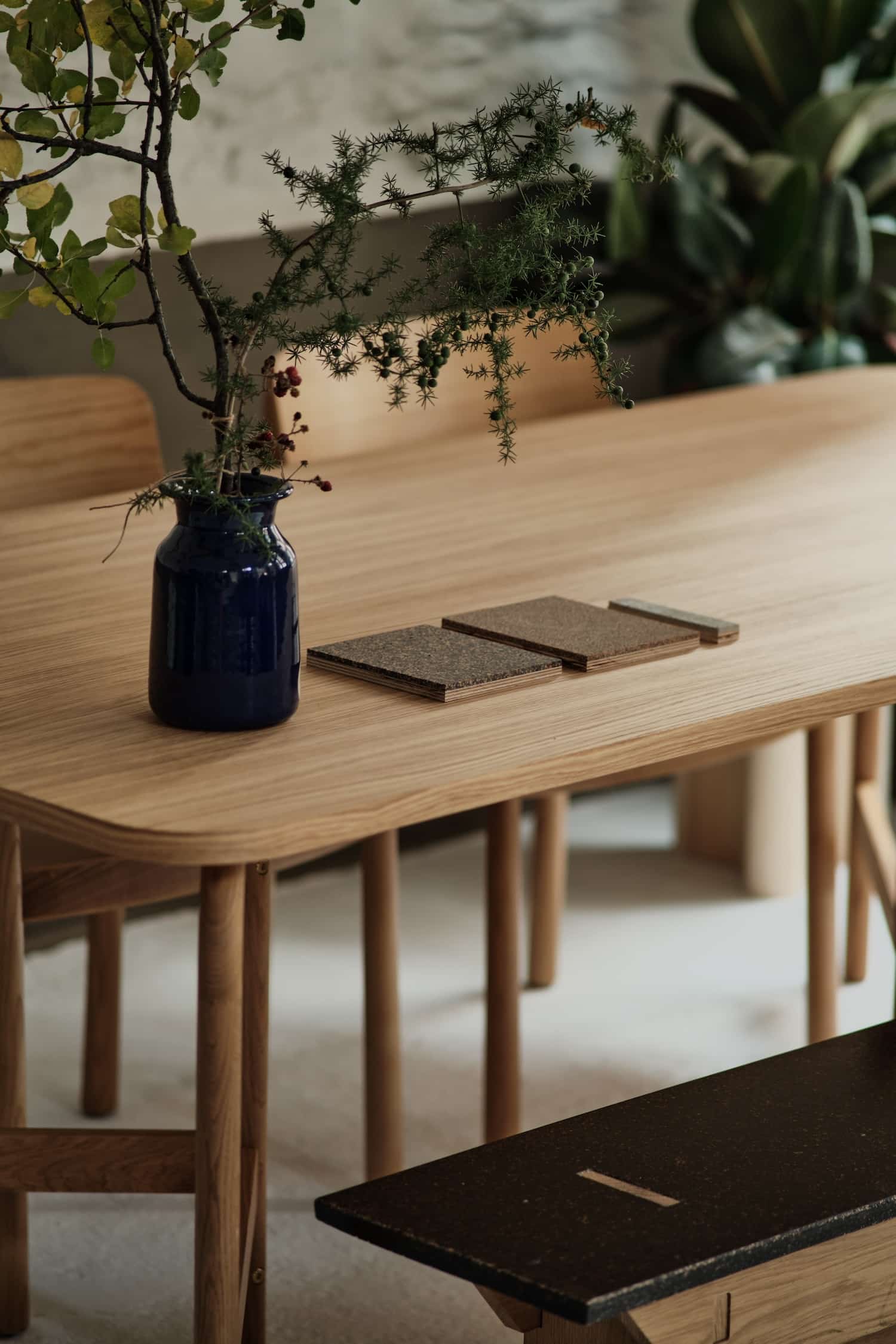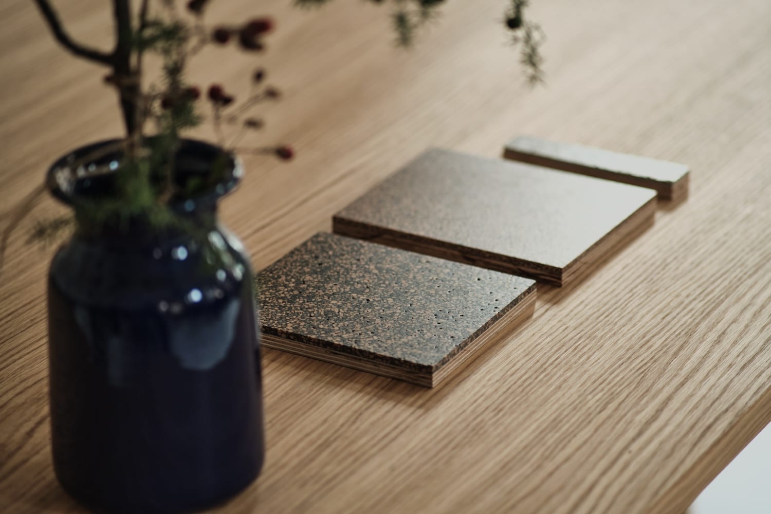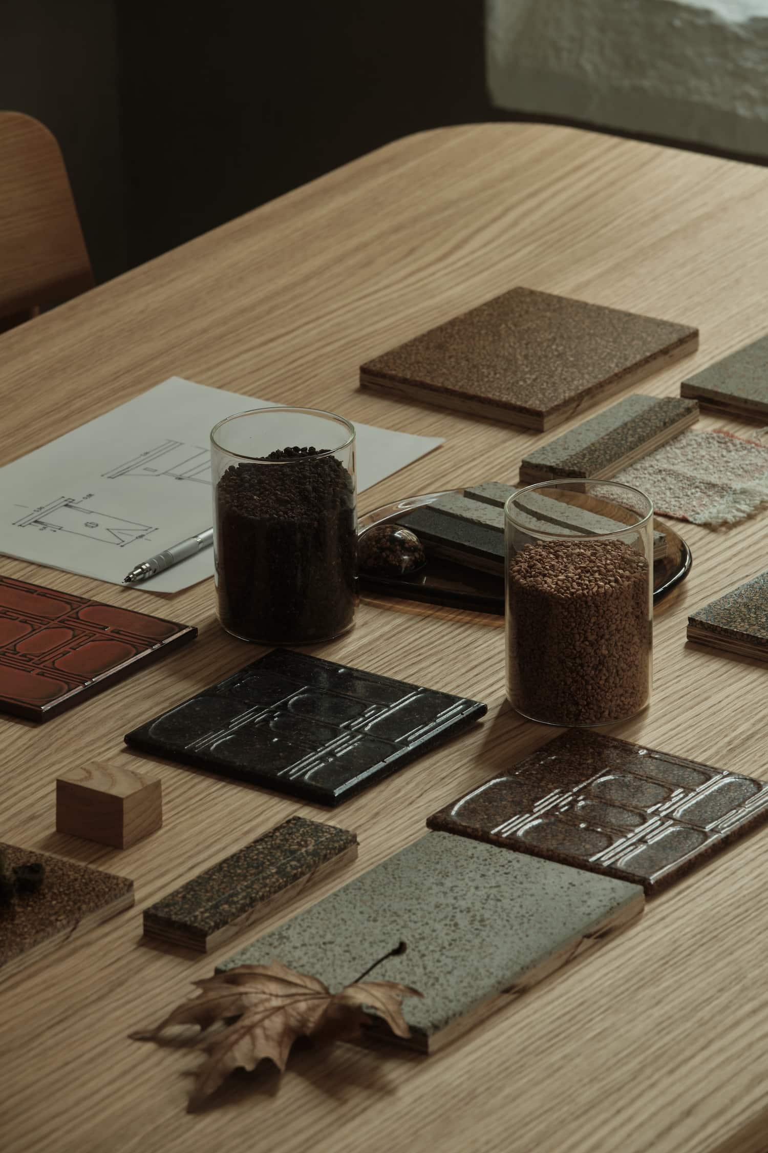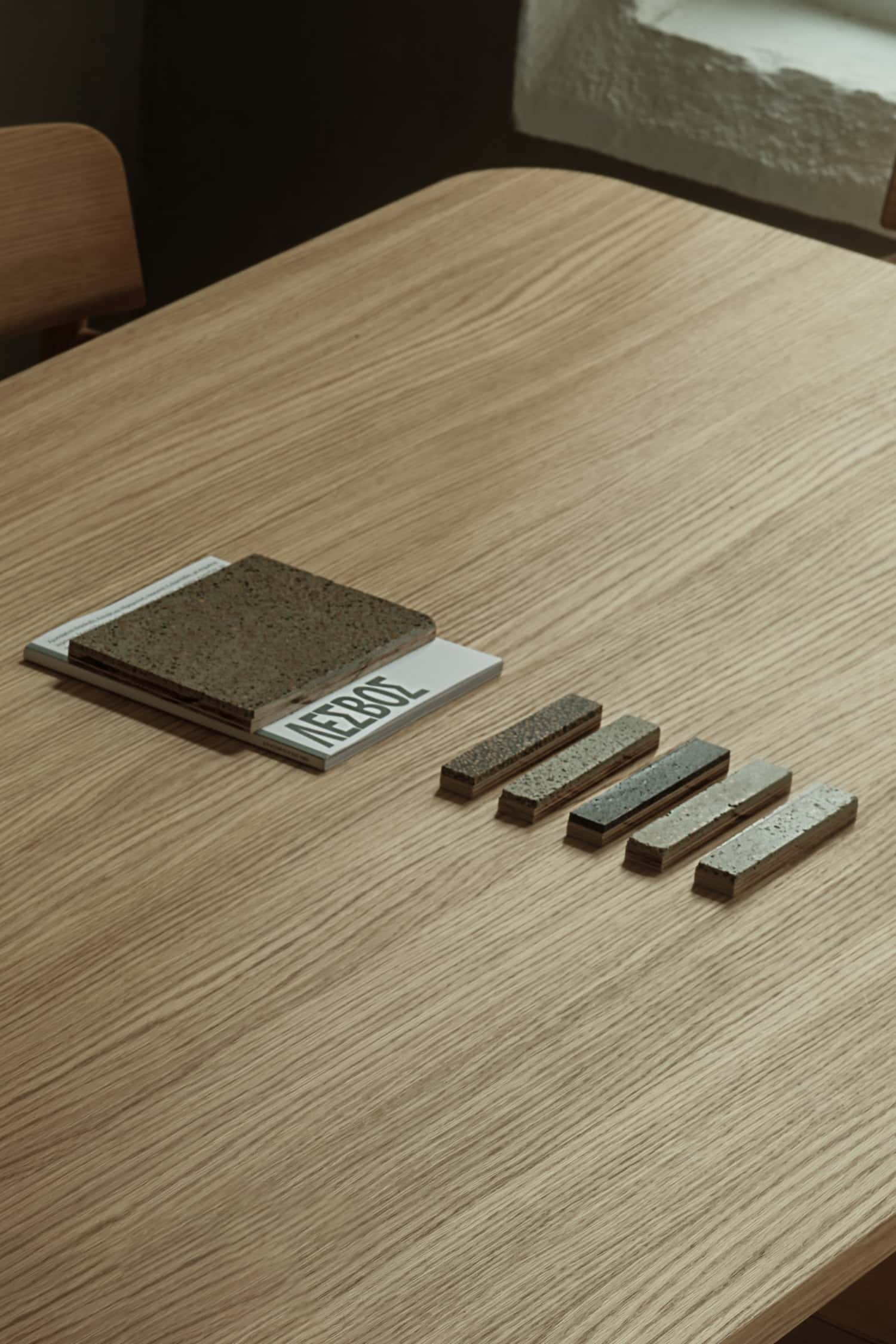 Le matériau baptisé Koukoutsi Eco-Material résulte d’un processus de compactage des noyaux d’olive issus de la trituration. Ces résidus, généralement brûlés comme combustible ou enfouis, sont ici transformés en panneaux de particules compactes qui évoquent visuellement la pierre ou le terrazzo.