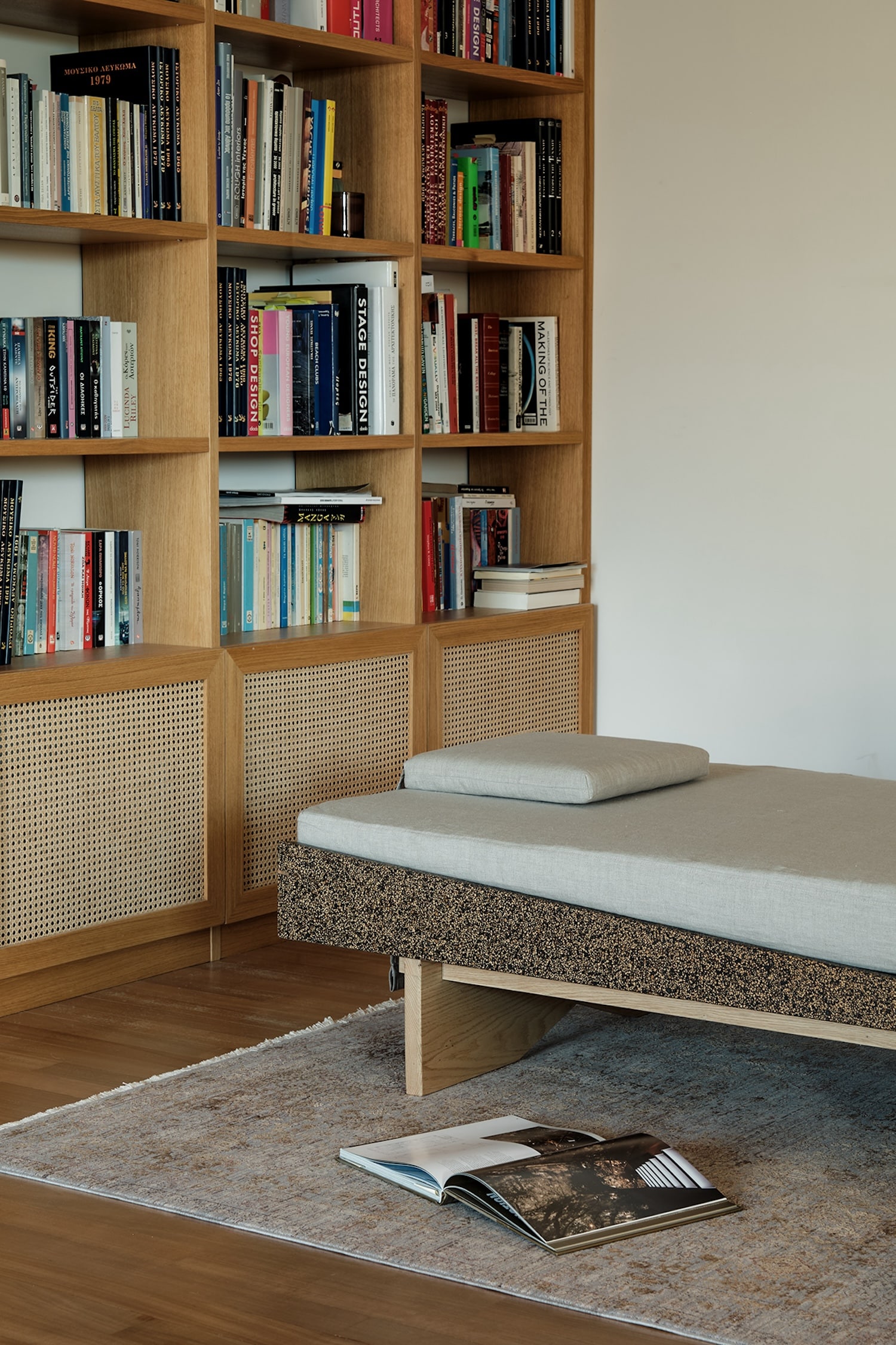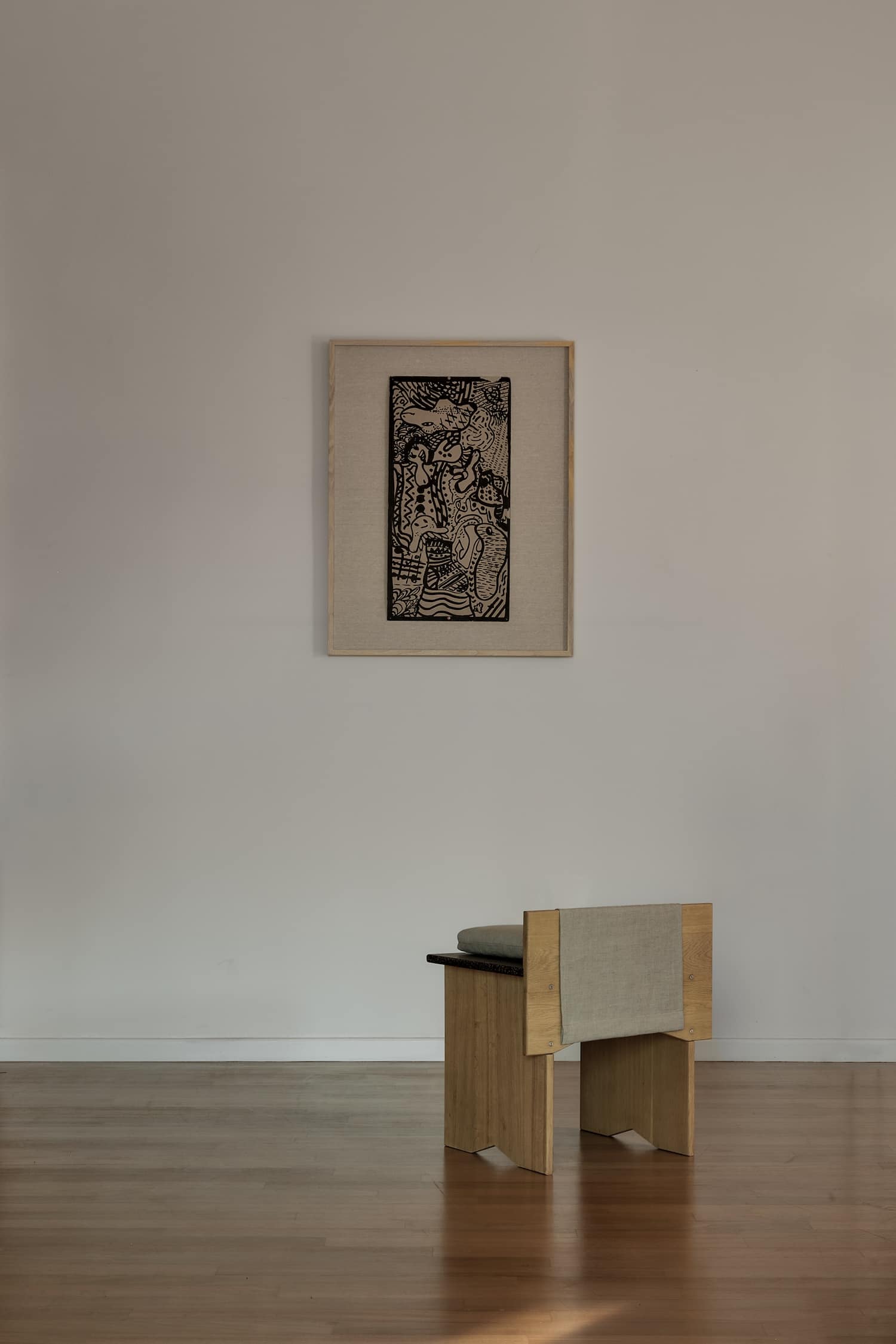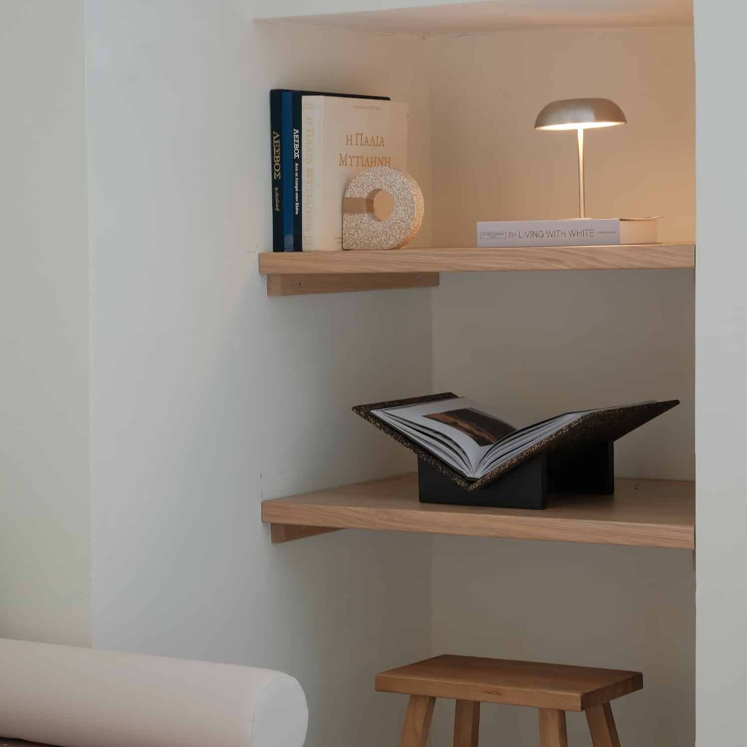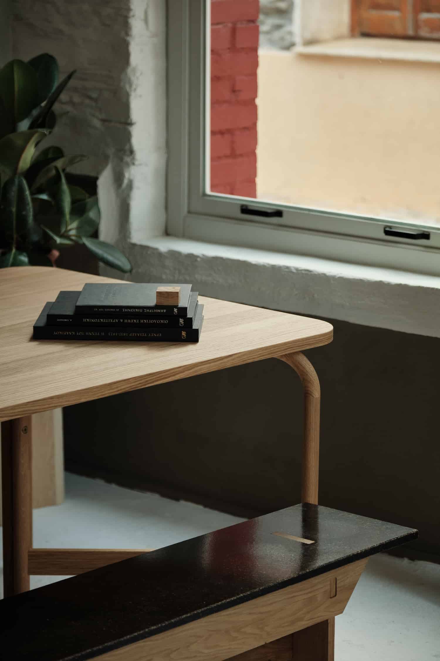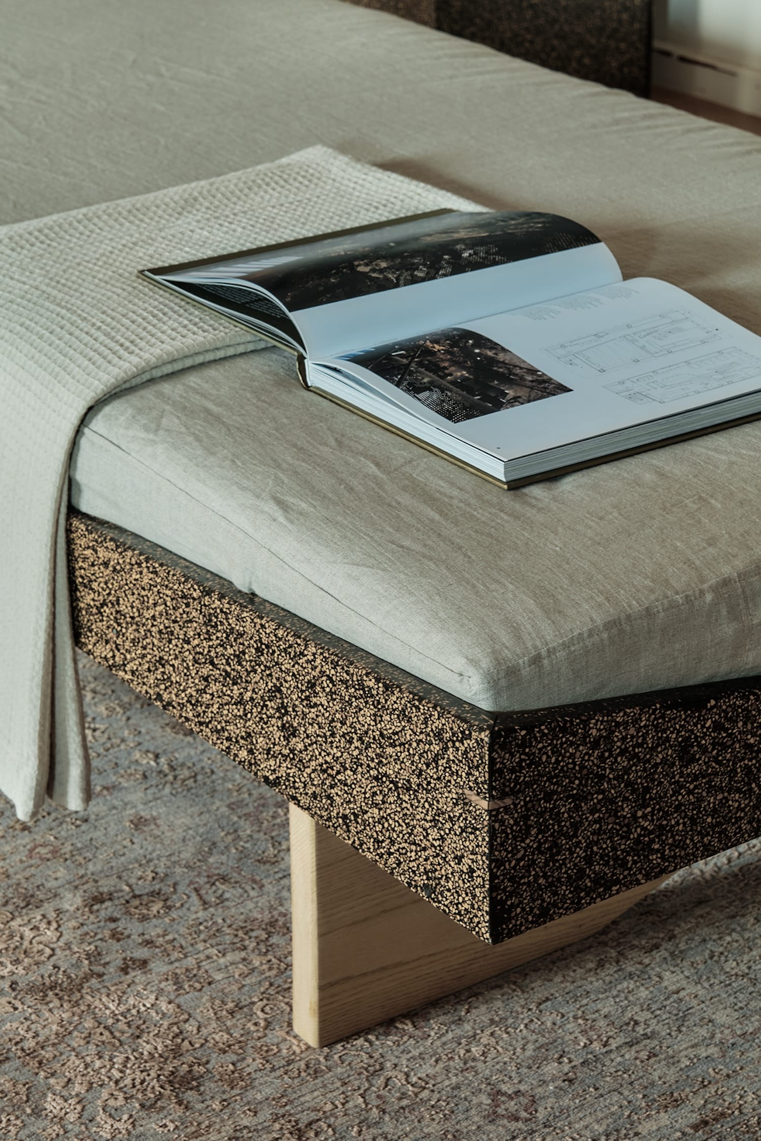 La collection développée par Koukos de Lab explore diverses typologies, du mobilier domestique aux équipements pour l’hôtellerie. Le banc Lesvos réinterprète les assises vernaculaires que l’on trouve traditionnellement dans les églises et cafés de l’île. La table Japanese Grid s’inspire des principes de clarté et de discipline formelle du design japonais, traduisant une grille structurelle en Koukoutsi. La collaboration avec Kimisoo a donné naissance à une collection limitée comprenant une méridienne, une chaise et une lampe, explorant la rencontre entre le matériau minéral et des textiles raffinés.