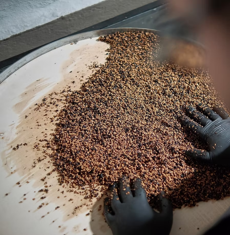 La texture granuleuse révèle la structure fragmentée des noyaux, créant une surface mouchetée qui oscille entre couleurs dorées et brunes selon les variétés utilisées. Le laboratoire propose deux déclinaisons chromatiques distinctes : Olive’s Blonde Pip pour les teintes claires, et Olive’s Dark Core pour les nuances plus sombres.