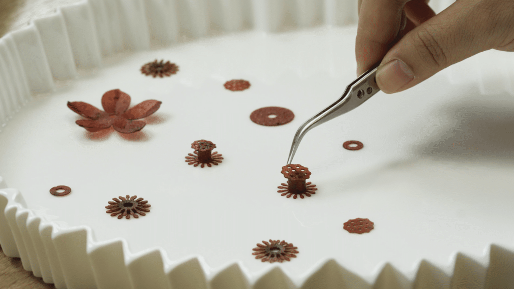Le design n’est pas qu’esthétique, il structure chaque étape du projet : de la forme du pétale à la scénographie immersive, en passant par l’intégration d’ingrédients naturels, végétaux et locaux. La matière comestible devient langage, mémoire et intention. Le coffret est à la fois objet et expérience, sculpture et récit.