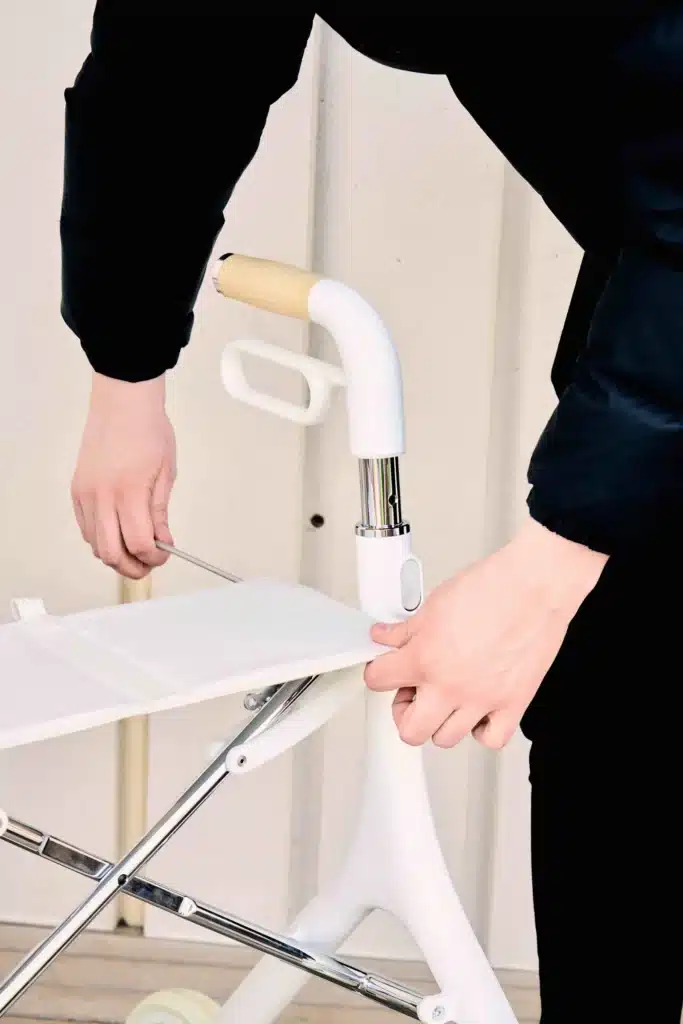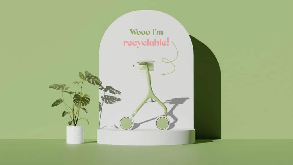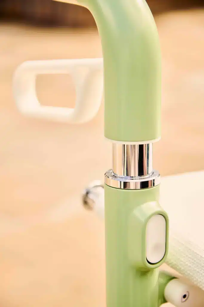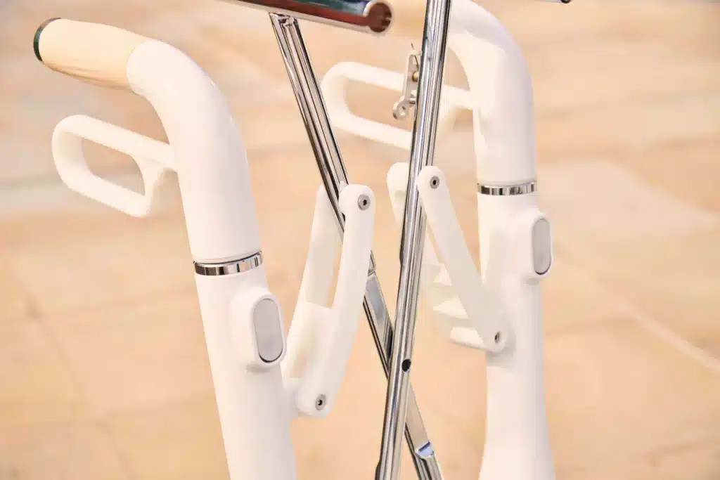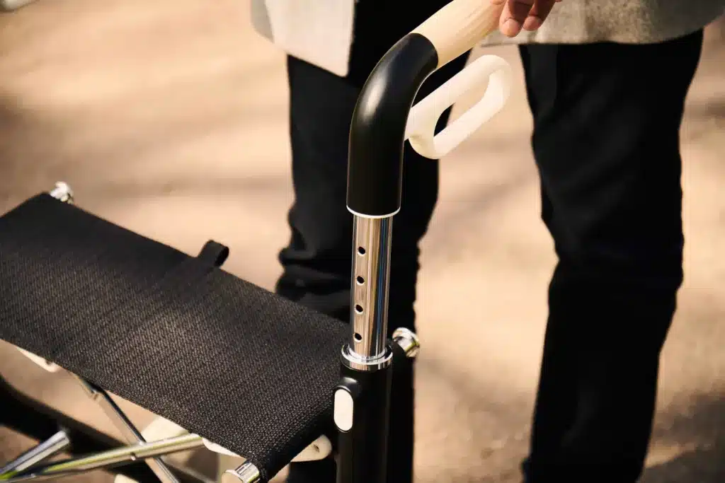 Le design circulaire trouve ici une illustration forte. Fabriqué à la commande dans l’atelier de Surrey (Royaume-Uni), le walker adopte des matériaux à impact réduit : aluminium aéronautique recyclable, plastiques recyclables, pièces remplaçables. Grâce aux trois clés Allen fournies, l’utilisateur peut démonter le produit, remplacer une pièce ou recycler chaque composant. Une démarche qui valorise la durabilité sans ostentation.